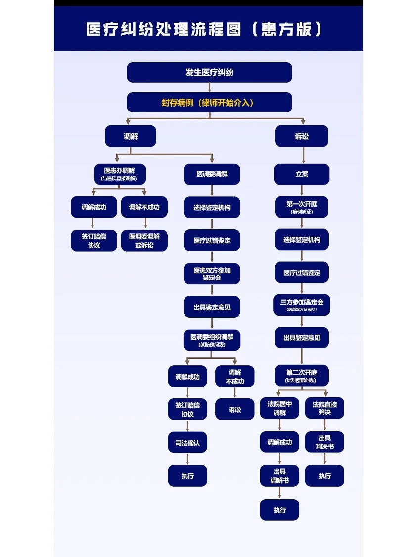 发生医疗纠纷,首先要做的就是到医院封存病例。 病例是医疗纠纷案件当中最重要的证据,证据保全的完整性对整个案件诉讼过程都至关重要。 第一时间封存病历,最大限度的避免医院篡改病历。病历保存在医疗机构医务人员手里,随时都有可能被更改甚至被篡改,即使患方事后明明知道病历被改过,但是由于没有或缺乏其他证据支持,患方主张医方改过病历的请求往往无法得到支持,甚至由于没有证据,又不同意按照医疗机构提供的病历进行鉴定,而导致败诉。 接着可以选择两个途径处理问题,一是调解,二是诉讼。 可以联系医院的医患办直接进行调解 这个手段可以由患者或者家属自行完成,不过不是特别好操作,因为医院都有医责险,可协商的范围是很小的。 医患双方共同委托医调委(医疗纠纷人民调解委员会)调解 医调委调节的性价比高,但是否调节成功,也是和医院具体的诊疗过失以及和损害结果的因果关系大与小存在关联。 诉讼 是不是选择诉讼也要结合到医院到底是否存在过错,以及过错和损害结果的因果关系。我们要理智的面对诉讼过程中的全部风险和可能性。