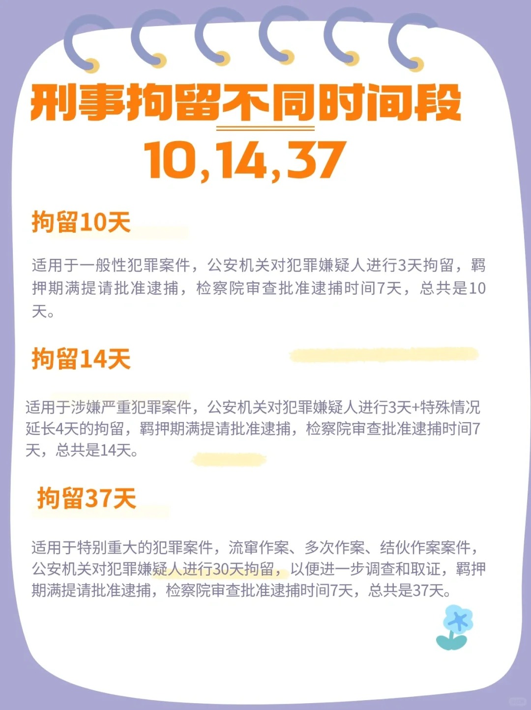 刑事拘留是指公安机关对犯罪嫌疑人或被告人采取的一种强制措施,家人被刑事拘留后,这几个时间点,大家可以了解下,这些期限在不同情况下有着不同的适用范围和操作规定,因为有些家属会选择等待观望,如果需要律师介入案件,会见当事人要早点处理。 一、拘留10天 适用于一般性犯罪案件,公安机关对犯罪嫌疑人进行3天拘留,羁押期满提请批准逮捕,检察院审查批准逮捕时间7天,总共是10天。 二、拘留14天 适用于涉嫌严重犯罪案件,公安机关对犯罪嫌疑人进行3天+特殊情况延长4天的拘留,羁押期满提请批准逮捕,检察院审查批准逮捕时间7天,总共是14天。 三、拘留37天 适用于特别重大的犯罪案件,流窜作案、多次作案、结伙作案案件,公安机关对犯罪嫌疑人进行30天拘留,以便进一步调查和取证,羁押期满提请批准逮捕,检察院审查批准逮捕时间7天,总共是37天。 有些案件公安机关在拘留后,侦查犯罪证据充分,会提前向检察院提请批准逮捕,如核准则逮捕,否则释放或变更强制措施。在公安侦查阶段,会有两次取保候审机会,家属错过时间,也就错过取保机会。 犯罪嫌疑人被拘留后一般会有以下三种处理情况 一、逮捕 对有证据证明有犯罪事实,可能判处十年有期徒刑以上刑罚的,或者有证据证明有犯罪事实,可能判处徒刑以上刑罚,曾经故意犯罪或者身份不明的,经检察院批准逮捕。 二、放人 公安在侦查过程中查明犯罪嫌疑人无犯罪事实,或者拘留期限届满对于犯罪嫌疑人犯罪证据不足的,就有可能会放人。 三、取保候审、监室居住 对犯罪嫌疑人社会危险性较小,符合取保候审条件的,但需要继续侦查的,可以采取取保候审、监室居住,变更强制措施。 刑事案件一定不用傻等,傻等下去就坐牢了,如果自己大家或家人面临刑事案件需要专业的律师处理,这边都可以为大家推荐全国优秀律师代理相关案件