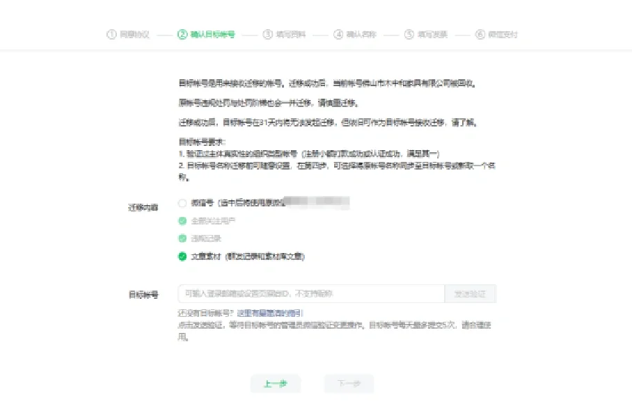 A公司公众号迁移到B公司(全部在电脑端操作) 第一步:登录原公众号-(右侧工作栏)设置与开发-公众号设置-(上方工作栏)账号详情-(向下滑动,倒数第二)主题信息-以下账号迁移按钮-迁移-公众号管理员微信扫描登录-微信点击同意迁移-查看所需迁移内容-输入目标账号(即要迁移到的公众号账号,如果没有,则需要临时注册一个,并完成微信认证(300元)后才能正常迁移;目标账号:设置开发-公众号设置-账号详情-(交叉)注册信息-原始ID为账号)-发送验证(管理员微信会收到验证,点击允许)-下一步-下载申请模板,填写信息,拍照上传-最重要也是最麻烦的一步是上传经过公证的证书。你需要到公证处办理公证。审核通过后,公证处将提供公证文件,届时您可以拍照上传;在网上搜索附近的公证处,打电话询问你需要带什么文件,以避免浪费行程。上传文件,在框中填写内容,进入下一步,检查名称(如果选错了,可以稍后更改,但重新认证和修改需要花费(300元)),填写发票信息,支付迁移费,完成,等待审查 我准备的公证文件仅供参考;(顺德大良公证处)需要预约! 1.法定代表人身份证复印件(加盖公章) 2.营业执照原件及复印件(加盖公章) 3、委托书(加盖公章,法定代表人签字)没有委托模板,明确委托谁办理xx公证 4.微信公众号移民申请书一式四份(先不盖章,在公证处工作人员面前签字盖章) 5、公司章程 6.公司印章 公众号管理员最好去那里扫码登录公众号 委托人身份证(两个不同的主体需要两个委托人,一个人不能同时是两家公司的委托人)