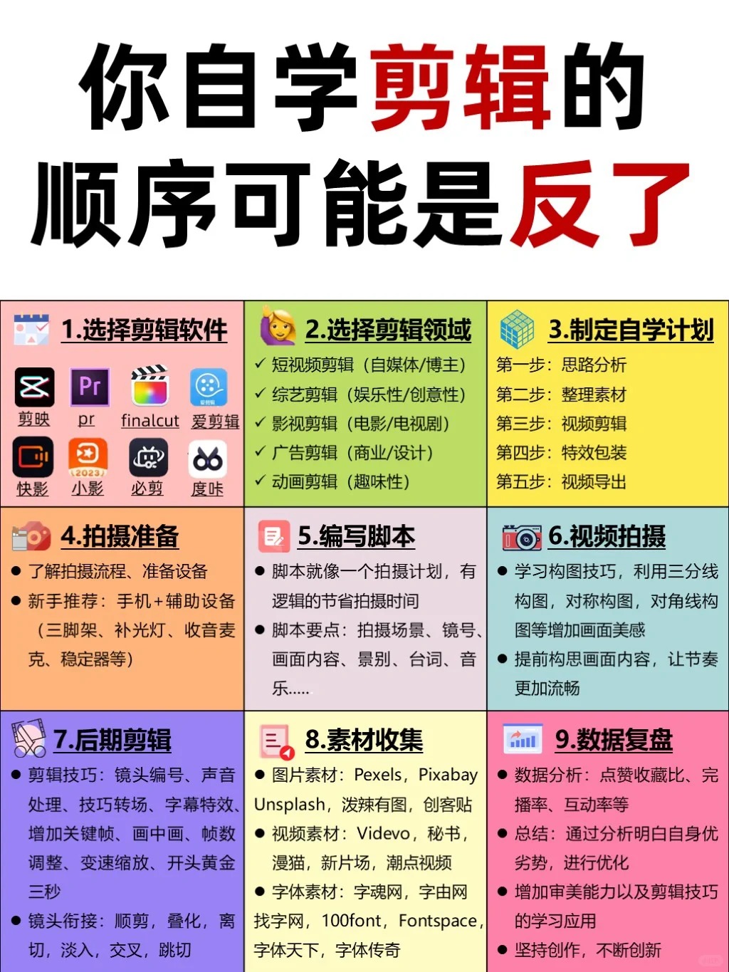 想学剪辑不知道怎么开始 记录的视频没逻辑,流水账 看别人可以剪辑搞钱羡慕不已 如果你学剪辑也有以上困扰,不如把这篇笔记看完,我帮你详细整理了剪辑的正确流程,以及一些自学技巧 1视频剪辑类型 2视频剪辑流程 3常用素材工具 4常用构图技巧
