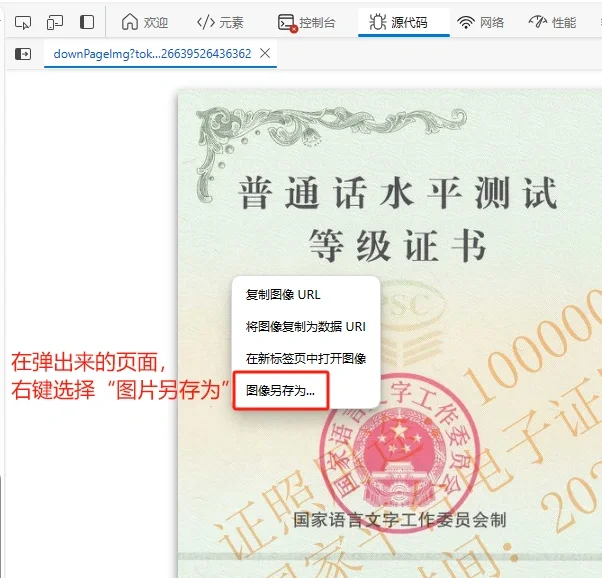1.使用边缘浏览器登录国家政务服务平台(gjzwfw.www.gov.cn),点击顶部和右侧的“统一许可服务”; 【其他浏览器原理相同,不再赘述】 2.往下拉,找到普通话证书; 3.右键单击并选择“检查”; 4.选择“网络”,然后点击普通话证书左侧的“查看详情”; 5.找到以downPageImg开头的行,该行有两行。任一行都很好,单击并右键单击; 6.选择第一行的“在源面板中打开”; 然后你的普通话证书将被加载!!右键单击保存jpg!!![乙方][乙方][乙方] 如果需要更高的清晰度,您可以使用上一张图片中的应用程序进行修复。 不幸的是,大水印无法移除,黑白打印的二维码也无法扫描。
