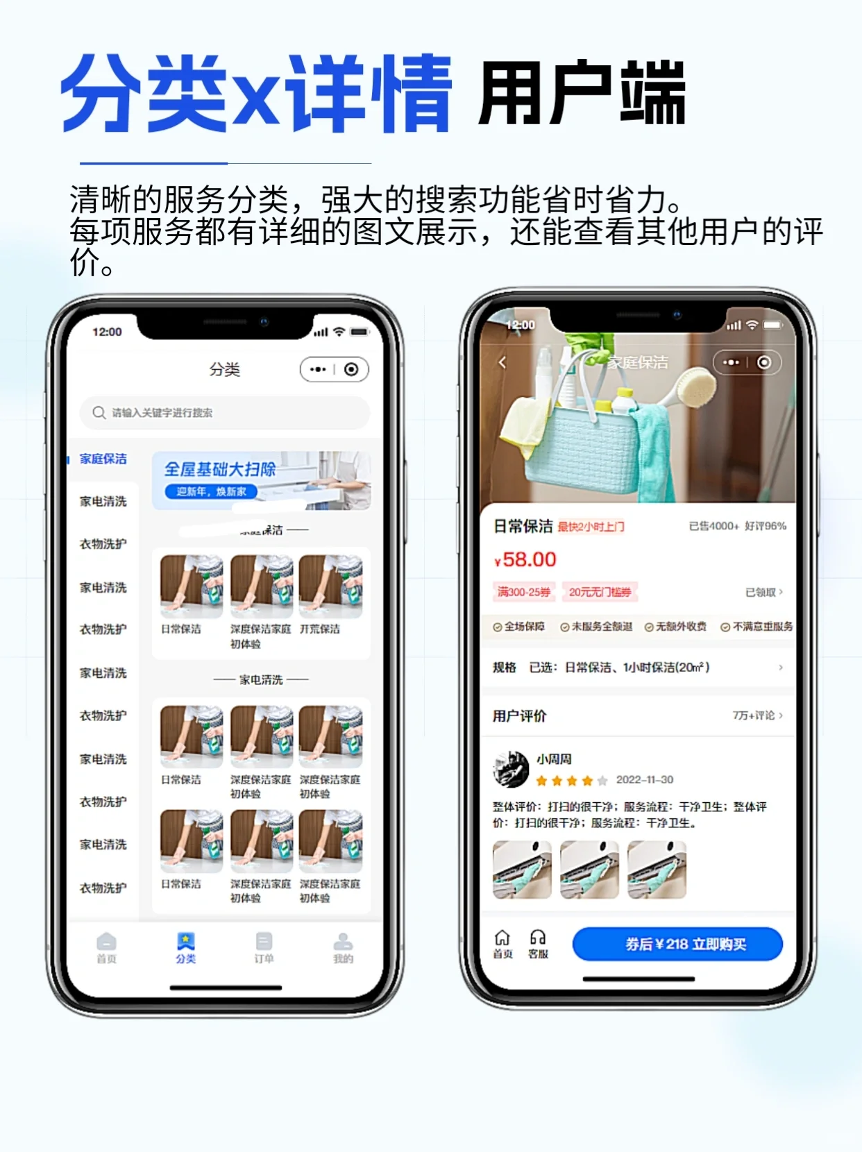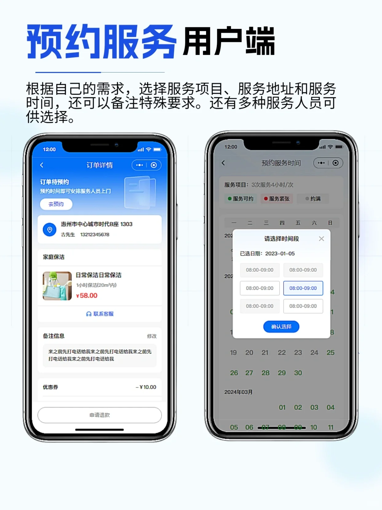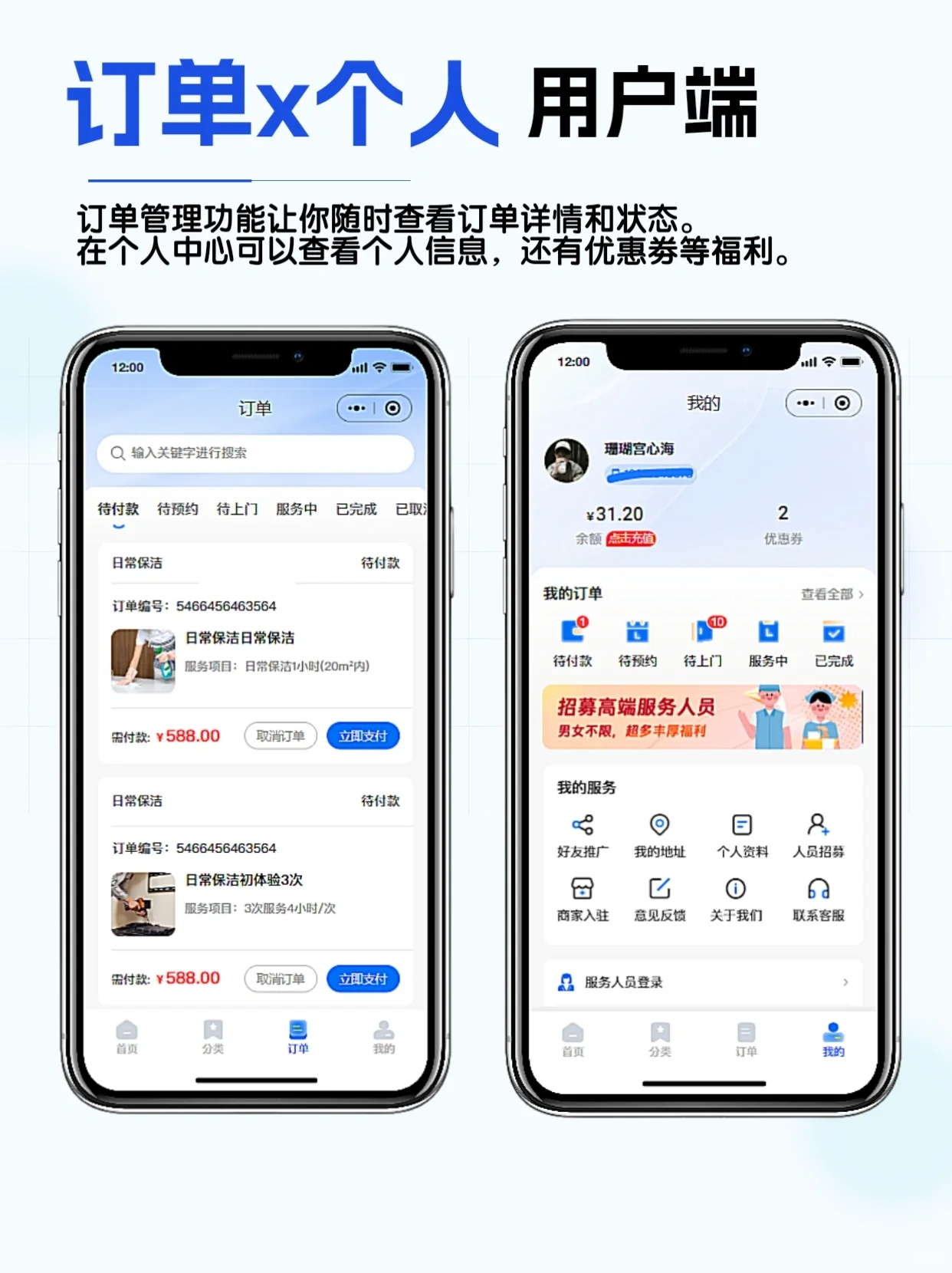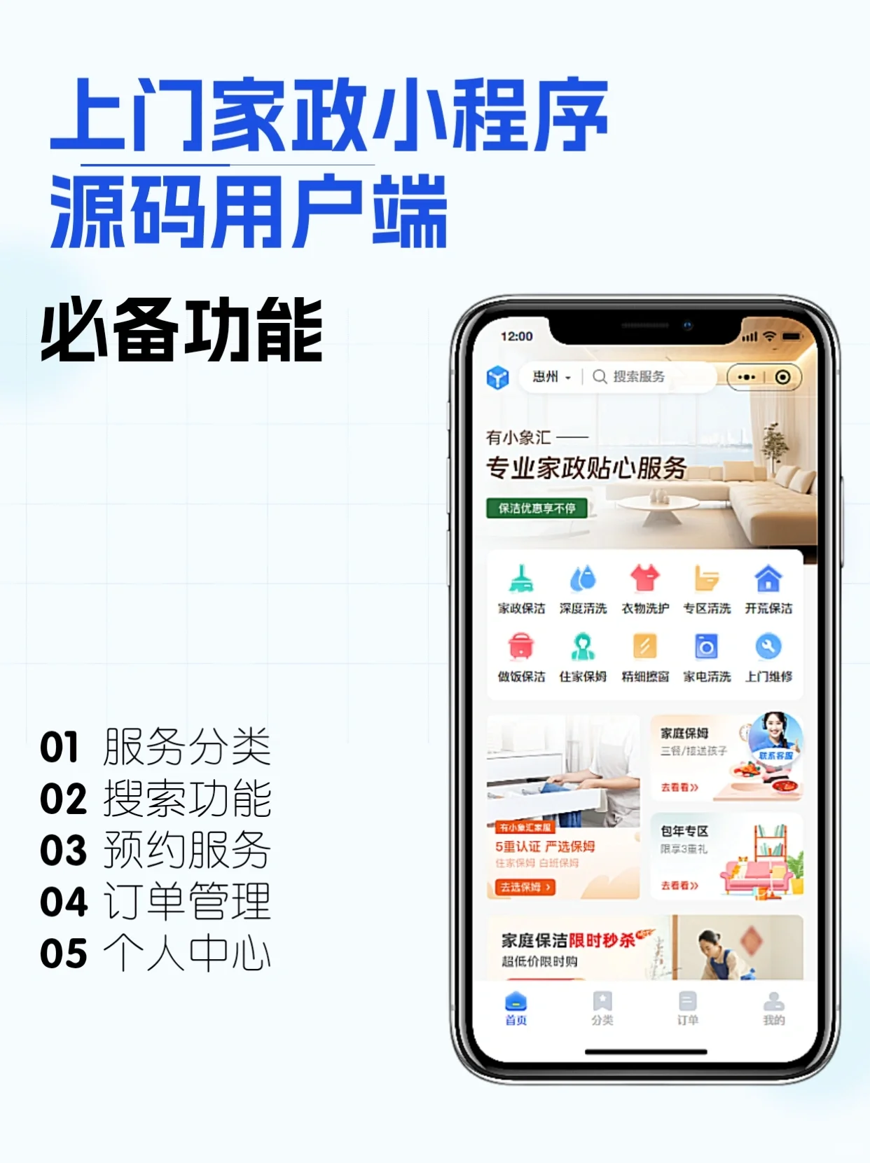 让您轻松管理家庭订单! ? 作为现代家庭寻求家庭服务的有力助手,家庭服务迷你程序的用户端具有多种功能。今天,让我们来揭示一下它需要具备哪些实用功能! ? 服务分类: 打开迷你程序,首先映入眼帘的是一个清晰的服务分类。每项服务都有详细的图形和文本显示,让您一目了然。您还可以查看其他用户的评论,帮助您选择最满意的家政服务! ? 搜索功能: 想快速找到您需要的服务吗?没问题!强大的搜索功能使您能够轻松找到所需的家庭服务,节省时间和精力。 ? 预约服务: 根据自己的需要,选择服务项目、服务地址、服务时间,也可以特别备注。有多种服务人员可供您选择,以满足不同的需求。一键支付,预约成功,等待上门服务人员上门服务。 ? 订单管理: 成功预约后,订单管理功能允许您随时查看订单详细信息和状态。如果有紧急情况需要取消,或者您对服务不满意并想要退款,您可以在这里轻松处理。 ? 个人中心: 在这里,您可以查看个人信息、积分信息、优惠券、订单信息等。一键操作,方便快捷。还有积分兑换和优惠券兑换等福利等待您领取,使您的家庭服务更具成本效益。