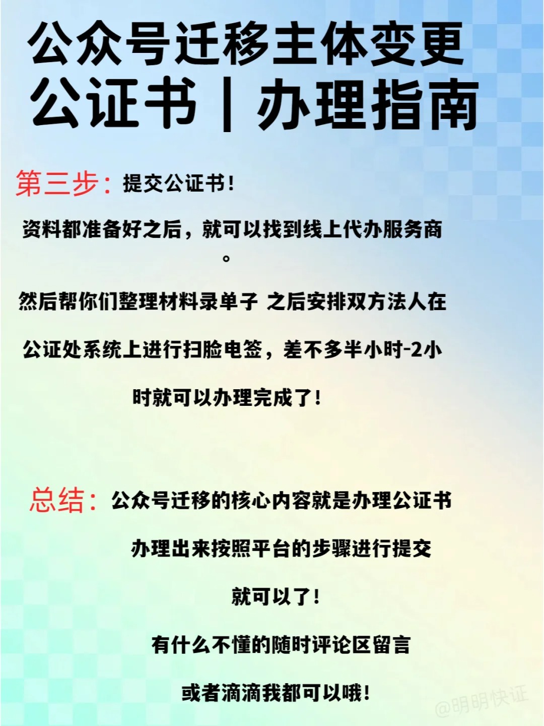 公众号迁移最重要的就是办理公证书,没有办理公证书你提交迁移 平台是通过不了的! 那今天给大家分享如何办理迁移公证!都在图上了! 有什么不懂的!可以联系平台客服。