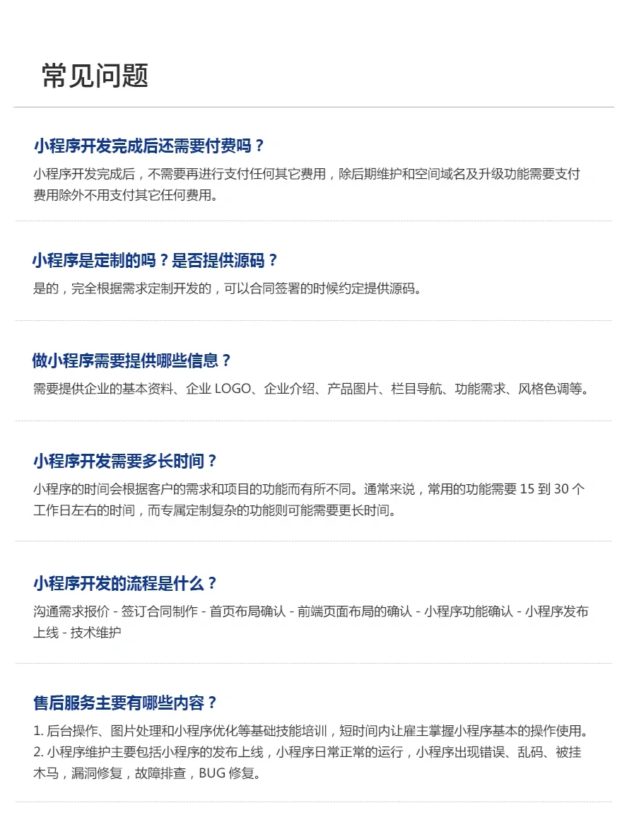 服务优势: (1) 全国各地客户认可的线上品牌服务商,国家高新技术企业 (2) 15年专业品牌积累,实体公司,经验丰富,质量和效果令人满意。 (3) 一支由60多人组成的技术开发团队,拥有专业的高校设计师和全栈技术工程师。 (4) 这里有众多的服务案例和更广泛的服务行业,让您的选择更令人放心。 (5) 定制化设计服务,需求分析功能排序,项目进度实时顾问式跟踪。 (6) 自主研发,W3C标准认证,行业安全测试,提供原创设计开发源代码。 (7) 技术指导和培训说明使您更容易使用。 客户需要提供的材料: 小程序的功能要求、需要提供的小程序部分、徽标、一些公司内容介绍和产品图片、风格参考等。我们的开发团队将在2-3天内为您提供主页的初稿,然后是每个子页面的效果图。接下来,我们将进行前端和后端开发工作,以确保每个功能都符合您的期望。项目完成后,可以同时进行小程序注册、小程序证书购买、域名和服务器购买等服务,并需要合作提供信息。 服务报价: 尊敬的客户,由于每个客户都有不同的需求,我们需要详细沟通您的需求。如果您需要准确的报价来满足您的需求,您可以私下给我们发消息,我们会安排专业顾问与您协调,为您提供最准确、最合适的报价。 项目开发过程: 项目需求对接沟通→ 功能方案排序→ 项目报价→ 合作确认和合同签订→ 页面设计阶段→ 前端开发阶段→ 前端接口对接和程序开发阶段→ 在线测试→ 验收及售后服务 售后技术支持保障: 1.热线服务:维修服务人员通过热线电话回答技术问题的过程。 2.远程维护服务:通过远程维护系统对软件进行远程调试的过程。