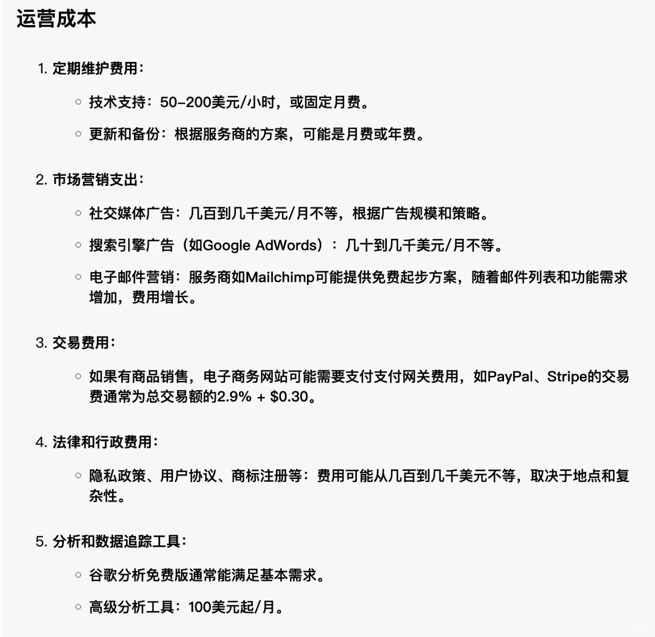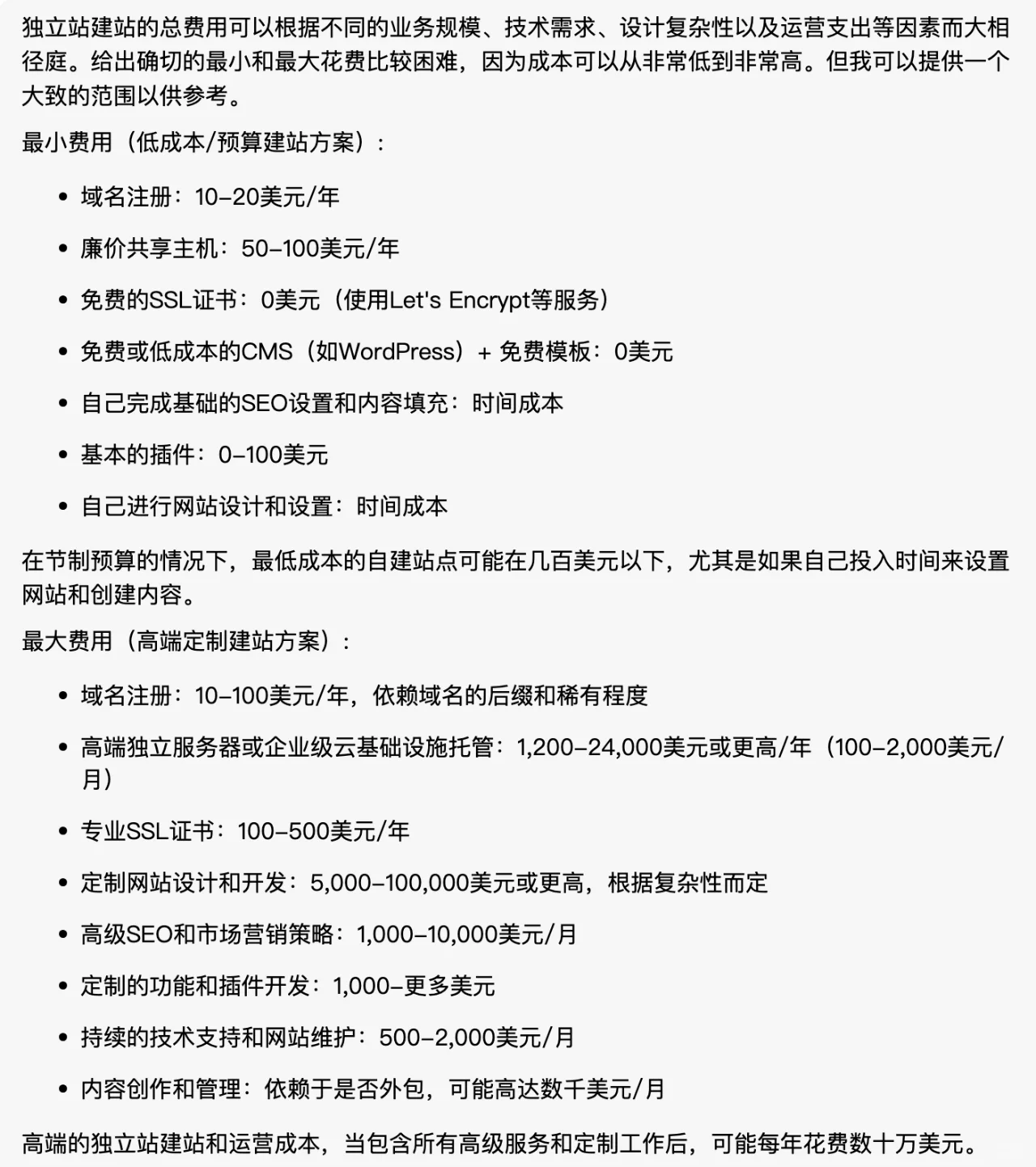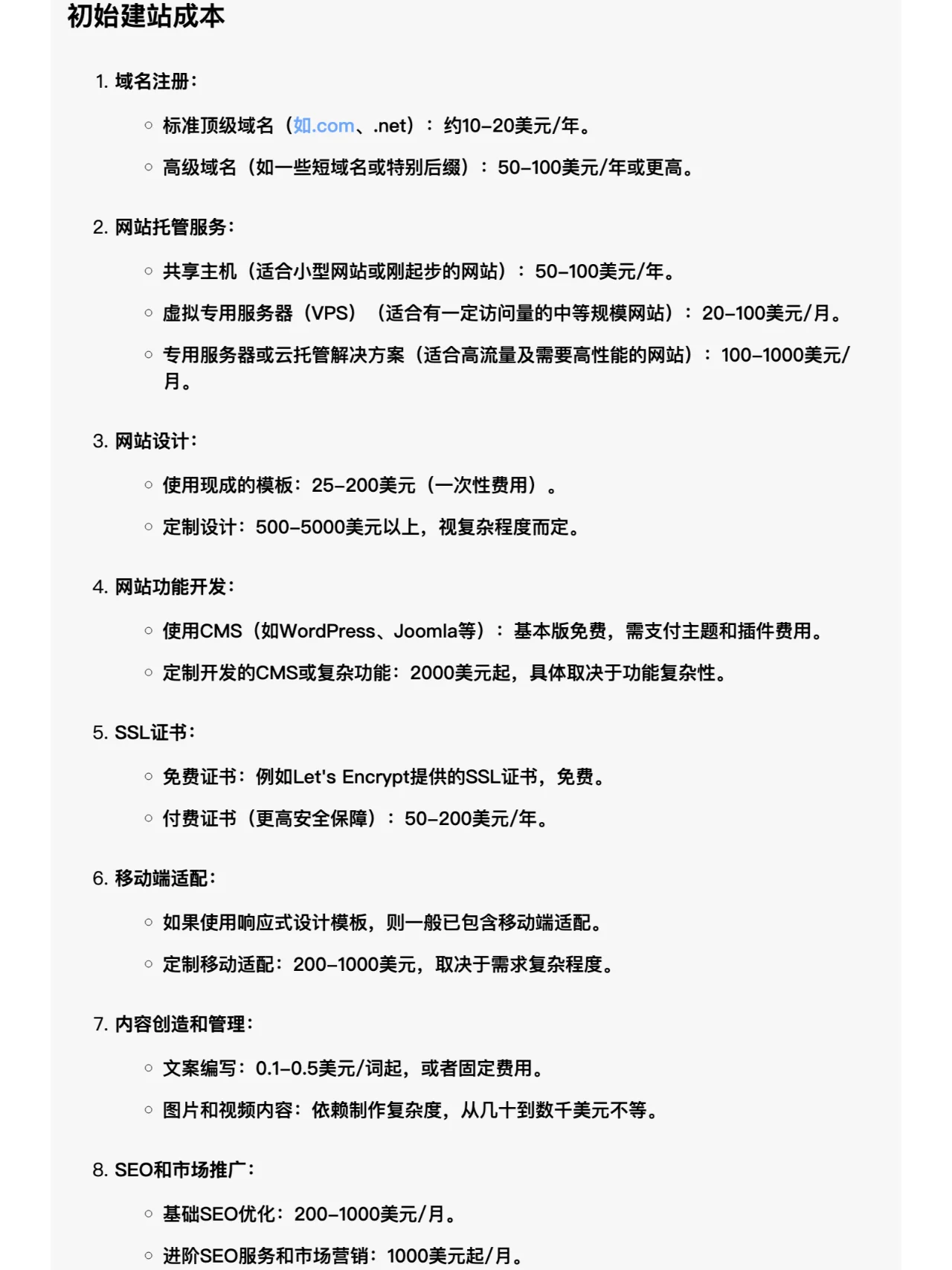建造独立车站的总成本可能因业务规模、技术要求、设计复杂性和运营费用等因素而异。很难提供精确的最小和最大成本,因为成本可能在非常低到非常高的范围内。但你可以提供一个粗略的范围供参考。 最后一个有好处 最低成本(低成本/预算车站建设计划): 域名注册:每年10-20美元 廉价共享主机:每年50-100美元 免费SSL证书:$0(使用Let's Encrypt等服务) 免费或低成本的CMS(如WordPress)+免费模板:$0 自行完成基本SEO设置和内容填充:时间成本 基本插件:0-100美元 设计和建立自己的网站:时间成本 在预算限制下,成本最低的自建网站可能不到几百美元,尤其是如果你在网站设置和内容创建方面投入时间的话。 最高成本(高端定制网站建设计划): 域名注册:每年10-100美元,取决于域名的后缀和稀有程度 高端独立服务器或企业级云基础设施托管:每年1200-24000美元或更高(每月100-2000美元) 专业SSL证书:每年$100-500美元 定制网站设计和开发:5000美元-100000美元或更高,具体取决于复杂性 高级SEO和营销策略:每月1000美元至10000美元 自定义功能和插件开发:1000美元-更多 持续的技术支持和网站维护:每月500-2000美元 内容创建和管理:根据是否外包,每月可能达到数千美元 高端独立网站,主要是高端C端定制网站的建设和运营成本,在包括所有高级服务和定制工作后,每年可能花费数十万美元。