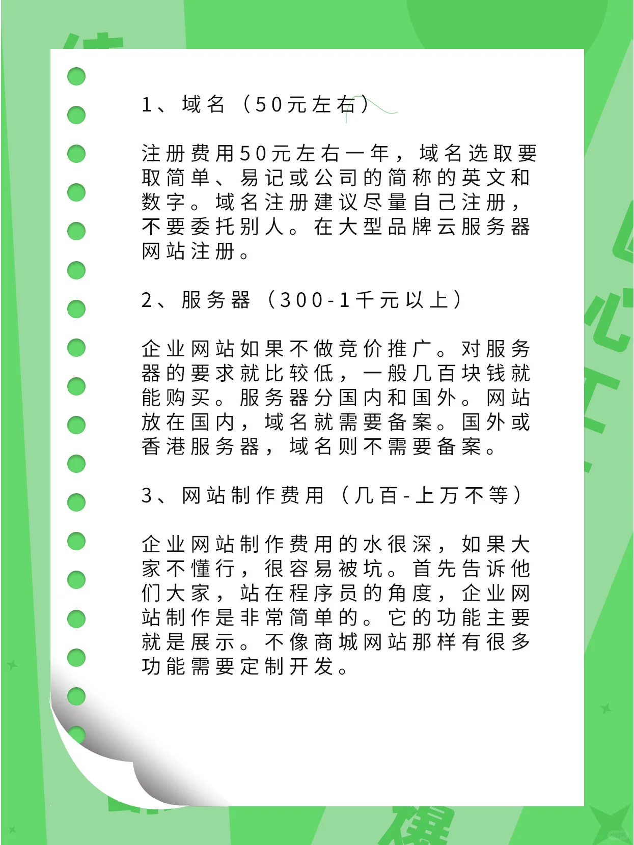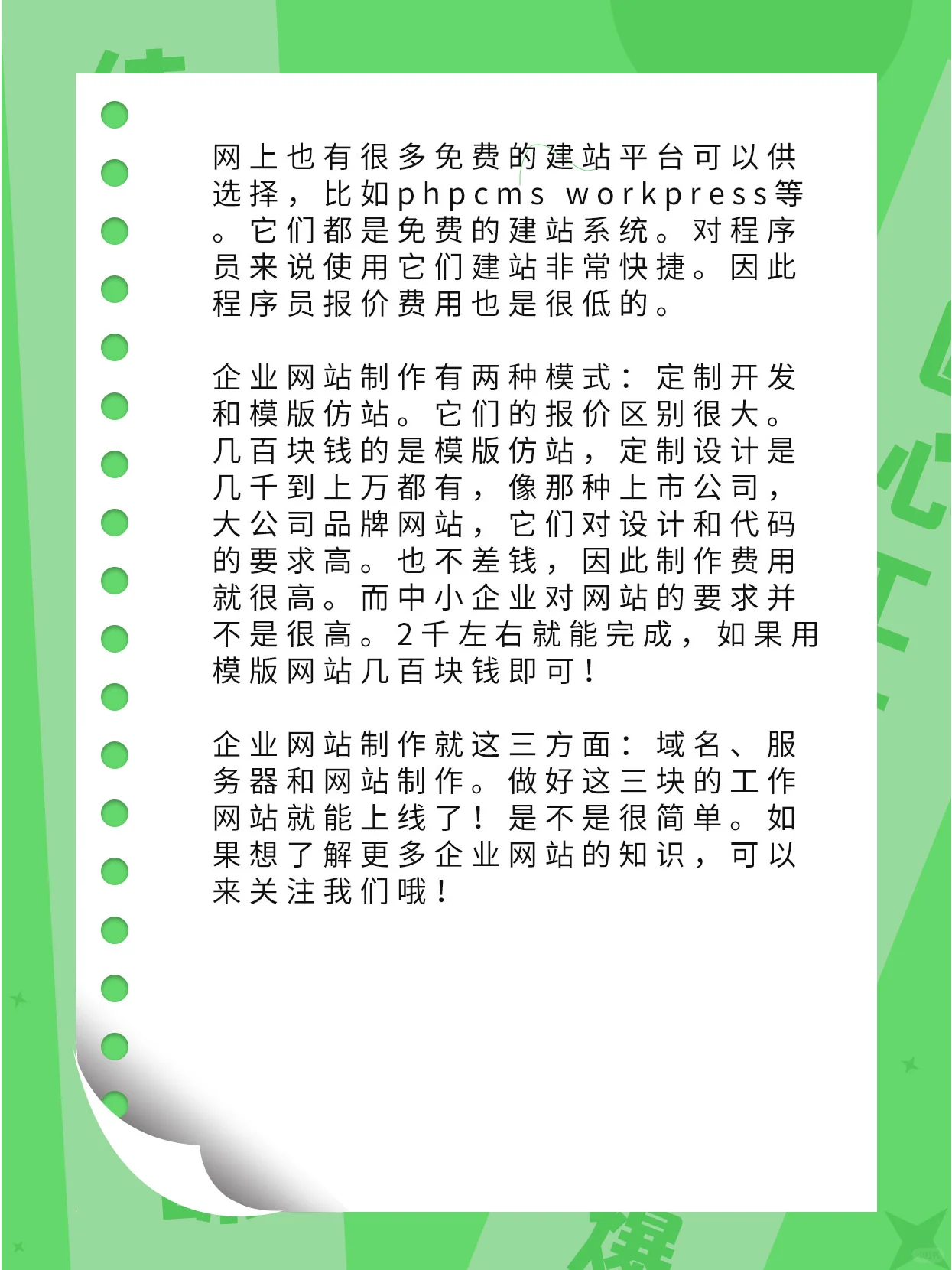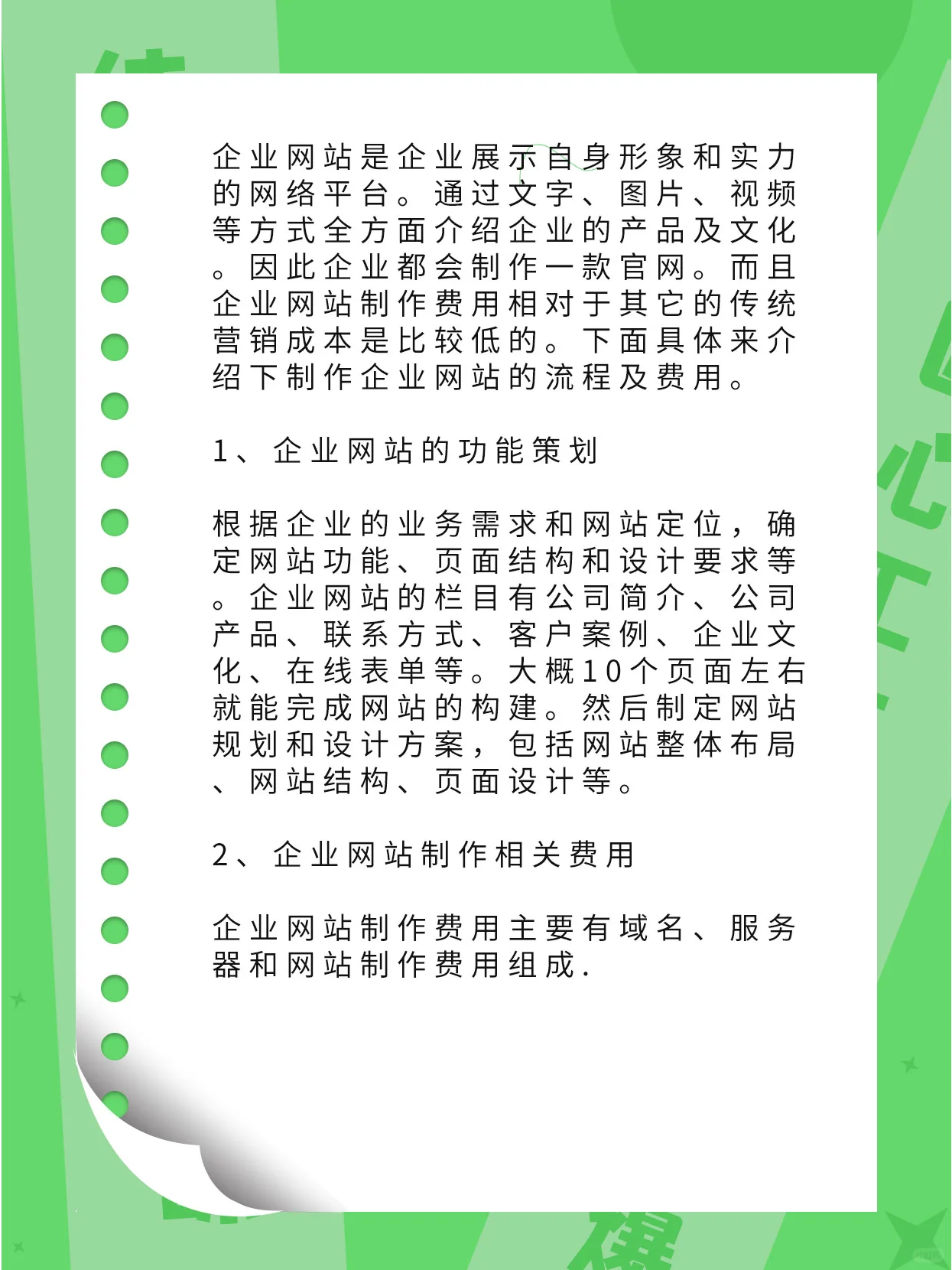 企业网站是企业展示自身形象和实力的网络平台。通过文字、图片、视频等方式全面介绍公司的产品和文化。因此,公司将创建一个官方网站。此外,与其他传统营销成本相比,企业网站的生产成本相对较低。以下是创建企业网站的过程和成本的详细介绍。 [哇R]1。企业网站的功能规划 根据企业的业务需求和网站定位,确定网站功能、页面结构和设计要求。企业网站的栏目包括公司简介、公司产品、联系方式、客户案例、企业文化、在线表格等。完成网站建设大约需要10页。然后制定网站规划和设计计划,包括网站整体布局、网站结构、页面设计等。 [像R]2。企业网站制作相关费用 企业网站制作成本主要包括域名、服务器和网站制作成本。 [可爱的R]1。域名(50元左右) 注册费每年约50元,域名选择应使用简单、易于记忆的,或公司英文缩写和数字。建议尽可能自己注册域名,而不是委托他人注册。在大型品牌云服务器网站上注册。 [自拍照R]2。服务器(300-1000元以上) 如果企业网站不从事招投标推广。对服务器的要求相对较低,一般几百元就可以买到。服务器分为国内和国外。如果网站位于中国,则需要注册域名。对于外国或香港服务器,不需要注册域名。 [金土豆R]3。网站制作成本(从几百到数万不等) 创建一个企业网站的成本是根深蒂固的,如果一个人不了解这个行业,很容易被欺骗。首先,让他们都知道,从程序员的角度来看,创建一个公司网站非常简单。它的主要功能是显示。与购物中心网站不同,有许多功能需要定制开发。 网上还有许多免费的网站建设平台可供选择,如phpcms workpress等。它们都是免费的网站构建系统。对于程序员来说,使用它们来构建网站是非常快的。因此,程序员的报价成本也很低。 企业网站开发有两种模式:定制开发和模板模仿。他们的报价差别很大。几百元是用于模板模仿网站,定制设计从数千到数万不等。上市公司和大公司的品牌网站对设计和代码有很高的要求。它不缺钱,所以生产成本很高。然而,中小企业对网站的要求并不是很高。它可以花2000元左右完成,如果你使用模板网站,它可能需要几百元! 企业网站开发涉及域名、服务器和网站开发三个方面。做好这三项工作,网站就可以上线了!是不是很简单。