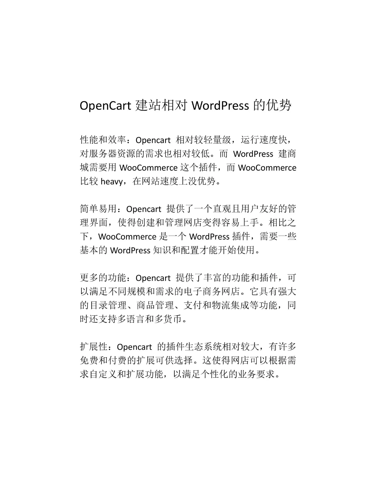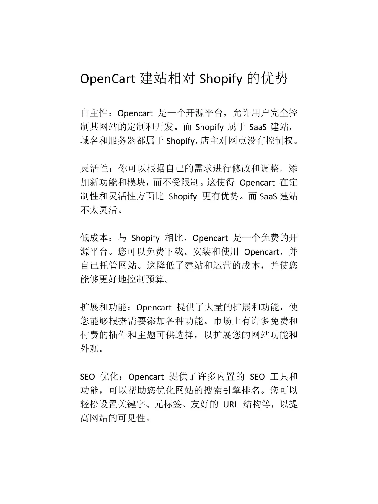 一️⃣ OpenCart与Shopify ✅ Shopify是一个SaaS网站,域名和服务器都属于Shopify。店主无法控制在线商店,而使用OpenCart时,店主可以完全控制商店。 ✅ Shopify提供月租服务,而OpenCart是免费和开源的。 ✅ SaaS网站构建不是很灵活,修改模板可能会很麻烦。然而,开源网站构建插件数量众多,可扩展性强,允许用户自定义所需的功能。 ✅ SaaS网站建设对SEO不是很友好,而OpenCart内置了丰富的SEO功能。 二️⃣ OpenCart VS WordPress ✅ OpenCart是轻量级的,而构建WordPress商店需要使用WooCommerce,这是一个相对较重的插件,因此WordPress商店在速度上没有优势。 ✅ WordPress是一个博客系统。除了使用WooCommerce,开设网店还需要一些WordPress的配置;OpenCart是一个操作相对简单的纯电子商务系统。 三️⃣ OpenCart与Magento ✅ OpenCart适用于中小型企业,而Magento适用于大型企业。 ✅ Magento对服务器的要求很高,OpenCart重量轻,对服务器资源的需求相对较低。 ✅ Magento的开发很困难,而OpenCart则相对简单。 ✅ Magento具有更强的可扩展性,但对于中小型企业来说,使用起来似乎很麻烦。