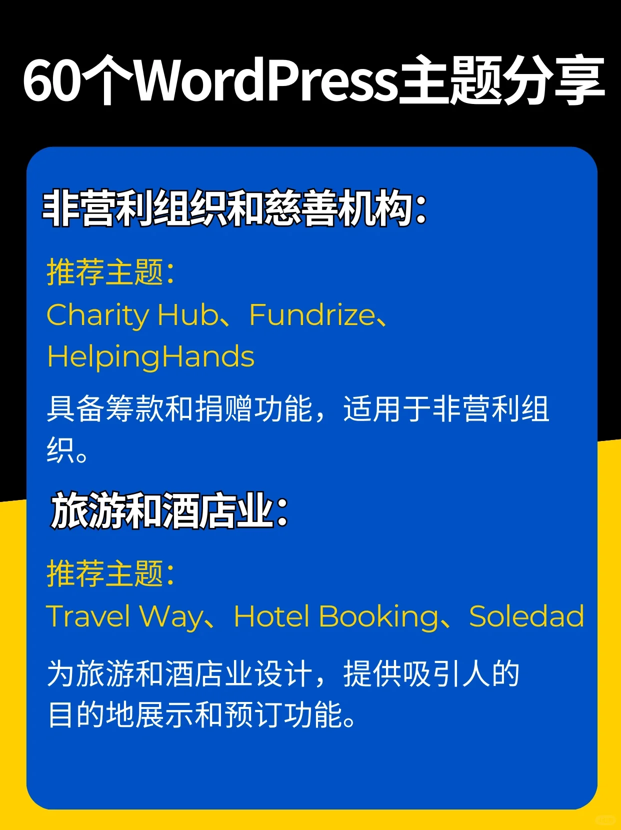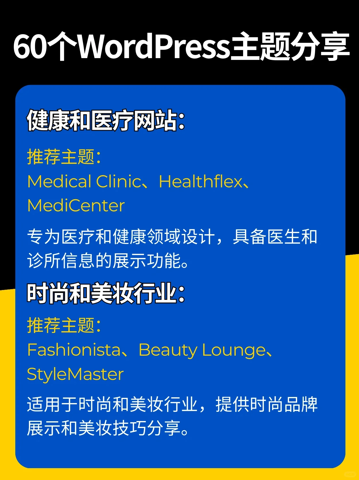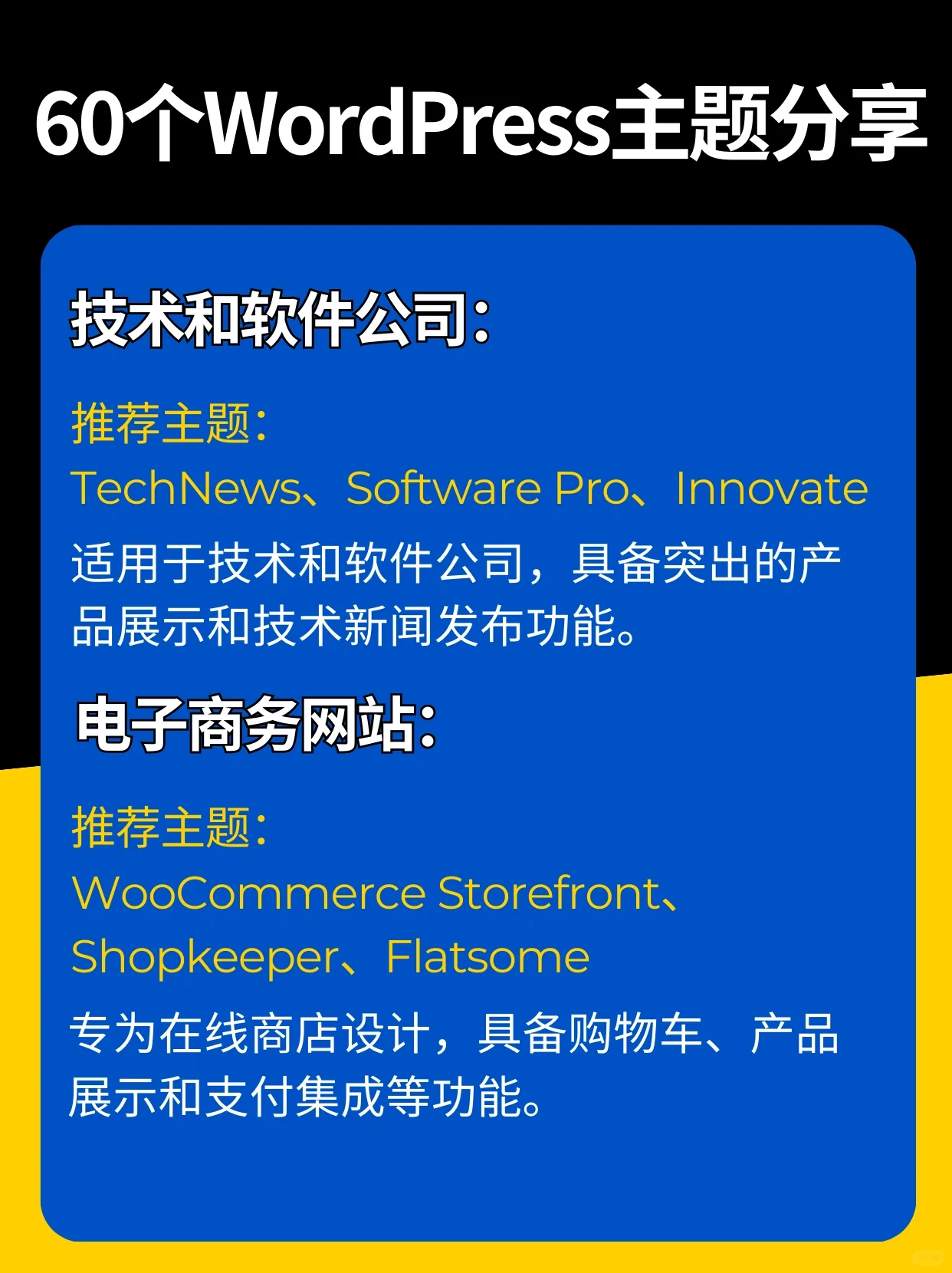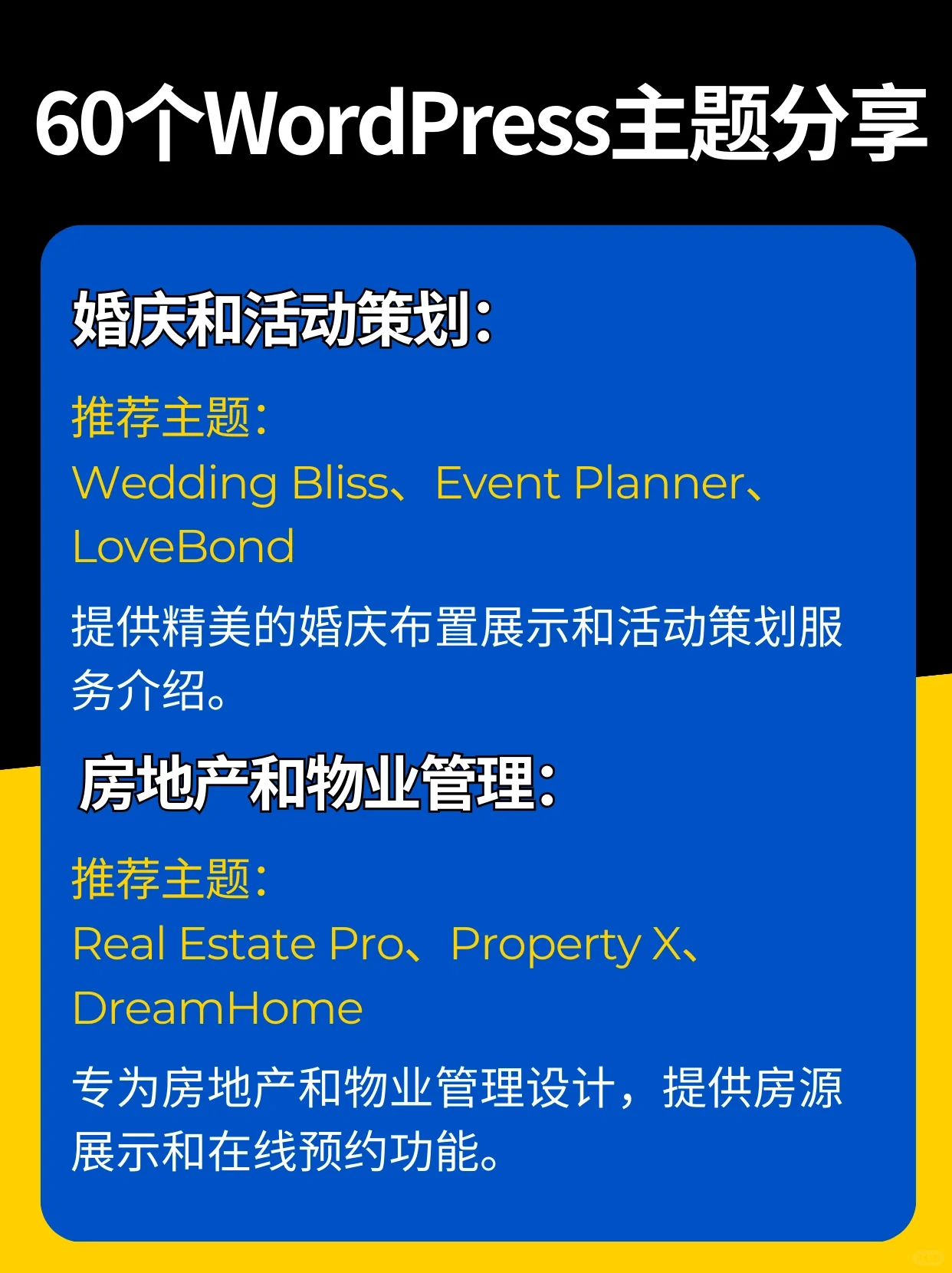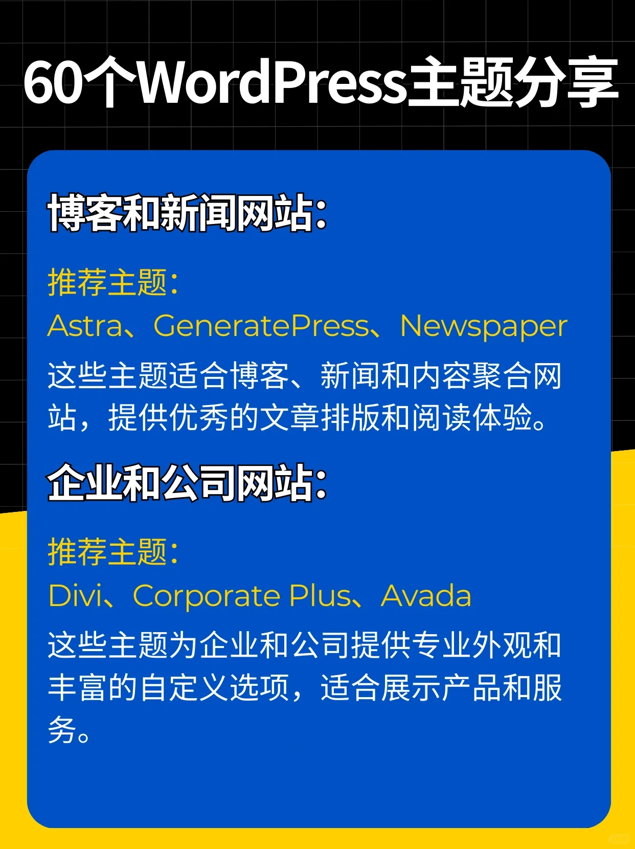 选择合适的WordPress主题对于网站的成功至关重要。不同类型的网站需要不同的外观和功能。本文整理了60个WordPress主题分享: ✅ 博客和新闻网站:Astra,GeneratePress,Newspaper。 ✅ 企业和公司网站:Divi,Corporate Plus,Avada。 ✅ 技术和软件公司:TechNews,software Pro,Innovate。 ✅ 电子商务网站:WooCommerce Storefront,Shopkeeper,Flatsome。 ✅ 摄影和艺术网站:Photocrati,Oshine,Photography。 ✅ 餐厅和美食博客:Neve餐厅,Rosa2,Foodica。 ✅ 健康和医疗网站:medical Clinic,Healthflex,MediCenter。 ✅ 时尚和美容行业:Fashionista,beauty Lounge,StyleMaster。 ✅ 体育和健身行业:Sportify,fitness Pro,运动员专区。 ✅ 教育和在线课程:教育WP、eLumine、Academy。 ✅ 创意和设计:H代码,桥梁,TheGem。 ✅ 简历和投资组合:One Page Express,Ryan,投资组合。 ✅ 非营利组织和慈善组织:慈善中心、基金会、帮助之手。 ✅ 旅游和酒店业:旅游方式,酒店预订,Soledad。通过 ✅ 婚礼幸福,活动策划,LoveBond。 ✅ 房地产和物业管理:Real Estate Pro,Property X,DreamHome。 ✅ 环境保护与可持续发展:生态绿色、可持续生活、绿色地球。 ✅ 儿童教育和娱乐:儿童星球,教育中心,游戏世界。 ✅ 音乐和娱乐行业:音乐乐队,娱乐专业,BeatMaster。 ✅ 汽车销售和维修服务:汽车世界,汽车经销商,机械大师。 以上主题涵盖了各个行业的需求,希望能为您的网站选择提供一些启发和帮助。在选择主题时,请记住考虑网站的目标和风格,确保最终选择完全符合您的需求。