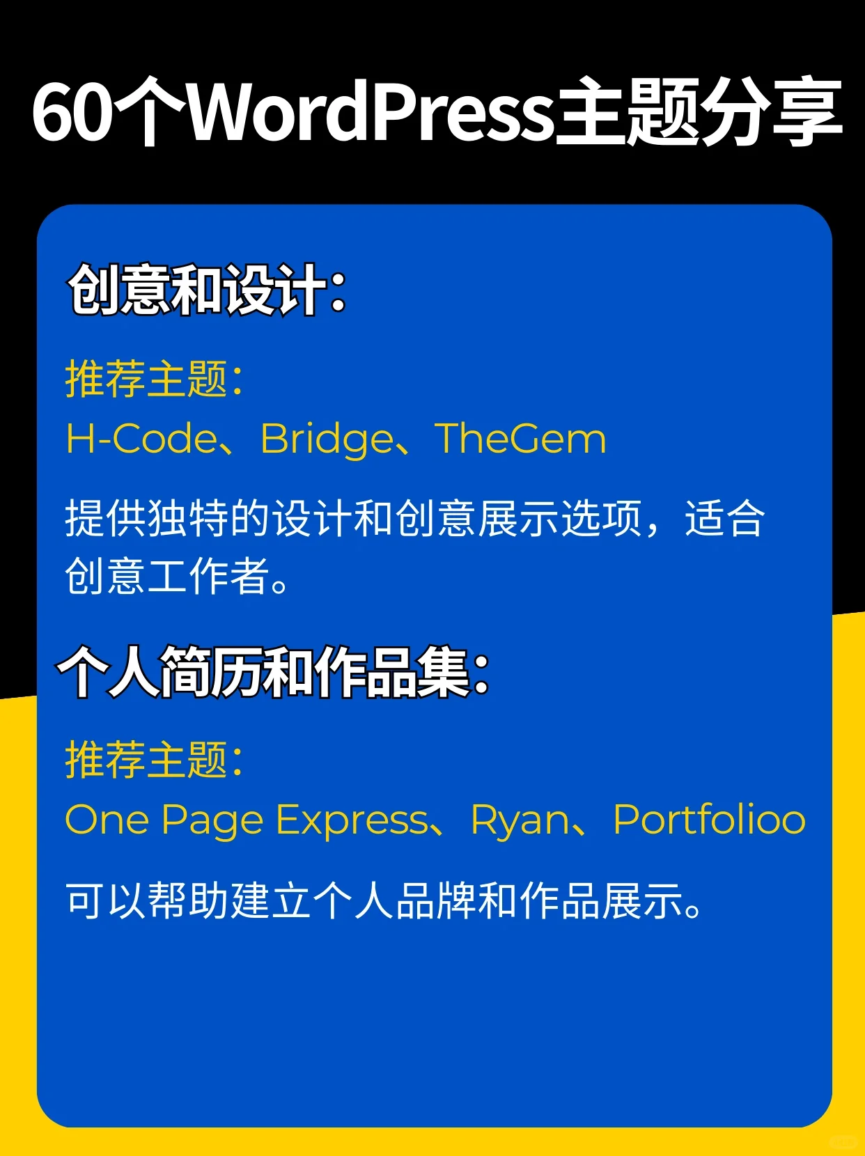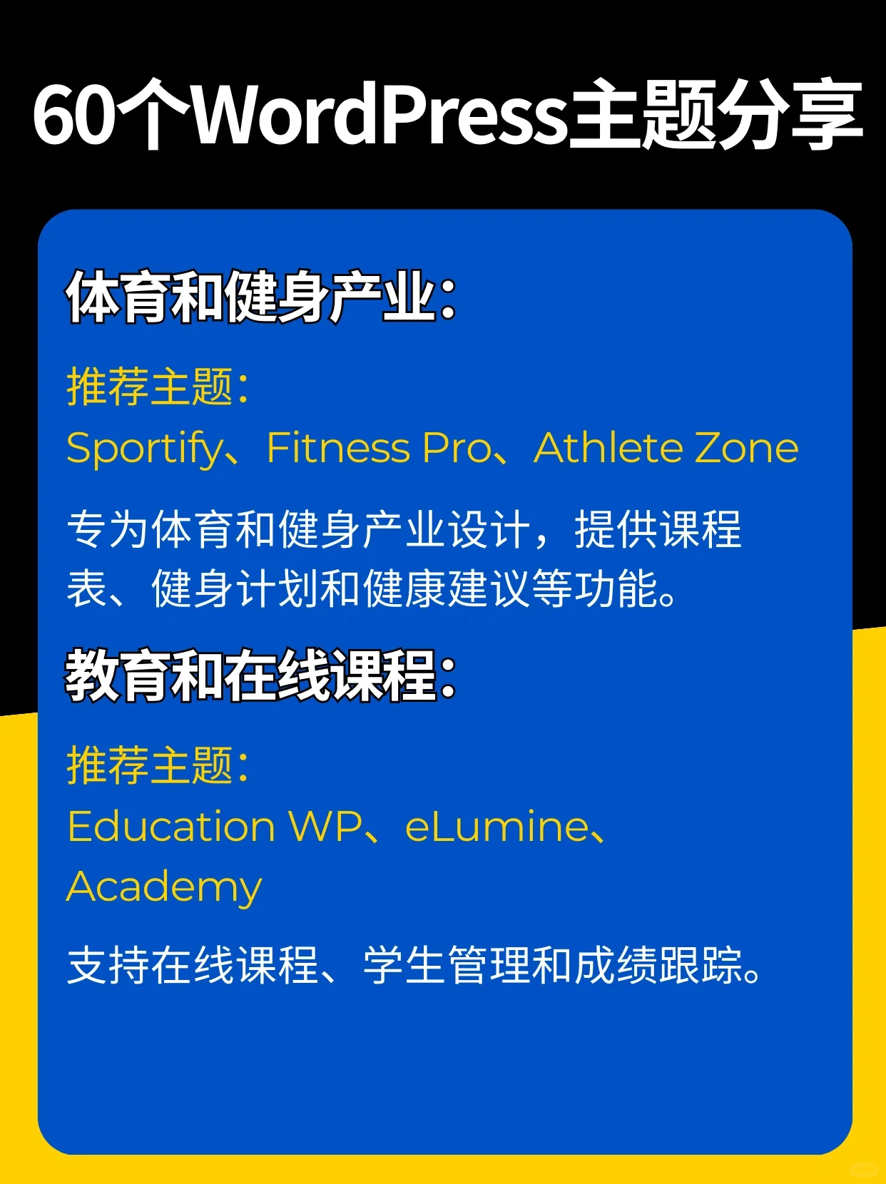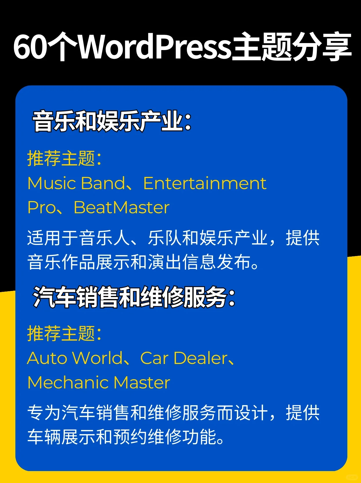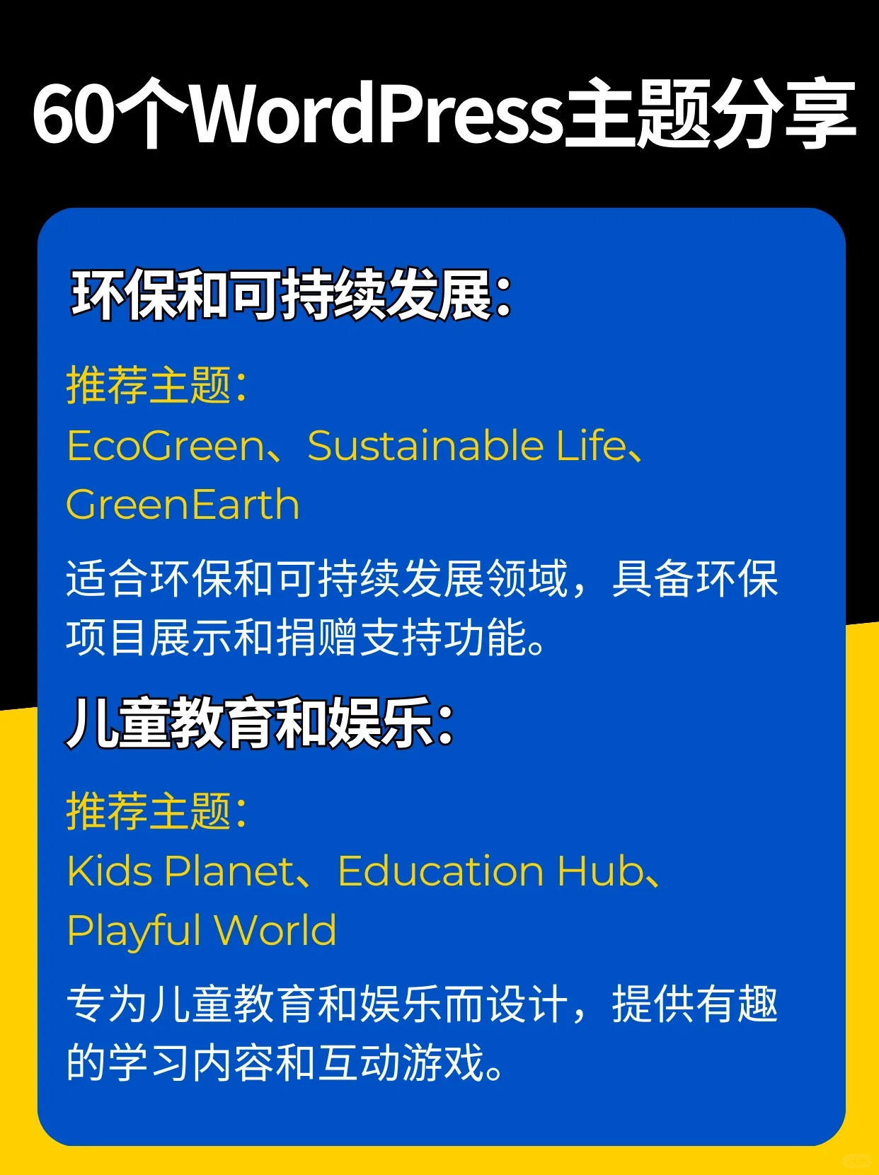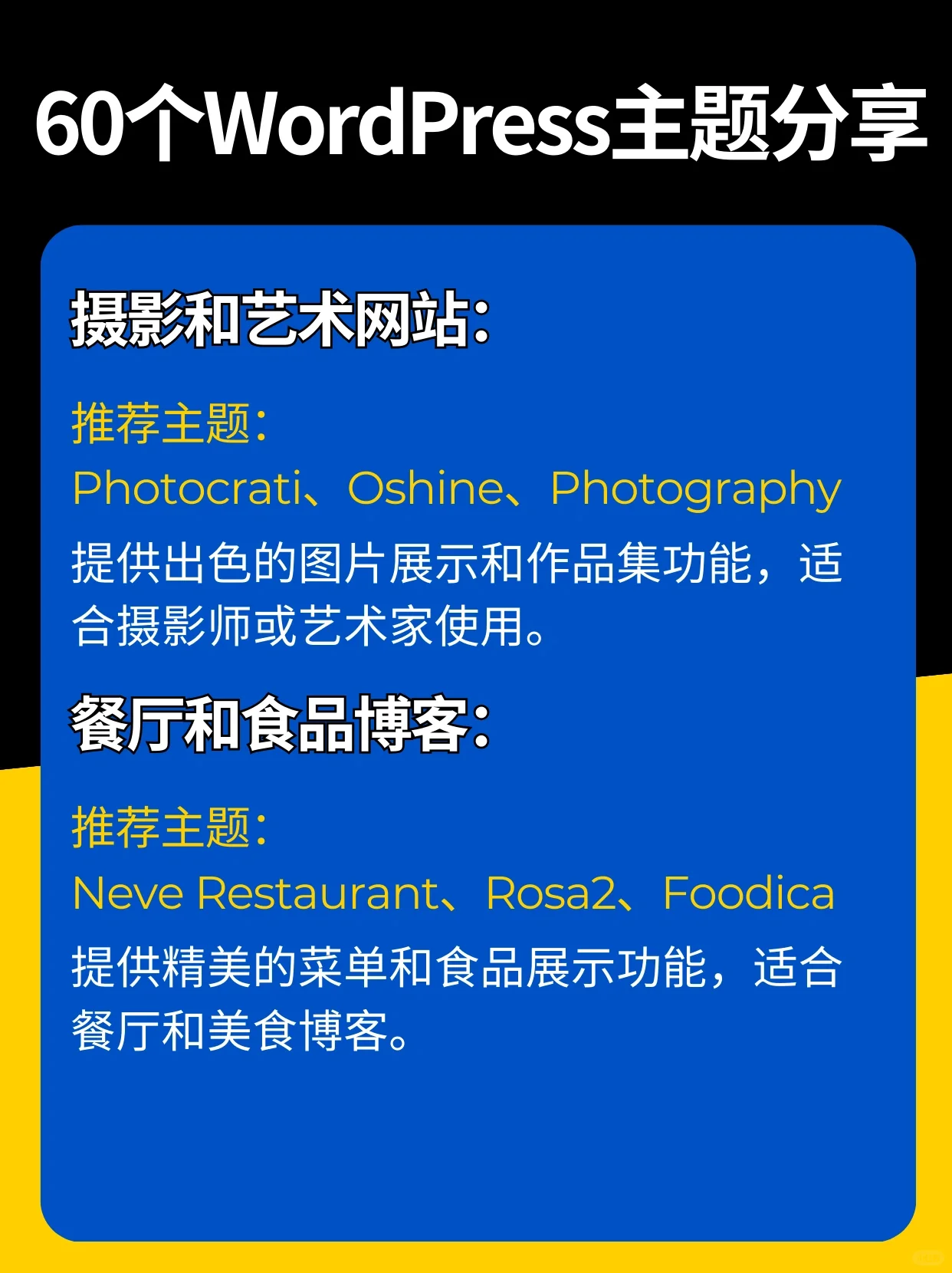 选择合适的WordPress主题对于网站的成功至关重要。不同类型的网站需要不同的外观和功能。本文整理了60个WordPress主题分享: ✅ 博客和新闻网站:Astra,GeneratePress,Newspaper。 ✅ 企业和公司网站:Divi,Corporate Plus,Avada。 ✅ 技术和软件公司:TechNews,software Pro,Innovate。 ✅ 电子商务网站:WooCommerce Storefront,Shopkeeper,Flatsome。 ✅ 摄影和艺术网站:Photocrati,Oshine,Photography。 ✅ 餐厅和美食博客:Neve餐厅,Rosa2,Foodica。 ✅ 健康和医疗网站:medical Clinic,Healthflex,MediCenter。 ✅ 时尚和美容行业:Fashionista,beauty Lounge,StyleMaster。 ✅ 体育和健身行业:Sportify,fitness Pro,运动员专区。 ✅ 教育和在线课程:教育WP、eLumine、Academy。 ✅ 创意和设计:H代码,桥梁,TheGem。 ✅ 简历和投资组合:One Page Express,Ryan,投资组合。 ✅ 非营利组织和慈善组织:慈善中心、基金会、帮助之手。 ✅ 旅游和酒店业:旅游方式,酒店预订,Soledad。通过 ✅ 婚礼幸福,活动策划,LoveBond。 ✅ 房地产和物业管理:Real Estate Pro,Property X,DreamHome。 ✅ 环境保护与可持续发展:生态绿色、可持续生活、绿色地球。 ✅ 儿童教育和娱乐:儿童星球,教育中心,游戏世界。 ✅ 音乐和娱乐行业:音乐乐队,娱乐专业,BeatMaster。 ✅ 汽车销售和维修服务:汽车世界,汽车经销商,机械大师。 以上主题涵盖了各个行业的需求,希望能为您的网站选择提供一些启发和帮助。在选择主题时,请记住考虑网站的目标和风格,确保最终选择完全符合您的需求。