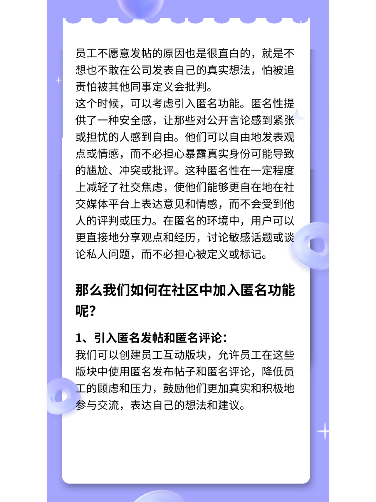 本文是关于如何运营公司内部社区以及如何激发员工互动的。 作为运营商,必须首先明确公司内部员工培养的目的。通常是创建和推广公司内部文化,发布公司政策通知和行业趋势,组织公司关键活动,分享员工经验和资源,与员工互动,提供员工建议的反馈等。 除了运营商需要发布的通知和政策外,运营商在建立企业社区后面临的最大挑战是如何消除员工的担忧,鼓励他们在社区中发声。由于各种因素,员工不愿意在公司内部社区表达自己的意见或建议,也不愿意参加社区活动。 如果网站运营商不采取相应措施进行调整,企业内部员工群体就很难生存。 员工不愿意发帖的原因也很简单,那就是他们不想或不敢在公司表达自己的真实想法,害怕被追究责任或被其他同事定义和批评。 在这一点上,可以考虑引入匿名功能。匿名提供了一种安全感,让那些对公共言论感到紧张或担忧的人感到自由。他们可以自由表达自己的观点或情绪,而不必担心暴露自己的真实身份可能导致的尴尬、冲突或批评。这种匿名性在一定程度上缓解了社交焦虑,使他们能够在社交媒体平台上更自由地表达自己的观点和情绪,而不会受到他人的评判或压力。在匿名环境中,用户可以更直接地分享观点和体验,讨论敏感话题或个人问题,而无需担心被定义或标记。