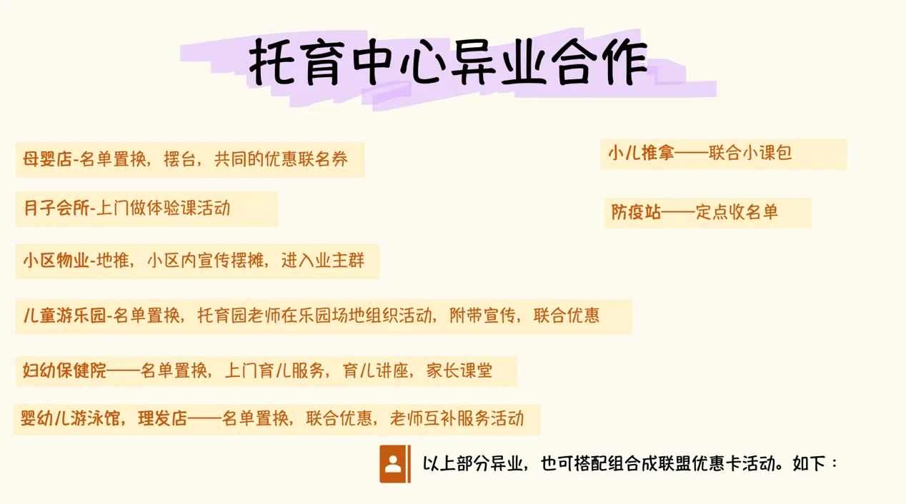 生源是解决所有问题的根本,跨行业合作是为托幼中心带来更多资源和效益的有效途径。在选择跨行业合作伙伴和洽谈合作时,托育中心需要特别注意以下几点。 666获得完整的合作计划 首先,选择一个合适的跨行业合作伙伴有利于其他人在思维上突出自己的优势。儿童保育中心应与与其定位一致、优势互补的企业合作。例如,托儿中心可以考虑与母婴用品店、亲子教育机构、儿科按摩院等合作,为家长提供更好的服务和产品。在选择合作伙伴时,重要的是要注意他们的信誉、专业能力和对企业文化的理解。 第二,注重互利共赢的原则。在合作谈判过程中,托育中心需要明确各自的合作需求和目标,并与不同行业的合作伙伴进行深入沟通,确保双方利益最大化。双方可以建立详细的合作协议,明确各自的责任和权利,建立互信和长期合作的基础。 此外,在与不同行业的合作伙伴进行谈判时,托育中心应注意仔细了解其业务实力和声誉。可以通过调查市场反馈、查看其官方网站以及与相关家长沟通来获得更多信息。同时,也可以要求非业务合作伙伴提供其资质证书、专业信息等证明文件,以确保其合法经营和专业水平。 最后,在跨行业合作模式方面,托育中心可以灵活选择。除了定期开展组织亲子活动、协同营销等促销活动外,还可以考虑进一步深化合作,如共同打造亲子互动课程等。这不仅可以增加托儿中心的竞争力和吸引力,还可以提高家长对托儿中心满意度和忠诚度。 总之,在跨行业合作中,托育中心需要注重选择合适的合作伙伴,促进互利共赢,强调实力和声誉,灵活选择合作方式。通过建立良好的合作关系,托育中心可以为家长提供更好的服务和产品,实现共同发展、共赢。