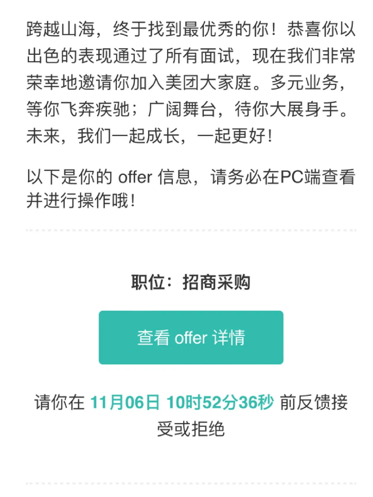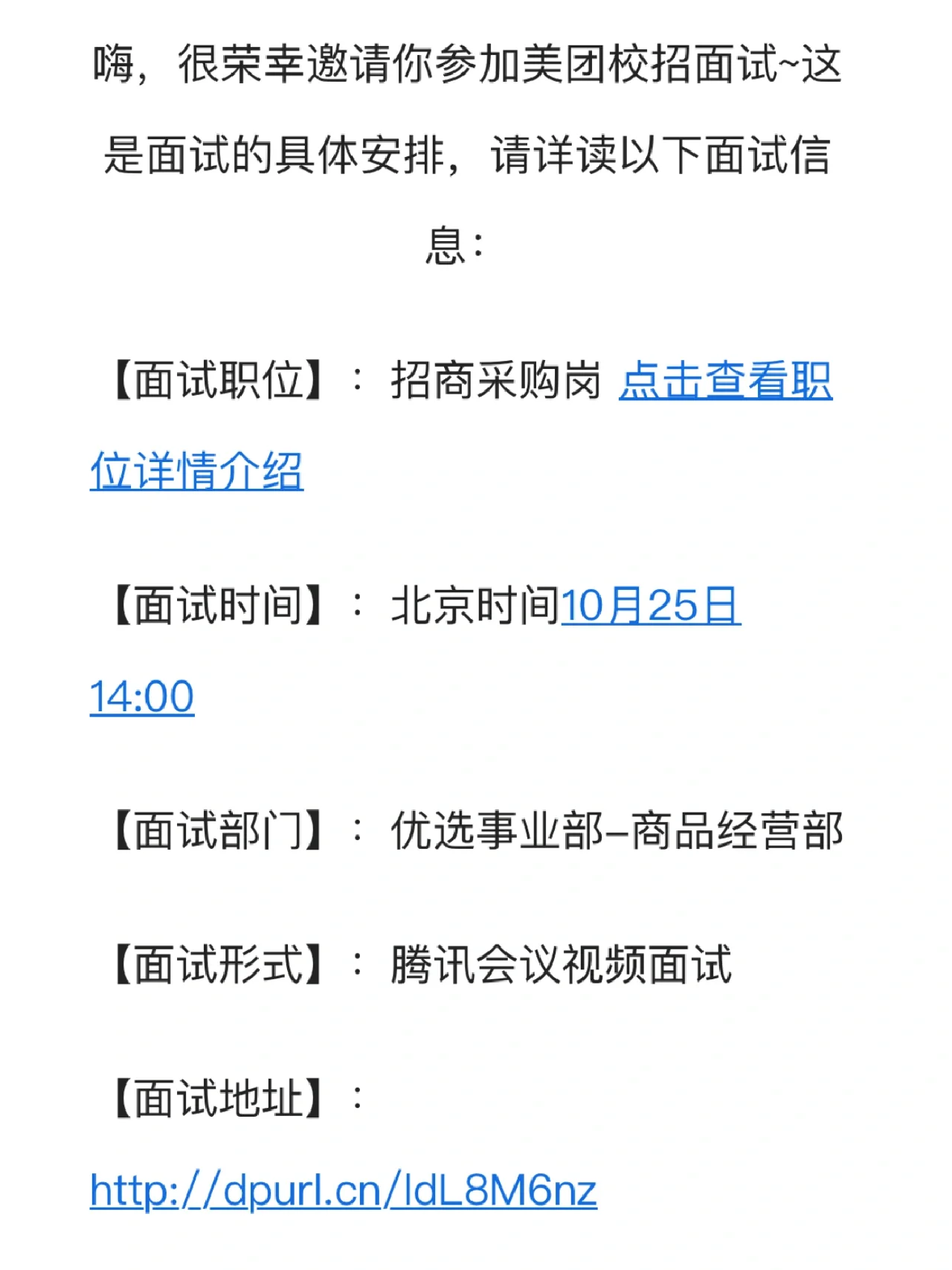? 我的背景:双非一,主修国际经济与贸易,有三次实习,没有不及格的成绩。 首先,在官方网站上提交你的简历,然后你会收到一个评论链接( 电子邮件公司为北京三快有限公司,通过考核后,HR将通过电话和电子邮件安排约一到两周的面试时间。 一侧:业务主管一侧(15-25分钟) 一️⃣ 自我介绍 二️⃣ 我在实习或在校期间遇到的最大困难是什么我该如何解决 三️⃣ 了解采购职位并接受轮岗 四️⃣ 你了解美团优选吗你对此有何感受 五️⃣ 反思部分(每个人都必须提问,不要毫无疑问地回答!对这个职位表现出兴趣!) ? 一方面经验:这个面试官是我秋季招聘以来遇到的最友好的面试官!采访开始前,他说他在外面工作时不方便使用相机,所以我也不需要使用。在面试过程中,它让我放松下来,并把我当作一个定期聊天的人。他还在提问环节告诉我校园招聘和社会招聘的区别,这样我就不用太担心了,并在面试中称赞了我的整体表现。 两侧:HR侧(20-30min) 一️⃣ 自我介绍 二️⃣ 深挖简历(竞争团队合作中最大的贡献,实习中最大的收获) 三️⃣ 你在工作职责之外做了哪些有益于你工作的事情 四️⃣ 你目前有其他工作机会、理想的基础和接受轮换吗 五️⃣ 修辞会话 ? 双面经验:熟悉简历,HR挖掘简历非常细致!! ? 报价电话: 通过面试后,您将在大约两周内收到OC。HR会让你选择剩下的基地,通知你工资,并询问三方的签约时间(公司都知道学校三方的开学日期,所以最好不要编造虚假信息)。第二天发送电子邮件以确认报价、在线签名等。