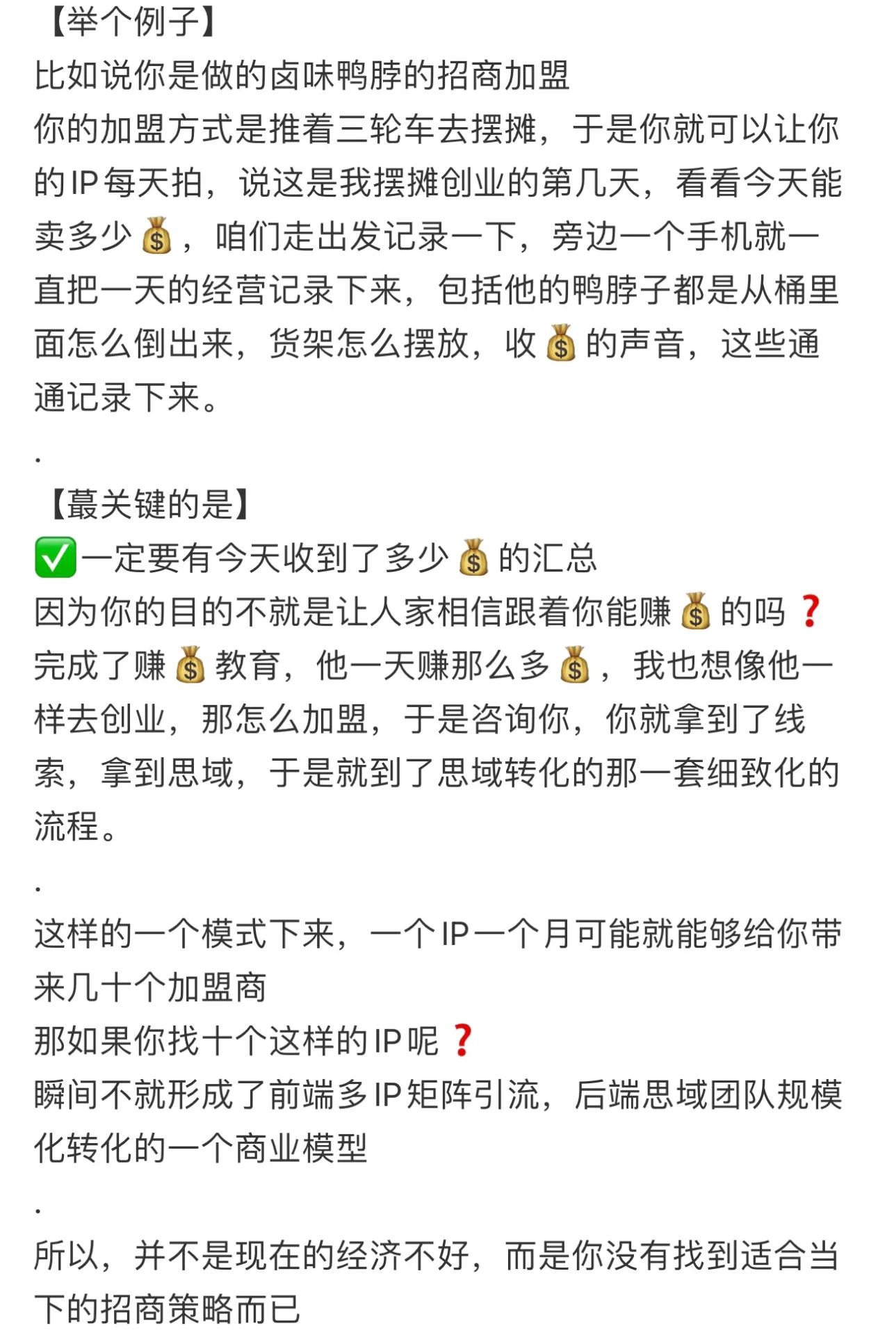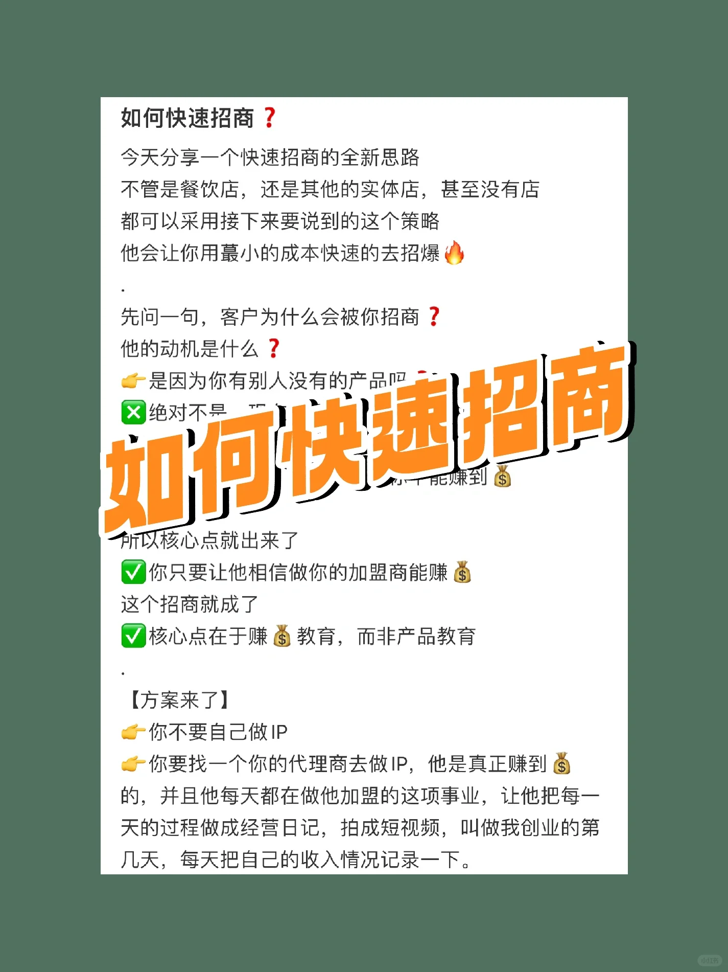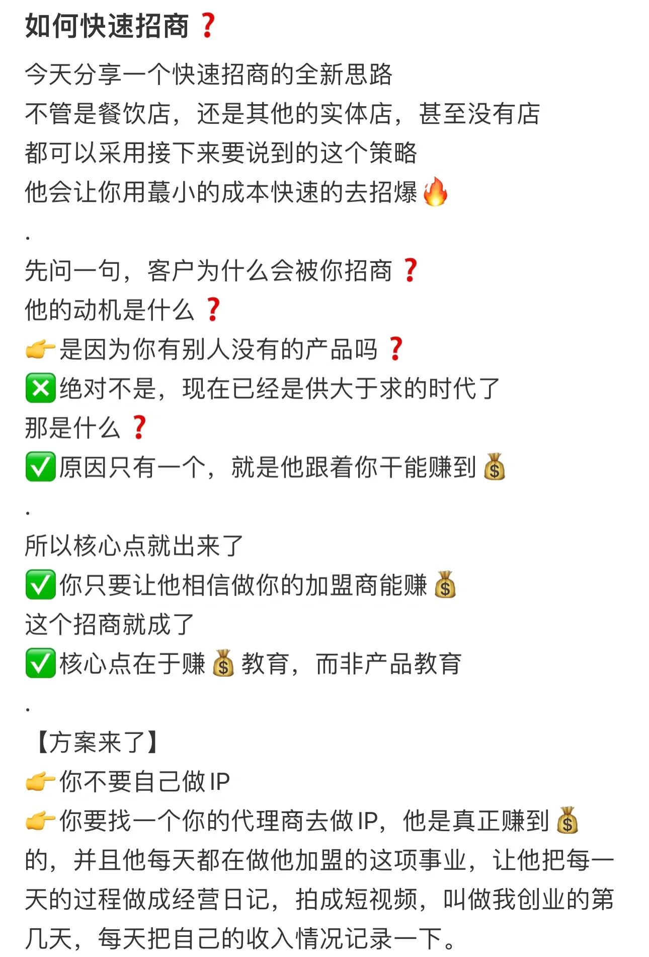 如何快速吸引投资 今天,我将分享一个快速投资促进的新想法 无论是餐馆、其他实体店,还是没有商店 我们都可以采取下一步将要讨论的战略 他会让你以最低的成本快速招募炸药 首先,为什么客户会被你招募 他的动机是什么 是因为你有别人没有的产品吗 叉子绝对不是。现在已经是供过于求的时代了 那是什么 原因只有一个,那就是他可以通过追随你来获利 • • 所以核心观点就出来了 你只需要让他相信成为你的特许经营商可以发财 这次投资推广已经变成 核心在于收入教育,而不是产品教育 [计划在这里]