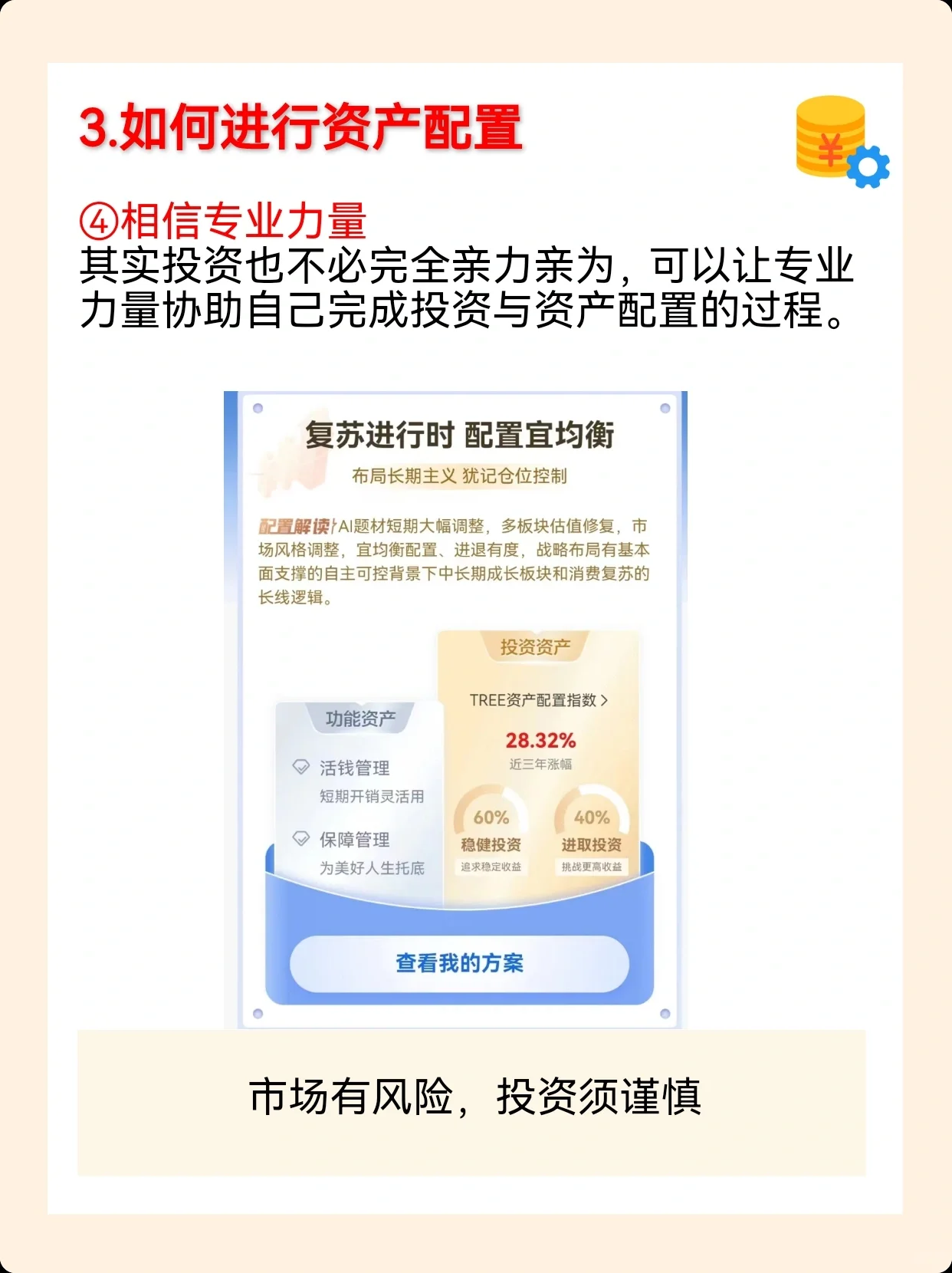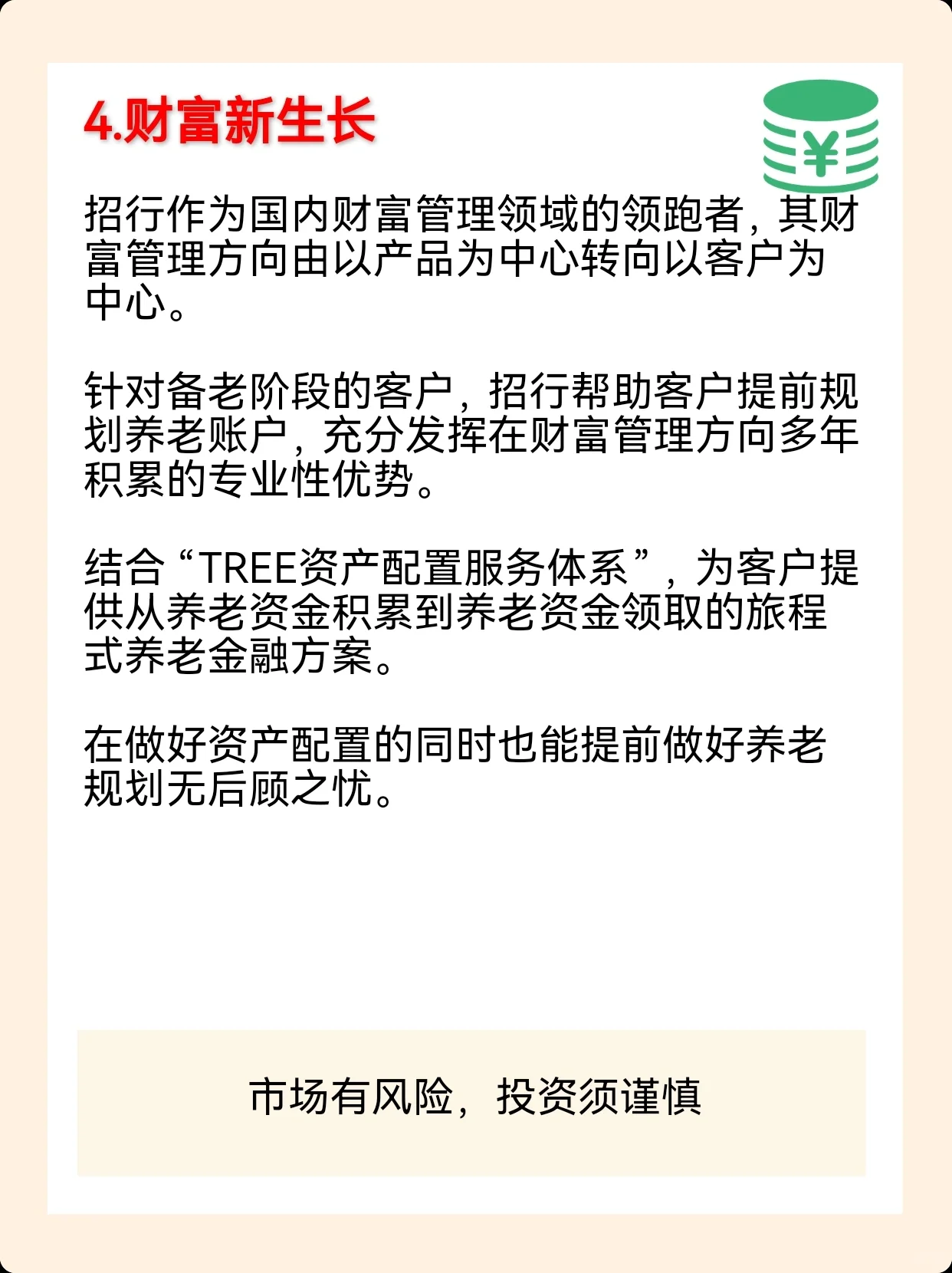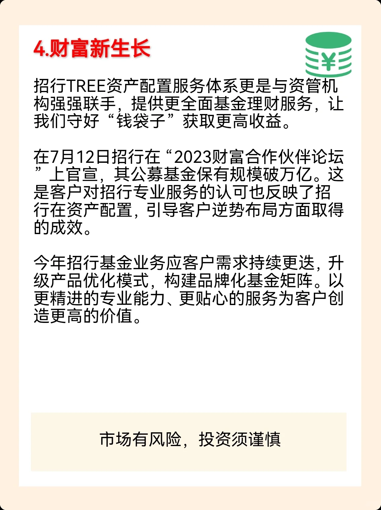 近年来,许多人的生活在不同程度上受到国内外经济环境的影响。由于经济环境的影响,一些中产阶级的资产出现负增长。为什么会导致资产负增长事实上,这最终归结为资产管理和配置不足。因此,在未来,我们每个人都需要更加谨慎地管理自己的财务和投资,并做好应对各种意外情况的准备。 一个姐妹可能会说,我知道要做好资产配置,但我没有这方面的知识储备,我的财务管理一团糟。7月12日播出的2023年招商银行财富合伙人论坛上提到的最新升级的TREE资产配置服务系统可以解决我们的问题。通过将我们的财富阶段和风险偏好特征与专业人士相结合,并利用技术的力量,我们可以根据不同个人的特点量身定制专属配置建议。 新升级的TREE资产配置服务系统正在与资产管理机构合作,提供更全面的资金管理服务。对于处于养老准备阶段的客户,我们还结合TREE资产配置系统,为他们提供从养老基金积累到养老基金募集的旅程式养老金融解决方案。在做好资产配置的同时,也可以提前做好退休计划,没有任何后顾之忧。 合理的资产配置可能不会让我们一夜暴富,但它可以增强财富抵御通胀和贬值的能力,实现财富的长期稳定增长。