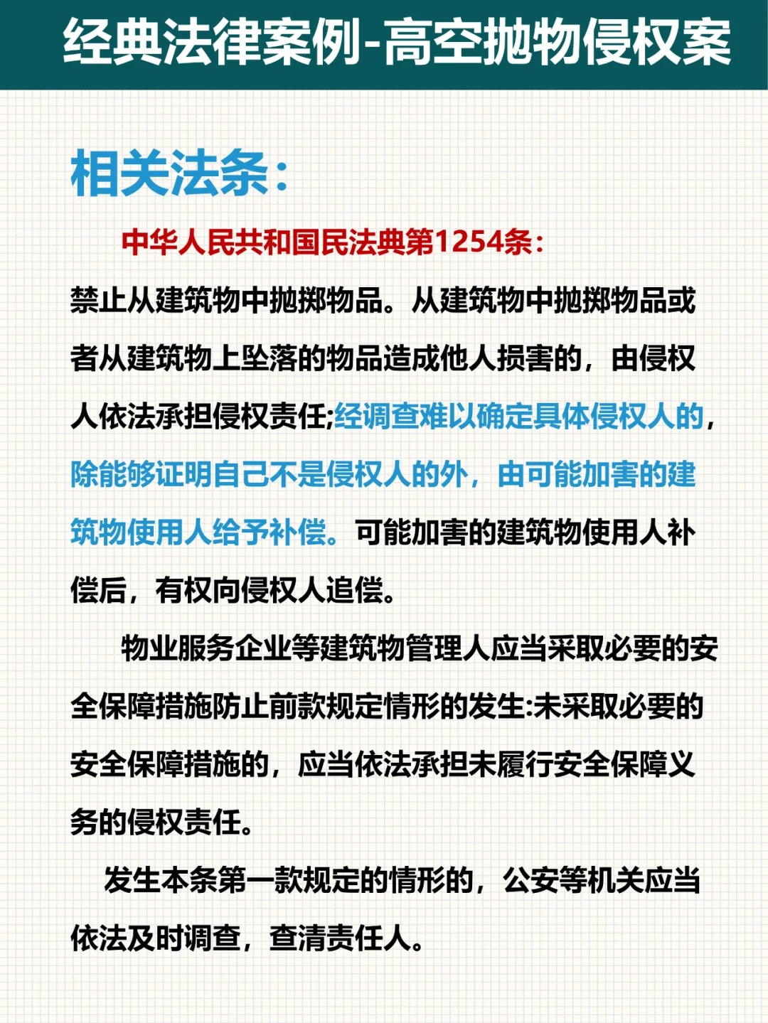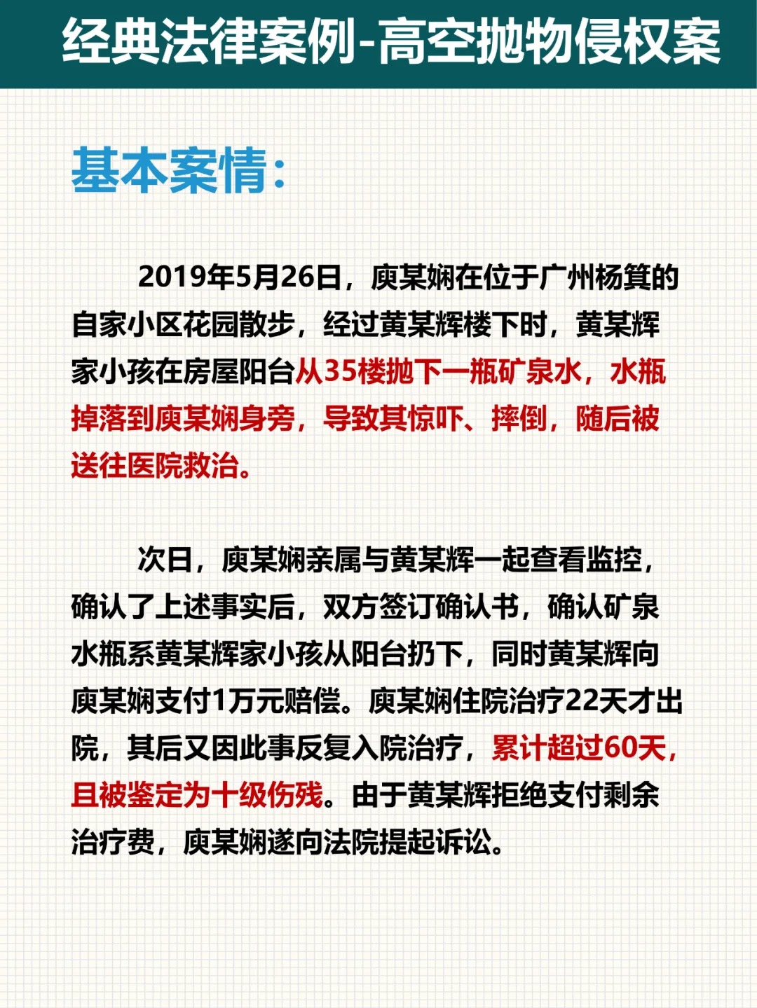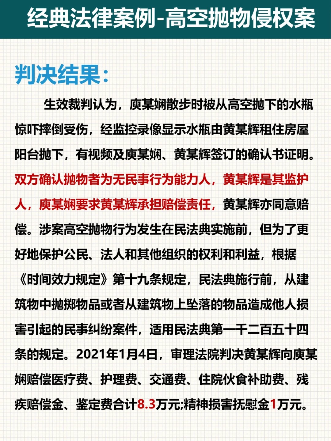 基本案情: 2019年5月26日,庾某娴在位于广州杨箕的自家小区花园散步,经过黄某辉楼下时,黄某辉家小孩在房屋阳台从35楼抛下一瓶矿泉水,水瓶掉落到庾某娴身旁,导致其惊吓、摔倒,随后被送往医院救治。 次日,庾某娴亲属与黄某辉一起查看监控,确认了上述事实后,双方签订确认书,确认矿泉水瓶系黄某辉家小孩从阳台扔下,同时黄某辉向庾某娴支付1万元赔偿。庾某娴住院治疗22天才出院,其后又因此事反复入院治疗,累计超过60天,且被鉴定为十级伤残。由于黄某辉拒绝支付剩余治疗费,庾某娴遂向法院提起诉讼。 判决结果: 生效裁判认为,庾某娴散步时被从高空抛下的水瓶惊吓摔倒受伤,经监控录像显示水瓶由黄某辉租住房屋阳台抛下,有视频及庾某娴、黄某辉签订的确认书证明。双方确认抛物者为无民事行为能力人,黄某辉是其监护人,庾某娴要求黄某辉承担赔偿责任,黄某辉亦同意赔偿。涉案高空抛物行为发生在民法典实施前,但为了更好地保护公民、法人和其他组织的权利和利益,根据《时间效力规定》第十九条规定,民法典施行前,从建筑物中抛掷物品或者从建筑物上坠落的物品造成他人损害引起的民事纠纷案件,适用民法典第一千二百五十四条的规定。2021年1月4日,审理法院判决黄某辉向庾某娴赔偿医疗费、护理费、交通费、住院伙食补助费、残疾赔偿金、鉴定费合计8.3万元;精神损害抚慰金1万元。 相关法条: 中华人民共和国民法典第1254条: 禁止从建筑物中抛掷物品。从建筑物中抛掷物品或者从建筑物上坠落的物品造成他人损害的,由侵权人依法承担侵权责任;经调查难以确定具体侵权人的,除能够证明自己不是侵权人的外,由可能加害的建筑物使用人给予补偿。可能加害的建筑物使用人物业服务企业等建筑物管理人应当采取必要的安全保障措施防止前款规定情形的发生:未采取必要的安全保障措施的,应当依法承担未履行安全保障义务的侵权责任。 发生本条第一款规定的情形的,公安等机关应当依法及时调查,查清责任人。
