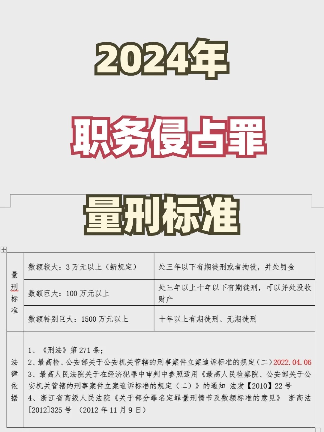 一、量刑幅度 1.数额较大:3万元以上(新规定)>>处三年以下有期徒刑或者拘役,并处罚金 2.数额巨大:100万元以上 >> 处三年以上十年以下有期徒刑,可以并处没收财产 3.数额特别巨大:1500万元以上 >> 十年以上有期徒刑、无期徒刑 二、法律依据 1、《刑法》第271条; 2、最高检、公安部关于公安机关管辖的刑事案件立案追诉标准的规定(二)2022.04.06 3、最高人民法院关于在经济犯罪中审判中参照适用《最高人民检察院、公安部关于公安机关管辖的刑事案件立案追诉标准的规定(二)》的通知 法发【2010】22号 4、浙江省高级人民法院《关于部分罪名定罪量刑情节及数额标准的意见》 三、注意事项 职务侵占与盗窃罪的唯一区分是是否利用职务便利,在该情节模糊的情况下,切勿根据职务侵占罪量刑标准,盲目乐观,也要注意盗窃罪量刑标准,如果被控盗窃罪,认为自己仅涉嫌职务侵占的,一定要及时委托律师介入。