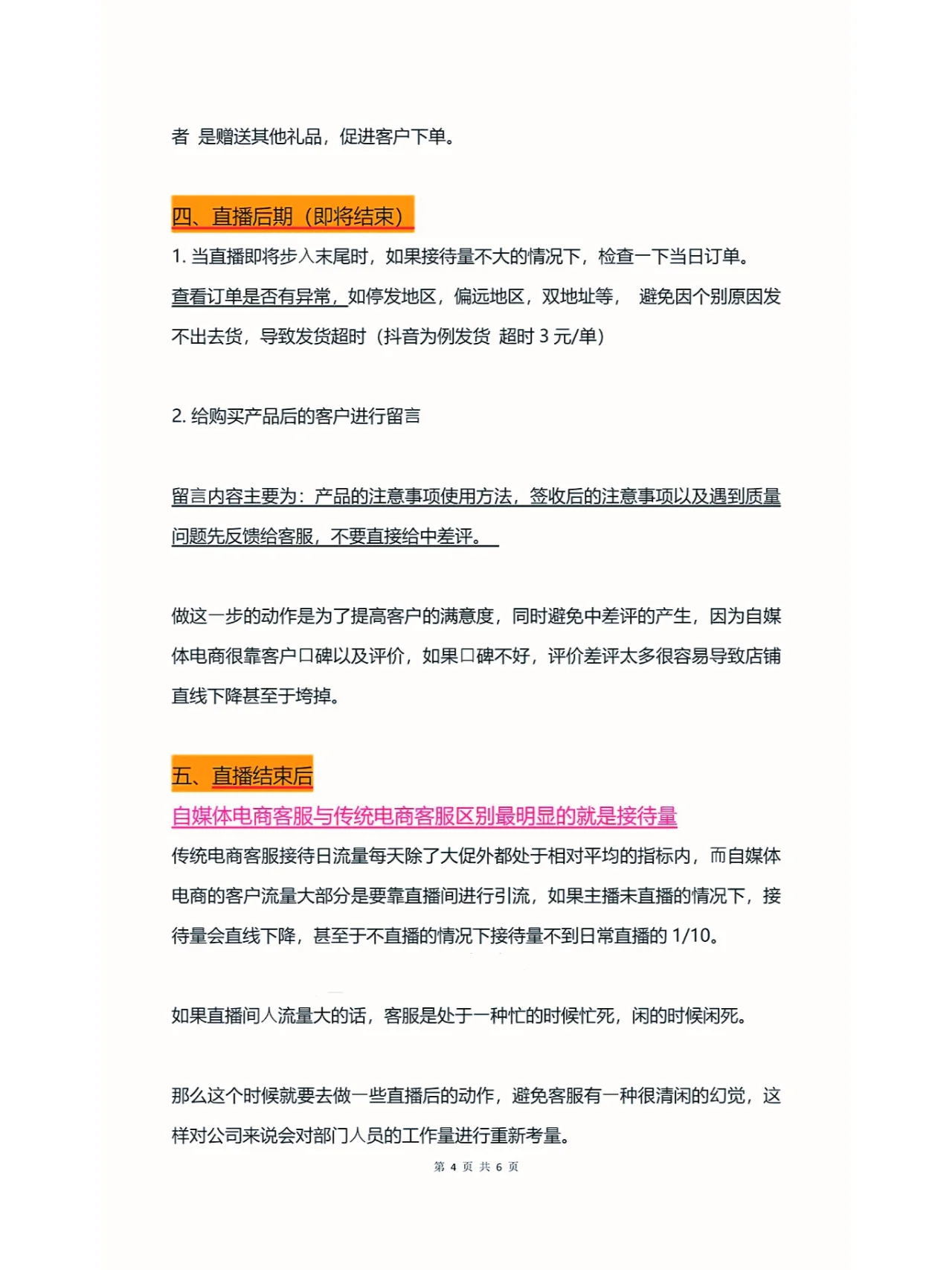 抖音客服工作流程包括售前和售后两个环节。以下是SOP: 1.售前客服工作流程: *客户咨询:客服及时回复客户咨询,了解客户需求,提供产品信息。 *引导式订购:客服根据客户需求推荐合适的产品,引导客户下单,确保订单信息准确无误。 *订单处理:客服为已下订单的客户安排发货,输入订单信息,并验证库存。 *售后服务提醒:当客户下单时,客服会将售后服务卡发给客户,提醒客户注意抖音店铺的售后流程。 2.售后客服工作流程: *客户反馈:客户在抖音门店反馈问题或投诉,客服及时回复客户,了解问题细节。 *售后处理:客户服务将根据客户反馈处理退货、换货、维修和其他问题,以确保客户问题得到解决。 *跟进关怀:售后服务完成后,客服向客户发送跟进关怀卡,了解客户满意度,收集客户反馈。 *后续维护:客服定期跟进客户使用情况,提供维护升级服务,确保产品稳定运行。 抖音客服工作流程需要遵循标准化SOP,确保客服团队能够及时回应客户需求,提供专业优质的服务,提高客户满意度。同时,要建立健全奖惩机制,激励客服团队不断提高服务水平。