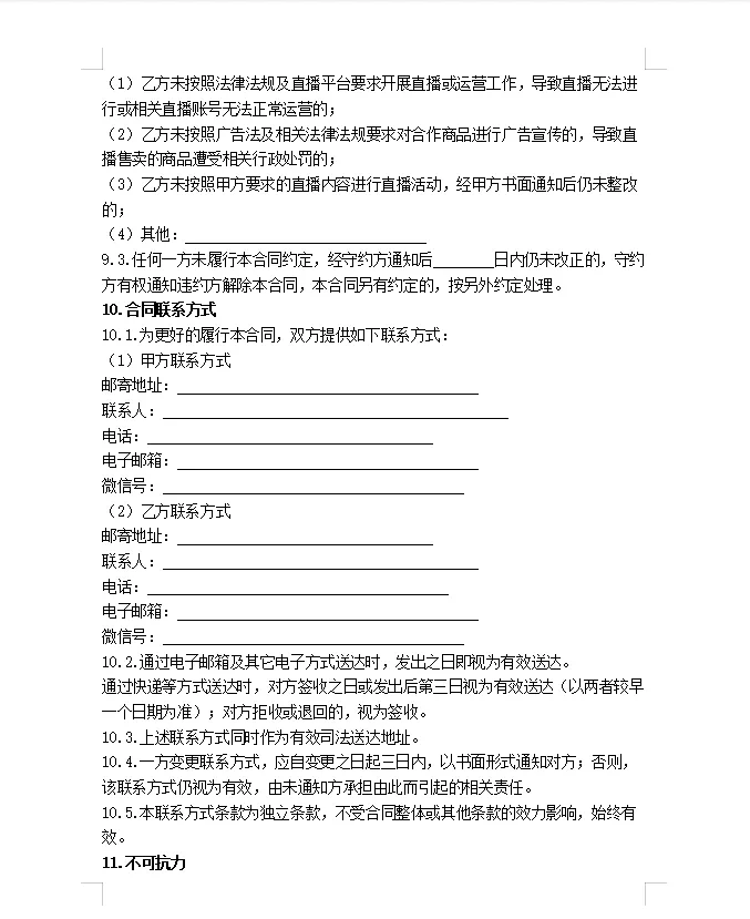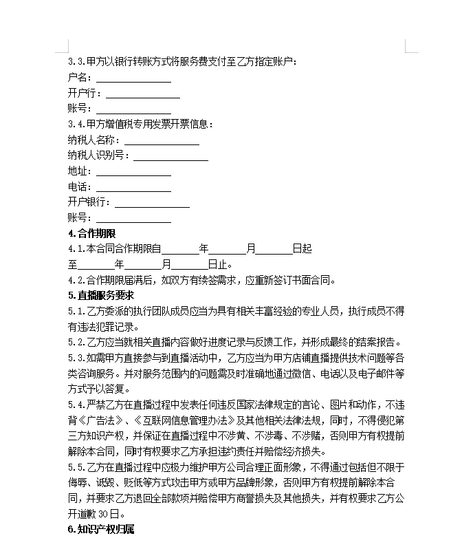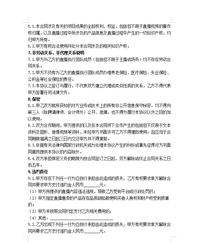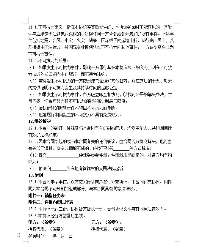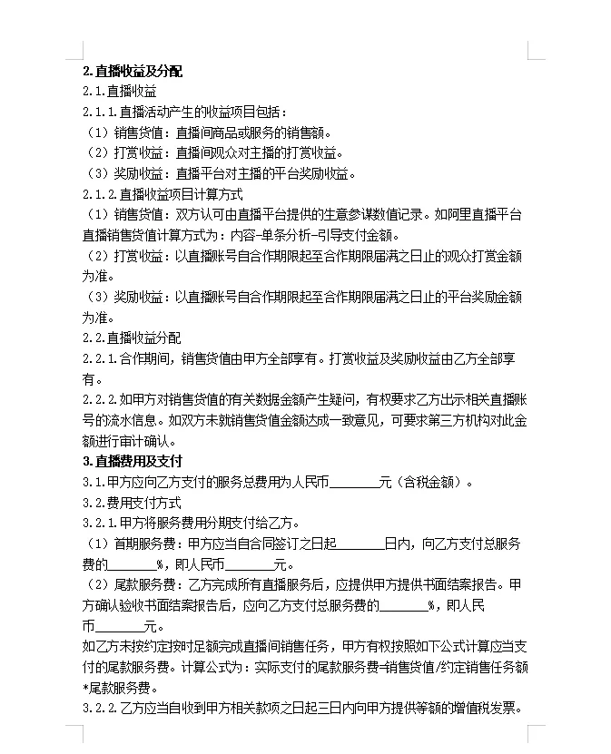 审查直播销售服务合同的要点 1、 审查合作组织 1.了解公司的规模、销售能力、优势和声誉,以及主播过去的产品类型、销量和价格。 2.确认合作机构的资质。直播平台、商家、直播运营服务提供者应当依法取得相应的经营主体资格。 2、 澄清直播服务的内容 1.对服务提供者提供的服务的内容和数量是否有明确的约定; 2.在合同期内,是否对主播的直播时长和频率有明确约定,如每日/每月/阶段; 3.对于具体的直播销售效果,如销售额、退货率等,是否有明确约定; 4.直播平台、直播账号、主播是否有明确约定; 5.合同中应避免空白部分。 3、 明确价格和保险条款 1.直播服务合同的价格通常包括时段费、服务费和佣金。佣金比例通常是根据销售额计算的,但应注意销售额的计算。销售金额应明确定义为直播销售中产生的订单的有效销售金额,不包括退货和退款等订单的销售金额。 此外,当直播销售运营机构未能实现销售目标时,商家可根据双方合同约定,要求退还相应比例的坑位费和服务费,并要求直播销售运营公司支付一定比例的销售目标作为违约金。 2.当商家与直播销售运营机构签订直播销售合同时,其中会包含“保险条款”,这意味着商家必须确保在约定的时间内,主播在直播间销售产品的价格是全网最低的。 4、 明确违约责任 1、直播中虚假广告和误解的法律责任协议许多直播者为了强调降价的难度,有时会宣称“这个价格只存在于我们的直播间”、“这个价格今天才存在”、“直播间最低价”、“全年最佳折扣”等,如果说法不实,比如商家在直播前或直播后以直播价格销售商品,则上述行为可能被视为价格欺诈,发布虚假或误导性的宣传或广告。因此,应明确规定机构不得进行虚假广告宣传,不得对消费者作出误导性陈述、保证或承诺。 2、未如期直播的违约责任一般来说,直播运营服务机构提供的合同模板中没有体现,其中包括“未按合同约定履行直播义务的机构/主播应承担的违约责任”等条款。因此,在签订合同时明确对方应承担的具体违约责任至关重要。 5、 明确同意争议解决方法 1.您可以选择就诉讼或仲裁方式达成一致,并注意仲裁方式是最终的,仲裁成本相对较高。 2.有必要明确位于自己所在地的机构的管辖权,以便于维权,降低维权成本。