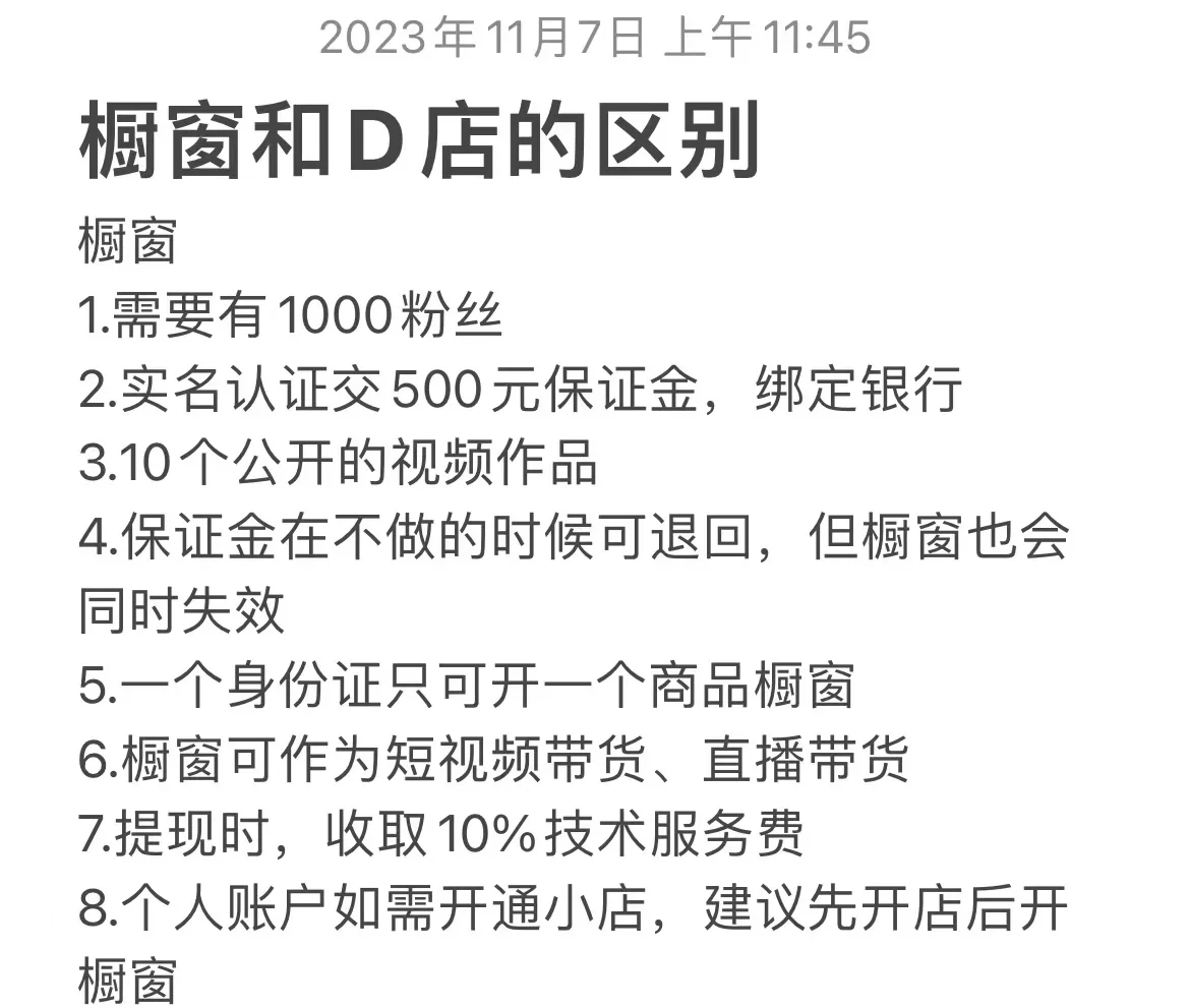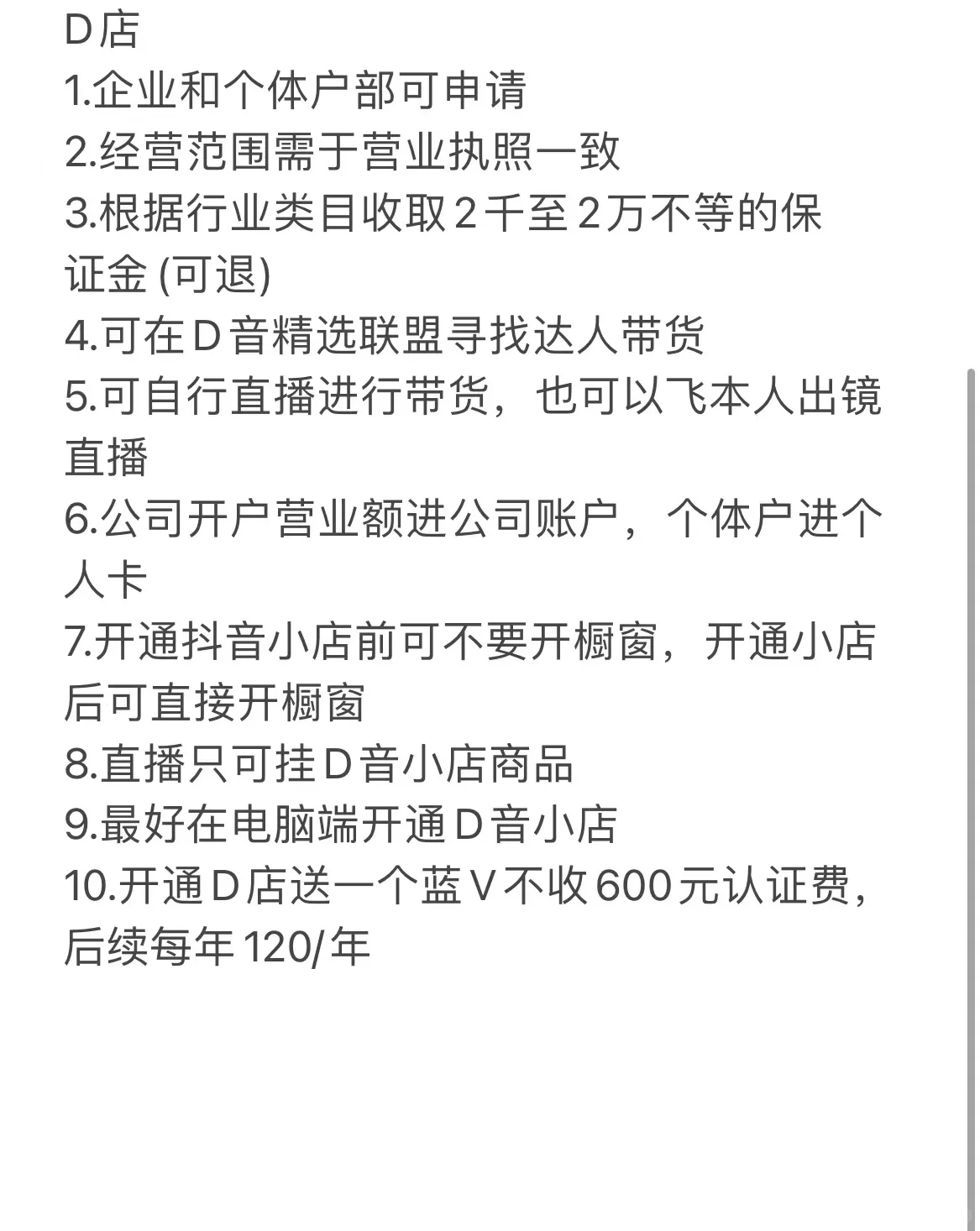 Showcase窗口 1.需要1000名追随者 2.实名认证,存款500元,绑定银行 3.10公开的视频作品 4.不使用时可以退还押金,但店面也将同时失效 5.一张身份证只能打开一个产品展示厅 6.展示案例可用于短视频销售和直播销售 7.提款时将收取10%的技术服务费 8.如果你需要为你的个人账户开一家小商店,建议先开商店,然后再开店面 D存储 1.企业和个人业务部门可以申请 2.经营范围必须与营业执照一致 3.按行业类别收取2000元至20000元不等的保险 证书押金(可退还) 4.你可以在D音乐选择联盟中搜索有影响力的人来推广产品 5.你可以直播自己的产品,也可以亲自飞到镜头前直播 6、公司开户及收入转公司账户、个人账户转个人卡 7.开抖音店前不要打开橱窗,开了店后直接打开橱窗 8.直播只允许悬挂DJ商店的产品 g.最好在电脑上开一家音乐商店 10、开D店,赠送蓝V不产生600元认证费,后续每年认证费120元
