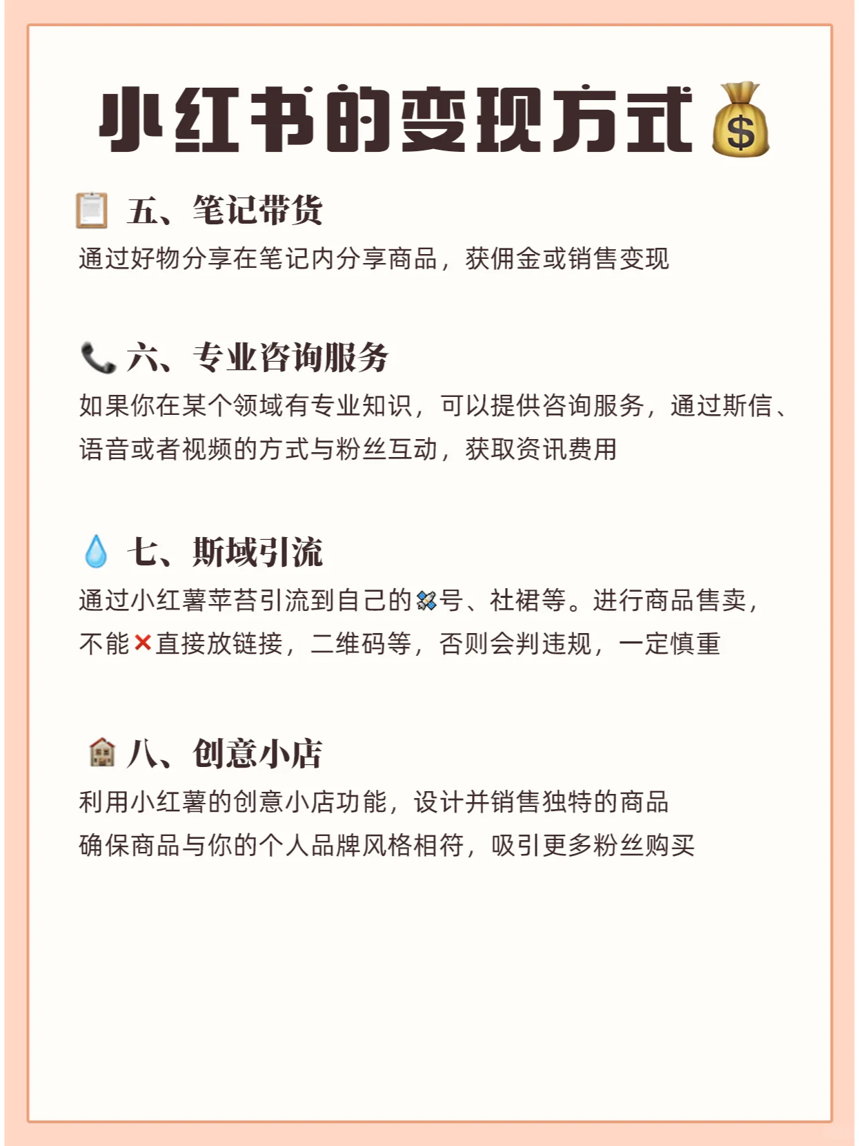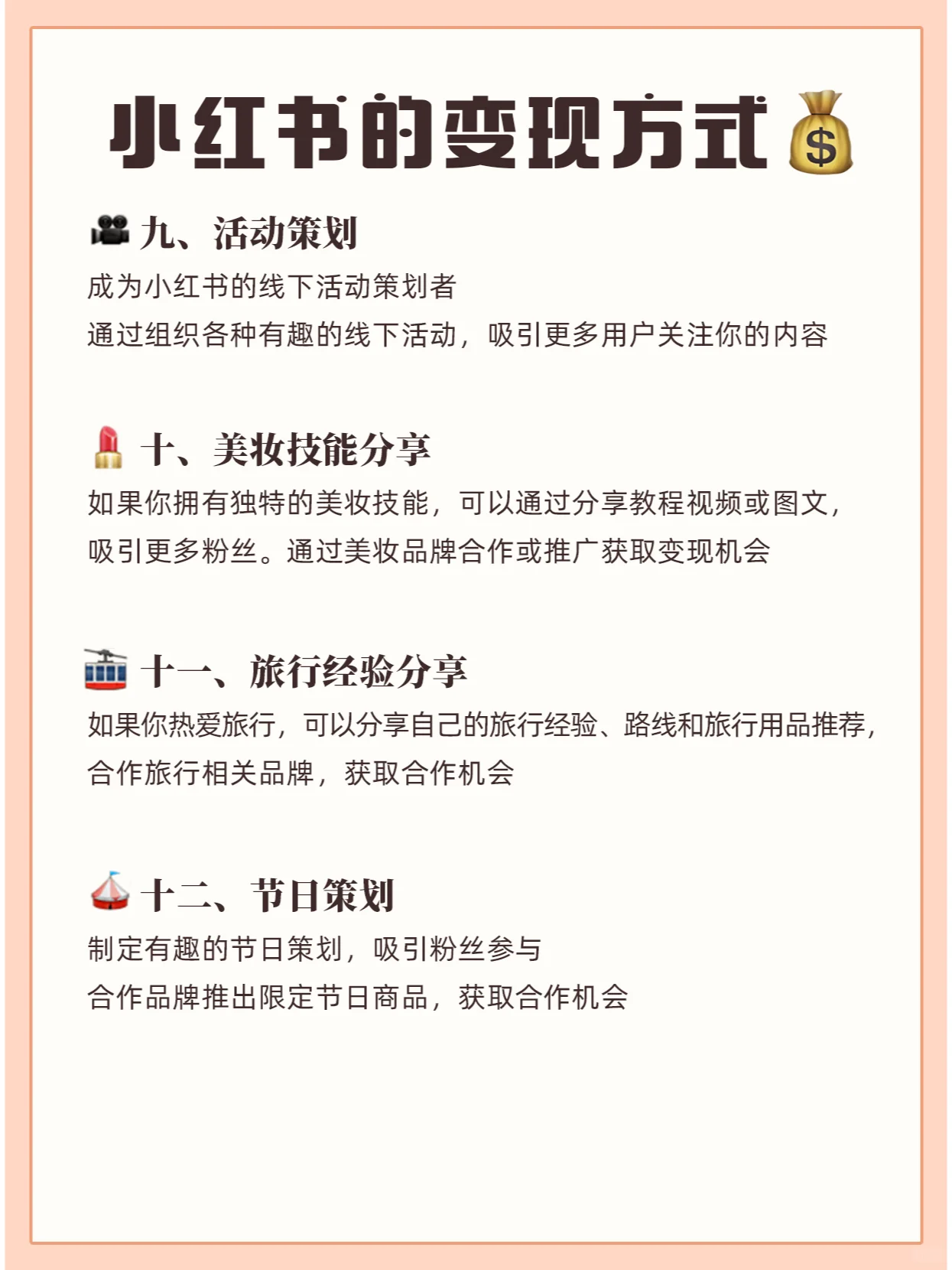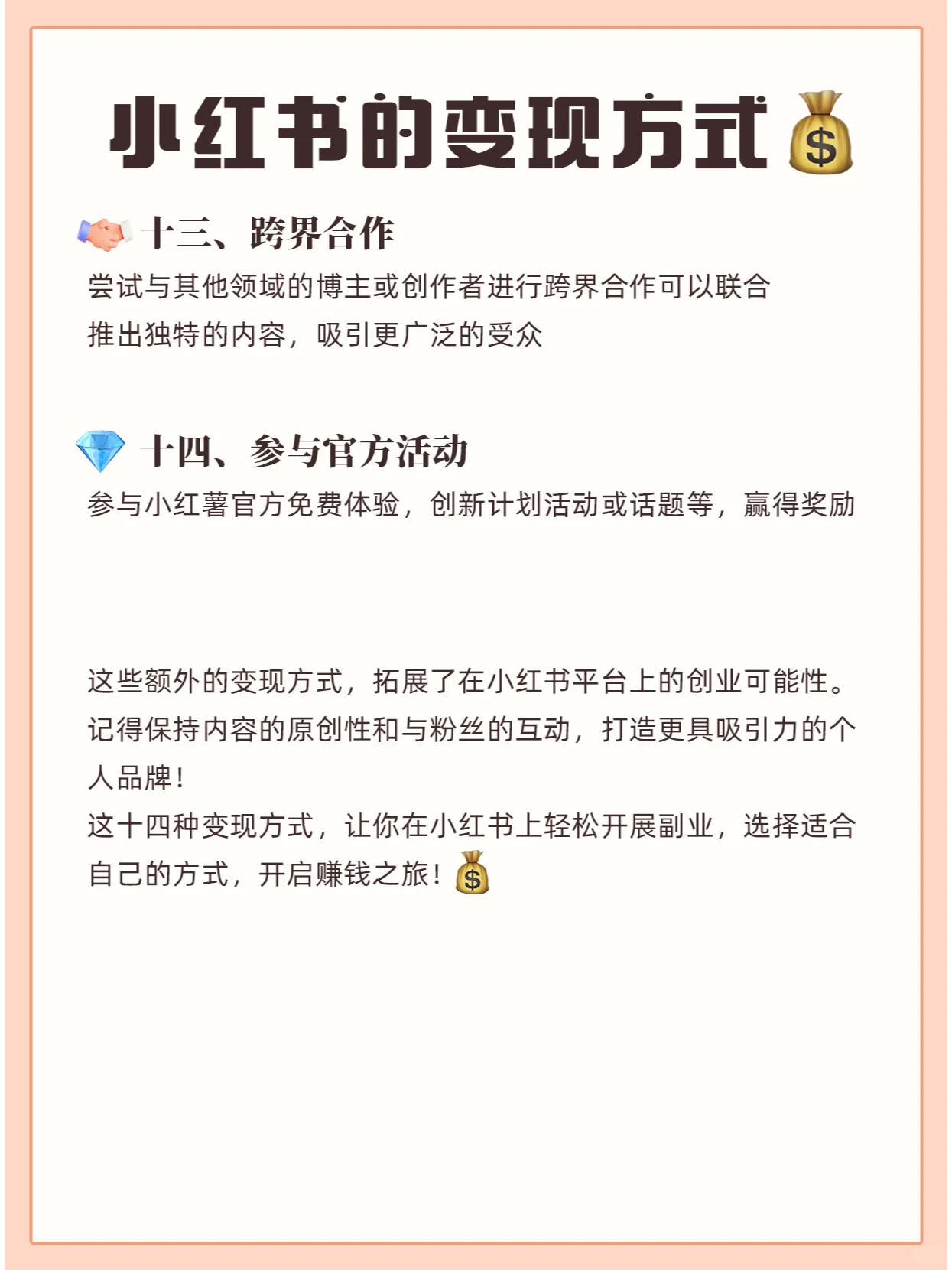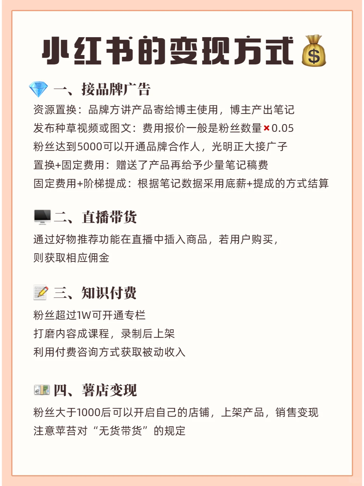 别盯着我看!小红书揭秘干货变现的秘密 1.接受品牌广告 资源交换:品牌方将产品发送给博主使用,博主制作笔记 发布种草视频或图片:成本报价通常基于粉丝数量✖ 零点零五 拥有5000名粉丝,您可以开设品牌合作伙伴并公开从事广告宣传 兑换+固定费用:赠送产品,赠送小笔代写费 固定成本+分级佣金:采用底薪+佣金的方式,根据票据数据进行结算 2.直播销售 通过好的产品推荐功能将产品插入直播,如果用户购买,将获得相应的佣金 3.知识付费 超过10000名追随者可以打开专栏 将内容打磨成课程,录制并上架 利用付费咨询方式获取被动收益 4.土豆店货币化 拥有1000多名粉丝后,你可以开设自己的商店,列出产品清单,并将销售额货币化 注意平台关于“无库存载货”的规定 5.记笔记出售 通过分享好的商品在笔记中分享产品,赚取佣金或将销售额货币化 6.专业咨询服务 如果你有某一领域的专业知识,可以提供咨询服务,通过微信、语音或视频与粉丝互动,获取信息成本 7.泗水排水 用红薯和苹果苔来吸引流量号码、社交着装等销售商品,不允许 直接放置链接、二维码等,否则会被判定为违规,请谨慎 8.创意小店 利用小红薯的创意商店功能设计和销售独特的产品 确保产品与您的个人品牌风格相匹配,吸引更多粉丝购买 9.活动策划️ 成为小红书的线下活动策划人 通过组织各种有趣的线下活动,吸引更多用户关注你的内容 10.美容技巧分享 如果你有独特的美容技巧,你可以通过分享教程视频或图文来吸引更多的粉丝 通过美容品牌合作或推广获得盈利机会 11.旅行经验分享 如果你喜欢旅行,你可以分享你的旅行经验、路线和旅行设备建议, 与旅游相关品牌合作,获得合作机会 12.节日策划 制定有趣的度假计划,吸引粉丝参与 合作品牌推出限量度假产品以获得合作机会 13.跨境合作 尝试与其他领域的博主或创作者进行跨境合作,可以共同推出独特的内容,吸引更广泛的受众 14.参加公务活动 参与官方免费体验、创新计划活动或红薯主题,赢取奖励