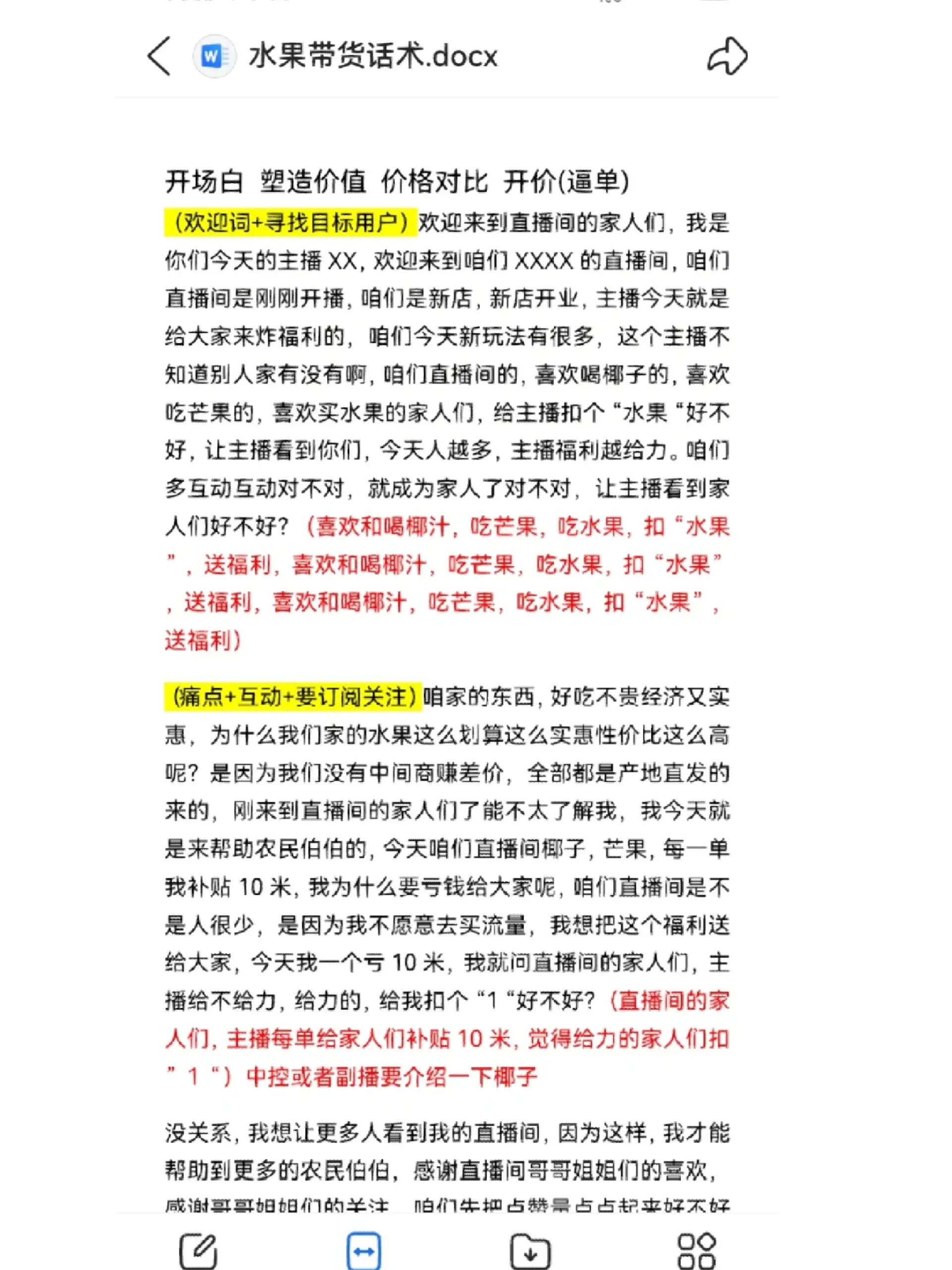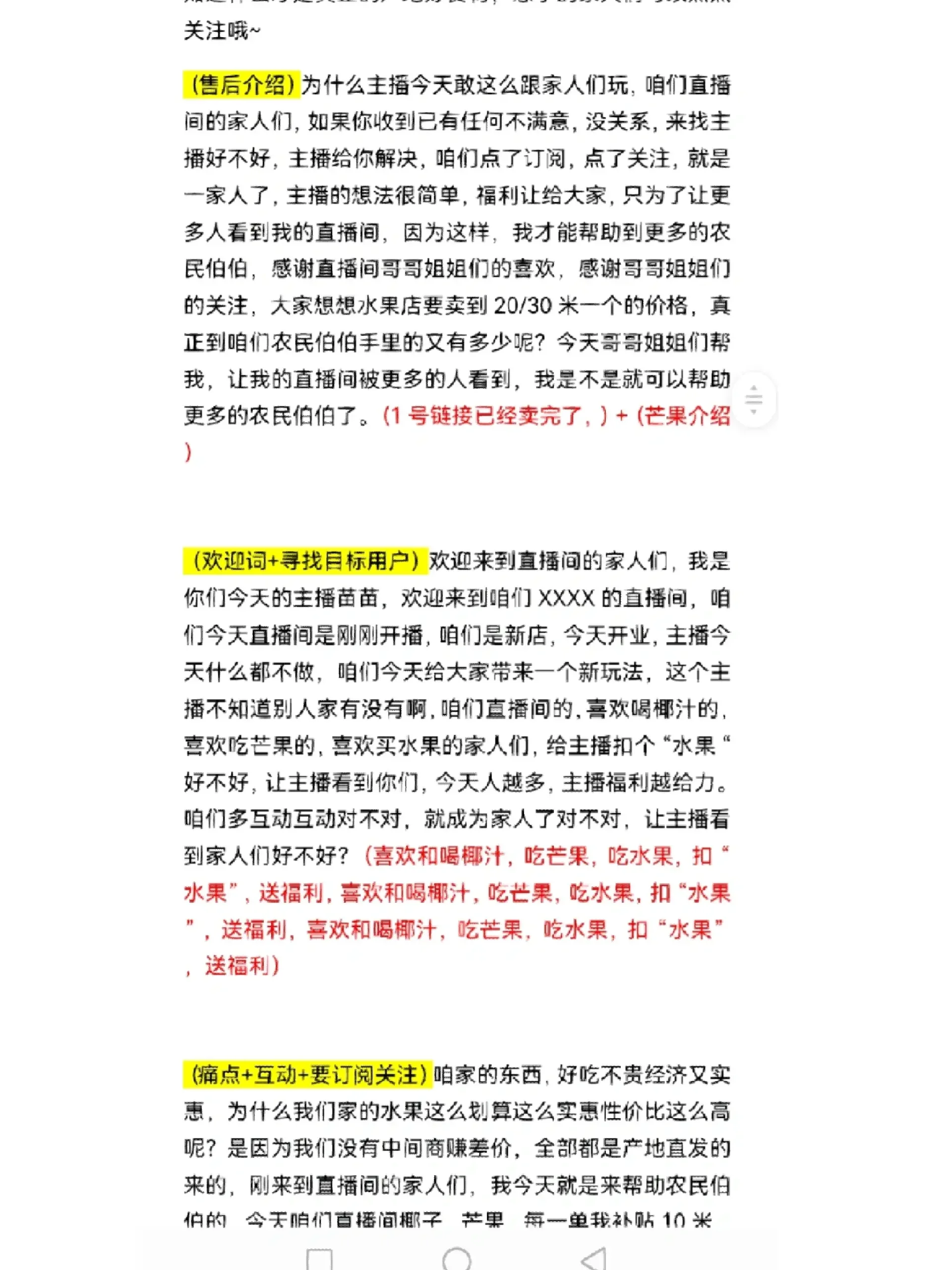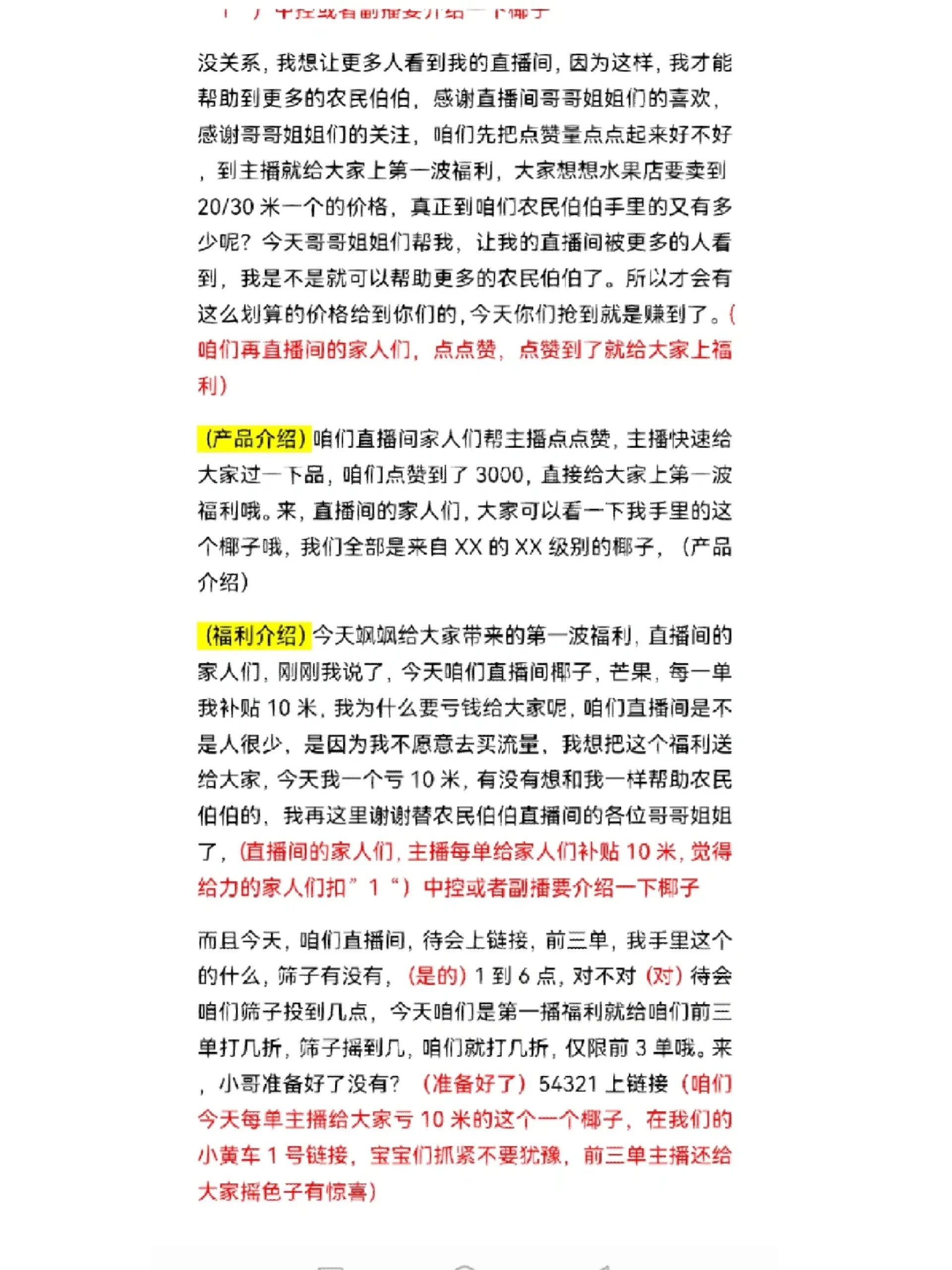 国带活血docx QQ浏览器文件服务 期初陈述塑造价值、比价、期初价格(强制订单) (欢迎语+寻找目标用户)欢迎来到直播间的家人。我是你们今天的主持人XX。欢迎来到我们XX XX的直播间。我们的直播间刚刚开门。我们是一家新店。新店开张了。今天的演讲者是为了给每个人一个好处。我们今天有很多新的比赛方式。演示者不知道其他人是否有。我们直播间的家人,喜欢喝椰子,喜欢吃芒果,喜欢买水果,你能给主播扣个“水果”吗让锚看到你。今天的人越多,主播富力就越牛。如果我们更多地互动,我们将成为家庭成员。不,让主播看看这家人,好吗(点赞喝椰汁,吃芒果,吃水果,扣“水果”。送福利,点赞喝椰子汁,吃芒,吃水果扣除“水果”,送福利,喜欢喝椰子汁、吃芒果,喝水果,扣”水果“,送福利) (痛点+互动+需订阅关注)我们的产品美味、实惠、实用。为什么我们的水果如此划算原因是我们没有中间商来赚取差价。所有这些都直接来自原产地。刚来到工作室的家人不能很好地理解我。我今天来帮助农民叔叔。今天,我们在工作室里为椰子和芒果补贴10米。为什么我要向所有人赔钱工作室里有少数人吗因为我不愿意买流量。我想把这个福利带给每个人。今天,我输了10米。我问演播室里的家人,主持人会不会给我真棒,如果真棒给我一个“1”(直播间的家庭成员,主持人每次补贴10米,给力的家庭成员扣“1”)中控或副播介绍椰子 没关系,我想让更多的人看到我的直播间,因为这就是我可以帮助更多农民的方式。感谢直播间里的兄弟姐妹们的爱和关注。让我们先统计一下点赞数,当我们到达主播时,给每个人第一波福利。想想看,当水果店每个售价20/30米时,我们手中真正有多少农民今天,我的兄弟姐妹们帮助我让我的直播间被更多的人看到。我能帮助更多的农民吗。这就是为什么我们为您提供如此划算的价格。如果你今天抓住它,你会获利的。(让我们在直播间里喜欢我们的家人,一旦他们喜欢,我们就会给每个人福利。) (产品介绍)在我们的直播间里,人们给主播点赞。主播快速为大家点评产品,当我们点赞3000的时候,我们会直接给大家第一波福利。加油,直播间的家人们,大家可以看看我手里的椰子。我们都是来自XX的XX级椰子,(产品介绍)