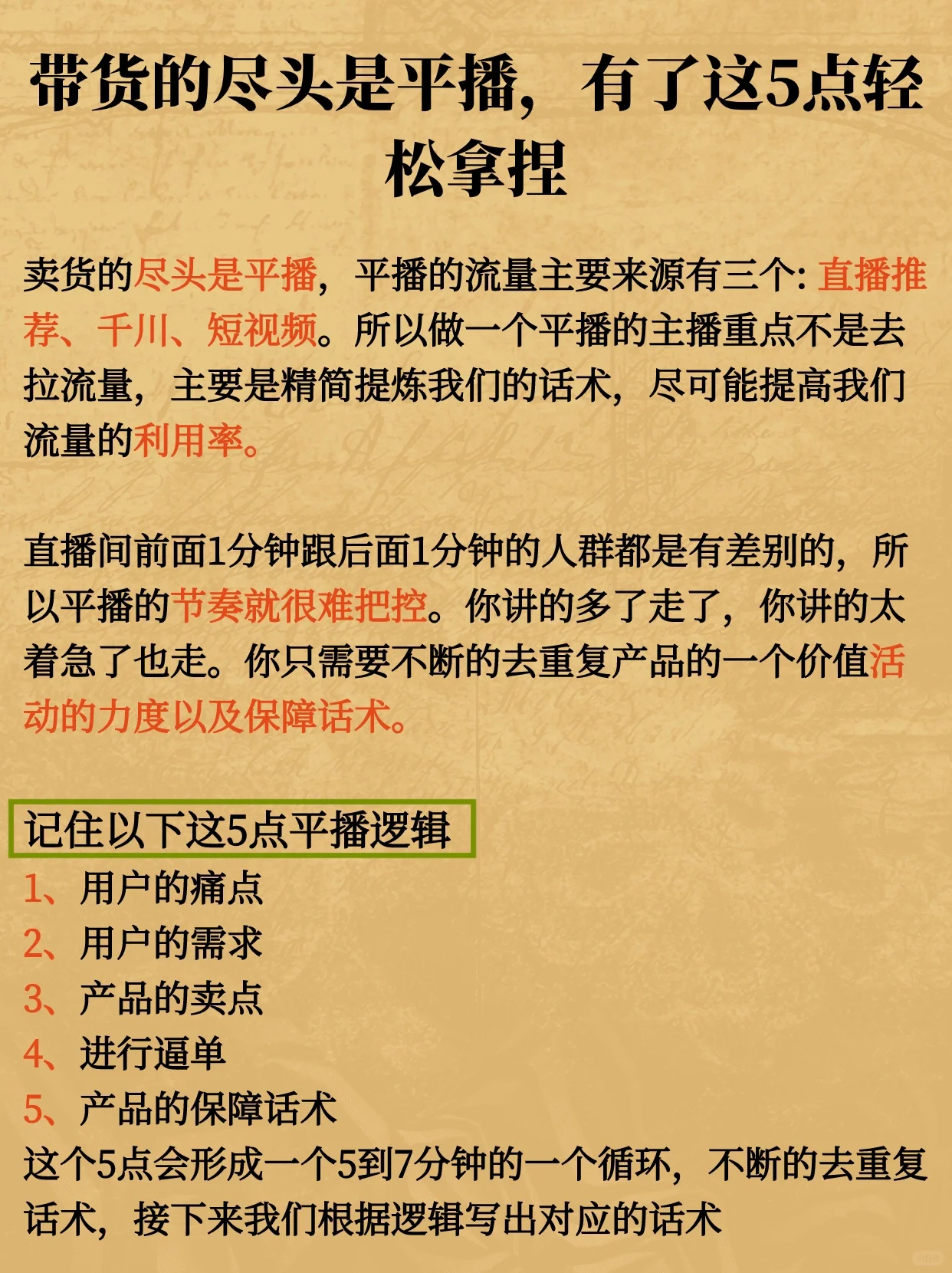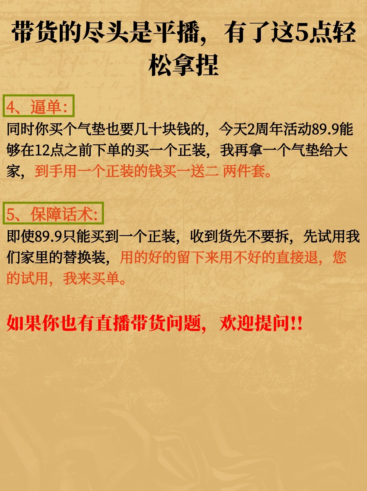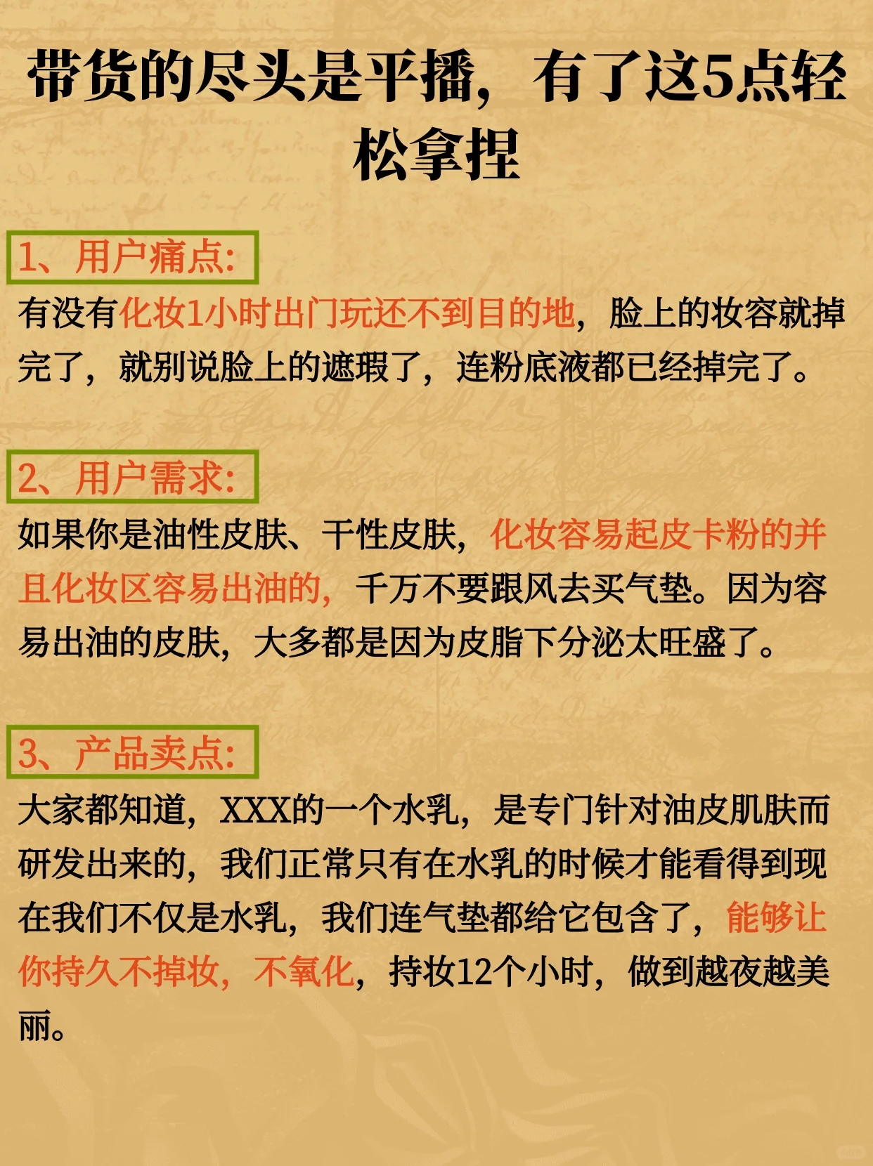 卖货的终点是平博,平博的流量主要来自三个来源:直播推荐、千川、短视频。所以做直播的关键不是吸引流量,而是精简和提炼我们的语言,最大限度地利用我们的流量。 直播的第一分钟和最后一分钟人群有差异,很难控制直播的节奏。你说得太多就走了。你说话太快,也离开了。你只需要不断重复产品价值活动的强度,并确保语言。 记住以下5点,以获得平坦的游戏逻辑 1.用户痛点 2.用户需求 3.产品卖点 4.执行强制命令 5.产品保证书 这5个点将形成5到7分钟的循环,不断重复脚本。接下来,我们将根据逻辑编写相应的脚本 1。用户痛点: 如果你一个小时没化妆,还没到目的地,脸上的化妆品就没了,更不用说脸上的遮瑕膏了,连粉底都没了。 2。用户需求: 如果你是油性或干性皮肤,化妆品容易在化妆区沾粉和油,不要跟风购买气垫。因为皮肤容易出油,大多是由于皮下皮脂分泌过多。 3。产品卖点: 众所周知,XXX的水乳是专门为油性皮肤开发的。通常情况下,我们只有在水乳中才能看到它。现在,我们不仅有水乳,还有气垫,可以帮助你在不脱落或氧化的情况下持续化妆12小时,实现更美丽的夜晚。 [4。强制单个: 同时,购买一个气垫也要花费几十元。对于今天的两周年纪念活动,如果你能在中午12点之前订购一套正式服装,我会再给你一个气垫,然后用正式服装的钱买一套一送二。 5。担保脚本: 即使89.9只能购买一套正式服装,也不要在收到货物时将其拆开。先在家里试试我们的替代品,保留好的,如果不好就退货。我会为你的审判买单。