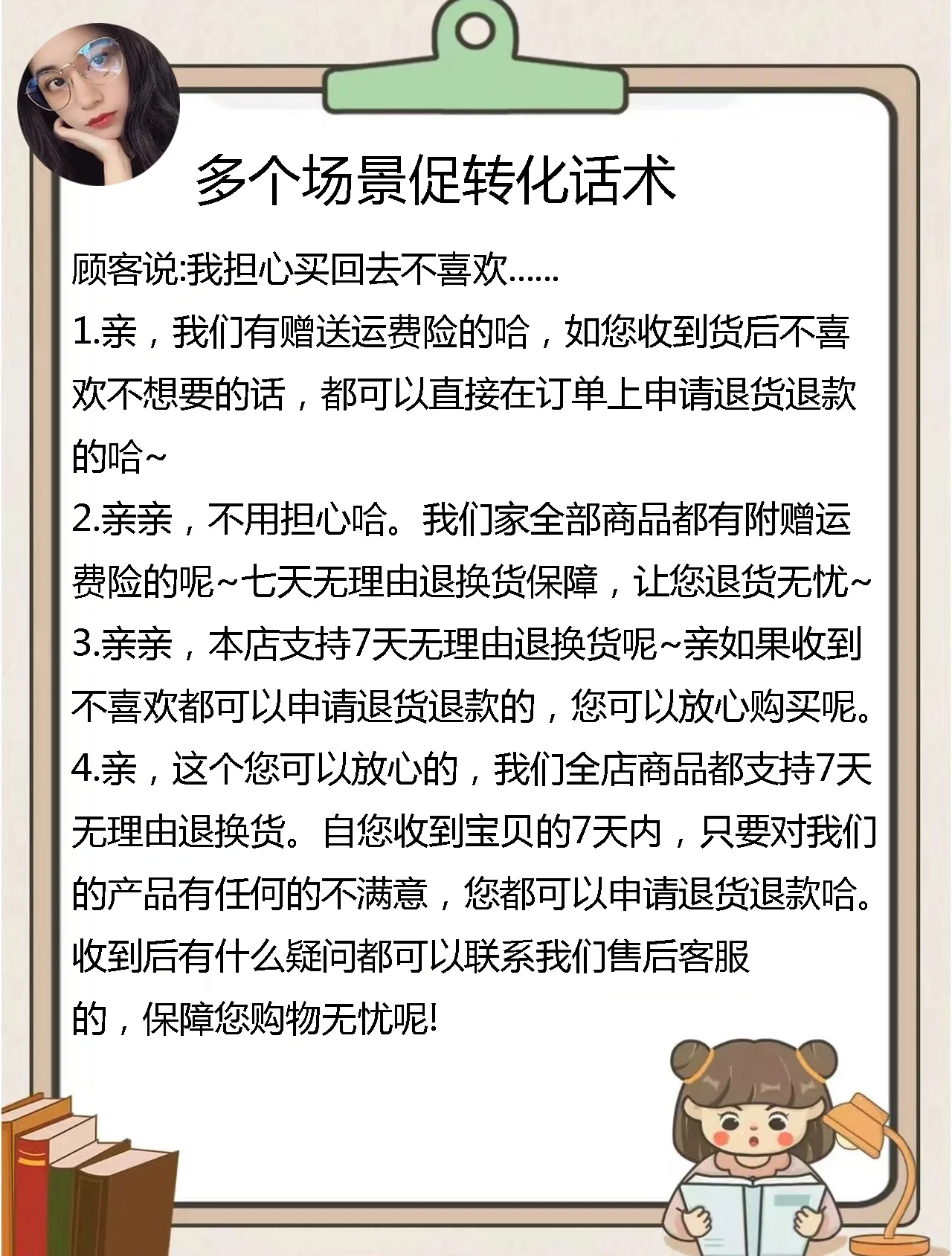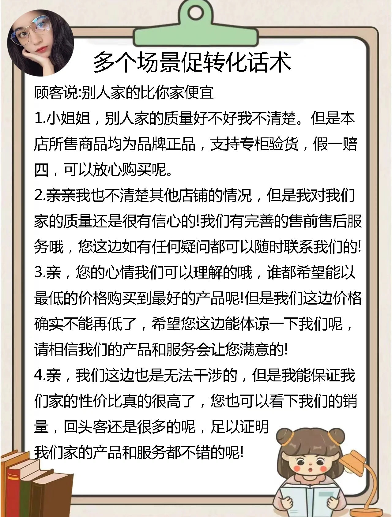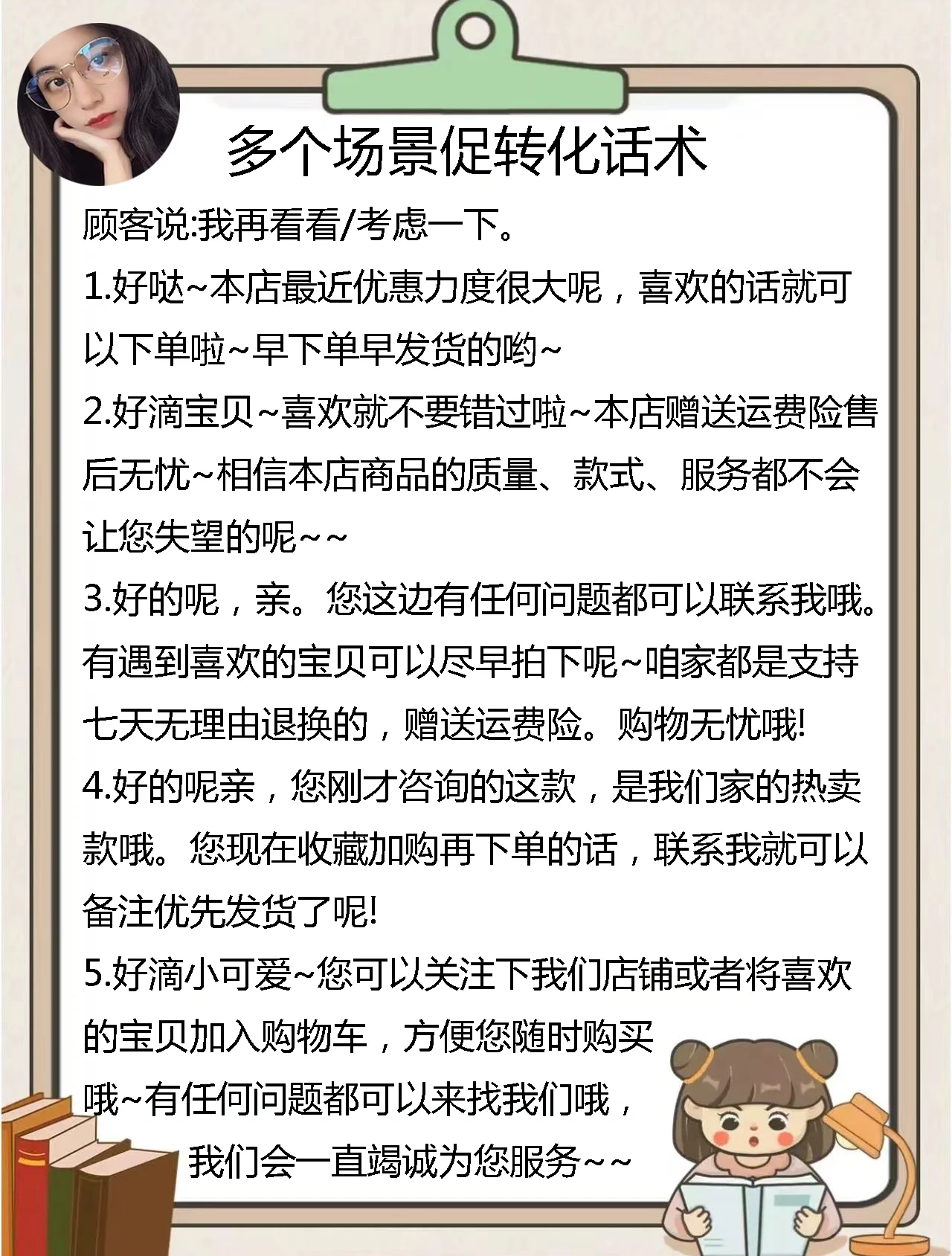 在开店的过程中,我们经常会遇到各种类型的顾客 在家庭中,他们要么犹豫,要么攀比,要么只是来散散步。那个 如何使用适当的语言指导客户在不同场景下下单并提高绩效 转化率非常重要!今天,Vivi就要和大家分享一个多场景下促进转化的脚本。如果你是卖家、客服经理或电子商务客服代表,那么你必须抓住它!,记住,每个客户都是独一无二的,灵活使用你的语言,让他们感受到你的真诚和专业,转化率自然会上升!
