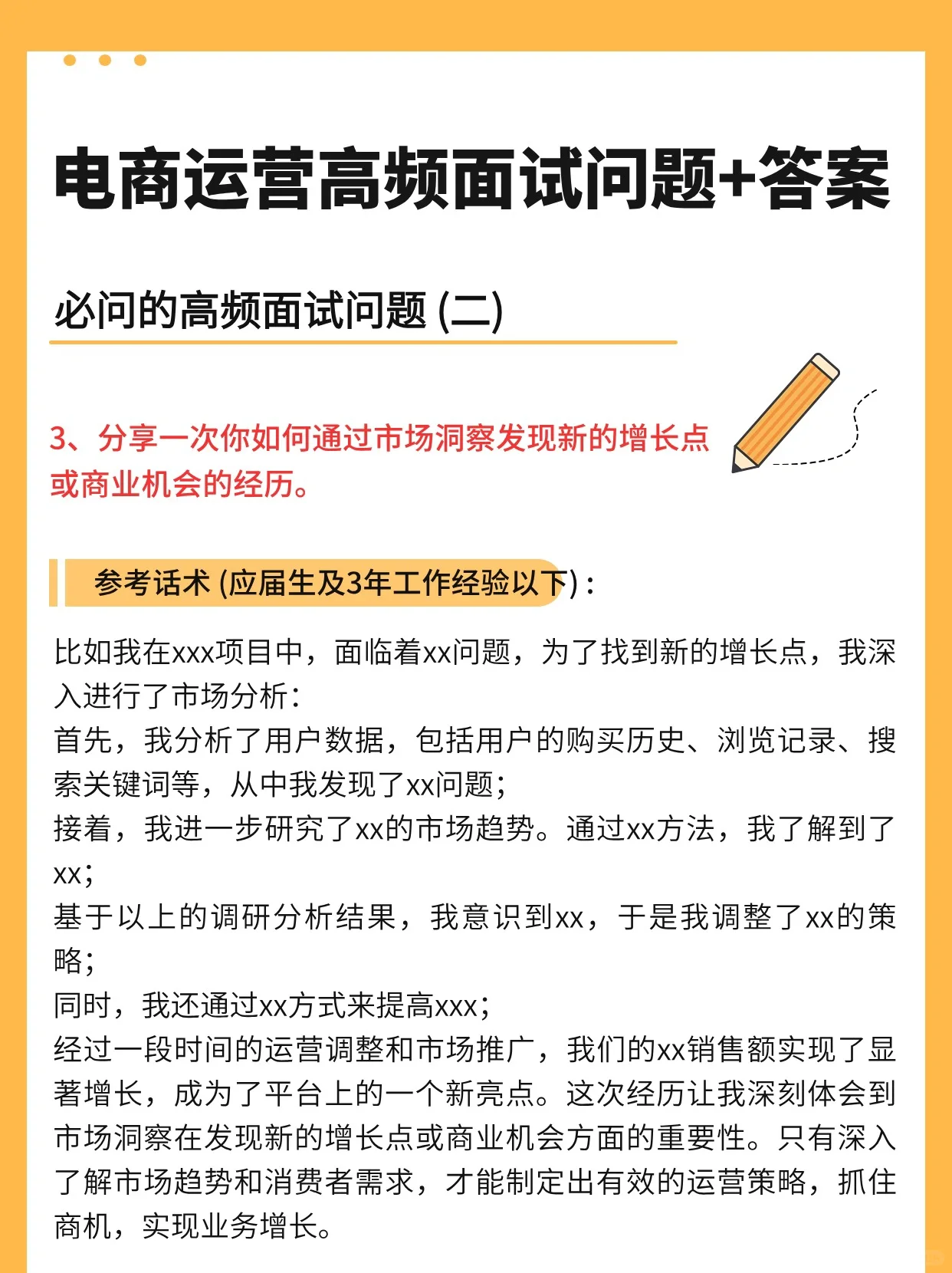 (持续改进)纯粹的干货分享 常见问题,翻转图片回答,详细回答: 1.您如何看待内容营销和广告营销在电子商务推广中的作用促销策略是什么 2.您如何利用市场洞察力来指导电子商务运营策略的调整 3.分享你如何通过市场洞察发现新的增长点或商机的经验。 4.请描述您使用数据分析优化产品推广效果的经验。 5.您是如何定期跟踪和分析过去项目中的市场趋势和竞争对手趋势的