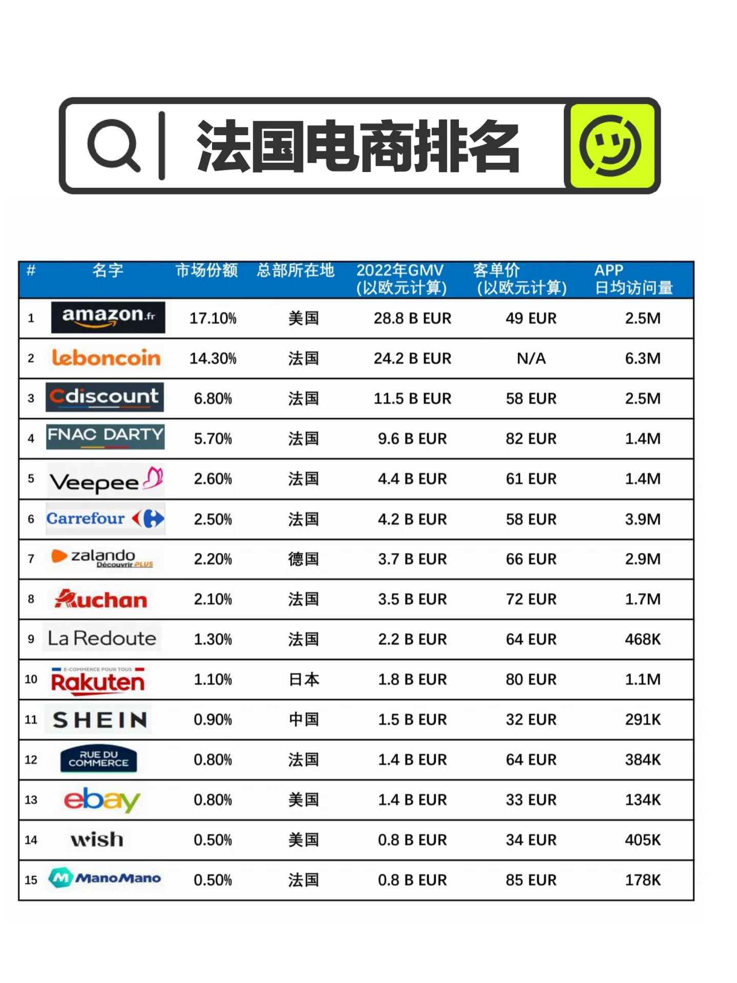 ? 亚马逊(市场份额17.1%)是法国电子商务市场的领导者,提供广泛的产品和快速服务。 ? Leboncoin(市场份额14.3%)是法国的一个二手交易平台,用户可以在这里低价出售闲置物品,购买二手商品,并恢复闲置物品。 ? Cdiscount(市场份额为6.8%)是法国当地的一个电子商务平台,提供各种产品优惠券,允许消费者以更优惠的价格购买商品。 ? Fnac Darty(市场份额5.7%)是一家全球知名的科技和家电专业零售商,提供最新的科技产品和家电。 ? Veepee(市场份额2.6%)是法国的在线折扣促销平台之一,提供品牌产品和特别活动,鼓励消费者购物。 ? 家乐福(市场份额为2.5%)是一家成立于法国的超市电子商务公司,采购食品、饮料和各种日常用品,以节省消费者的时间。 ? Zalando(市场份额为2.2%)是一个时尚电子商务平台,提供包括服装、鞋子和珠宝在内的时尚产品。 ? 欧尚(市场份额2.1%)是一个法国连锁超市品牌,提供各种产品,如食品、饮料和日用品。 ? La Redoute(市场份额为1.3%)是法国的一家在线时尚零售商,提供各种精心设计的服装和家居用品。 ? SHEIN(市场份额0.9%)是一个电子商务平台,提供各种时尚、优质、实惠的产品。 ? Rue du Commerce(市场份额0.8%)是法国的一家在线零售商集团,提供从电子产品到家居装饰的各种产品。 ? 易趣法国(市场份额为0.8%)是世界上最大的综合电子商务公司之一,提供无数的产品来满足各种客户需求。 ? 乐天法国(市场份额0.8%)是一家来自日本的在线购物网站,提供来自世界各地的数千种顶级电子产品、家具、配件和其他产品。 ? Wish(市场份额为0.5%)是一家美国在线购物中心平台,提供各种各样的产品。 ? ManoMano(市场份额为0.5%)是法国的一家在线家装和建材平台,提供多种家装产品。