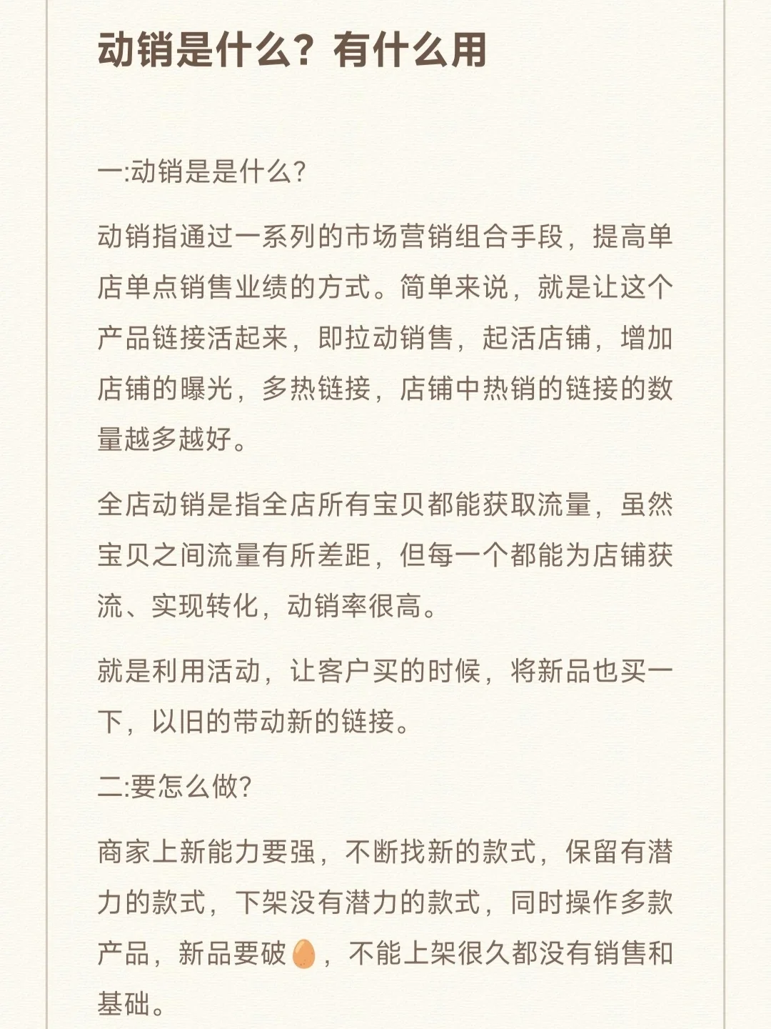 1:什么是动态销售 动态销售是指运用一系列营销策略来提高单店单点销售业绩。简单地说,就是把产品环节活起来,也就是带动销售,激活店铺,增加店铺曝光度,有更多的热点环节,店铺里的热销环节越多越好。 全店销售额是指商店中所有接收流量的商品。尽管商品之间的流量可能存在差异,但每个商品都有助于商店的流量和转化,从而获得高销售率。 它是利用活动来鼓励客户购买新产品,利用旧产品来推动新的链接。 2:我们该怎么办 商家需要有强大的新品发布能力,不断寻找新的款式,保留有潜力的款式,去除没有潜力的款式以及同时运营多个产品。新产品需要被打破吗,没有销售额和基础,就无法长期上市。