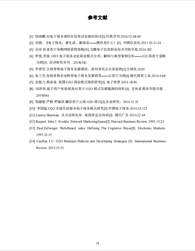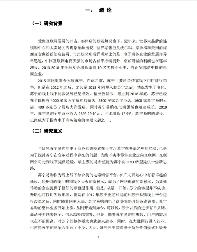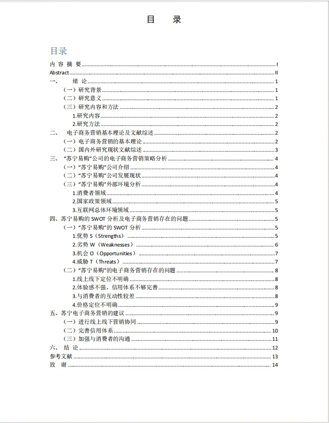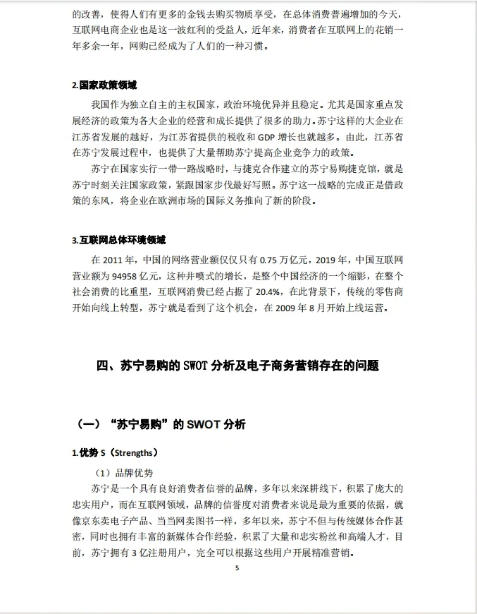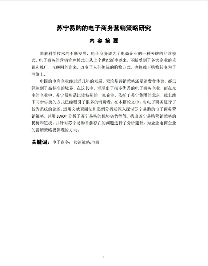 题目:苏宁电子商务营销策略研究 目录 内容摘要一 摘要二 1、 引言1 (1) 研究背景1 (2) 研究意义1 (3) 研究内容与方法2 1.研究内容2 2.研究方法2 2、 电子商务营销基础理论与文献综述2 (1) 电子商务营销基础理论2 (2) 国内外研究现状文献综述3 3、 苏宁电子商务营销策略分析4 (1) 苏宁易购公司简介4 (2) 苏宁易购4公司发展现状 (3) 苏宁易购外部环境分析4 1.消费者领域4 2.国家政策领域5 3.互联网的整体环境5 4、 苏宁易购SWOT分析及电子商务营销中存在的问题5 (1) 苏宁易购SWOT分析5 1.优势5 2.弱点6 3.机会O(机会)7 4.威胁7 (2) “苏宁网”电商营销存在的问题8 1.线上线下定位不清8 2.经验薄弱,信用体系不完善8 3.与消费者互动不畅8 4.价格定位不明确9 5、 苏宁电商营销建议9 (1) 在线和离线营销协作9 (2) 改善信用体系10 (3) 加强与消费者的沟通11