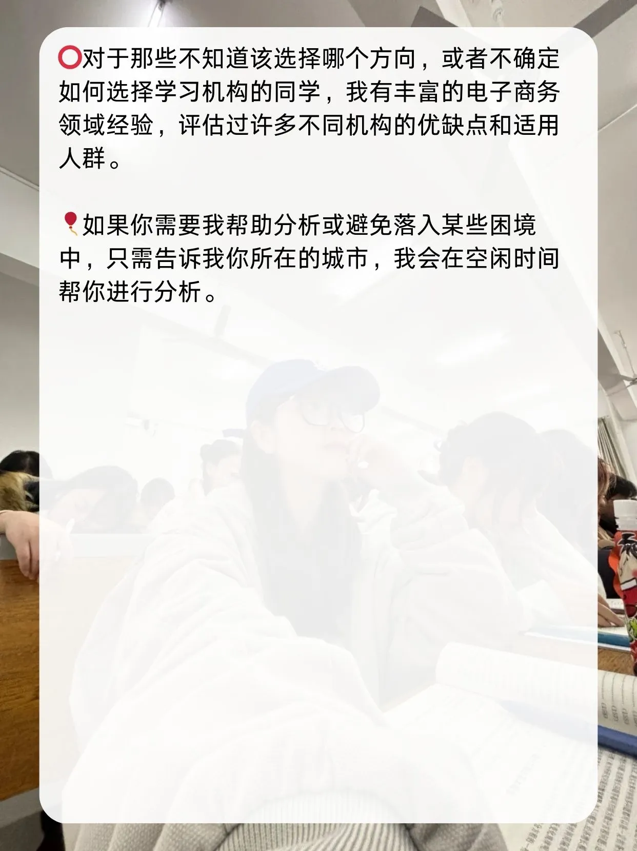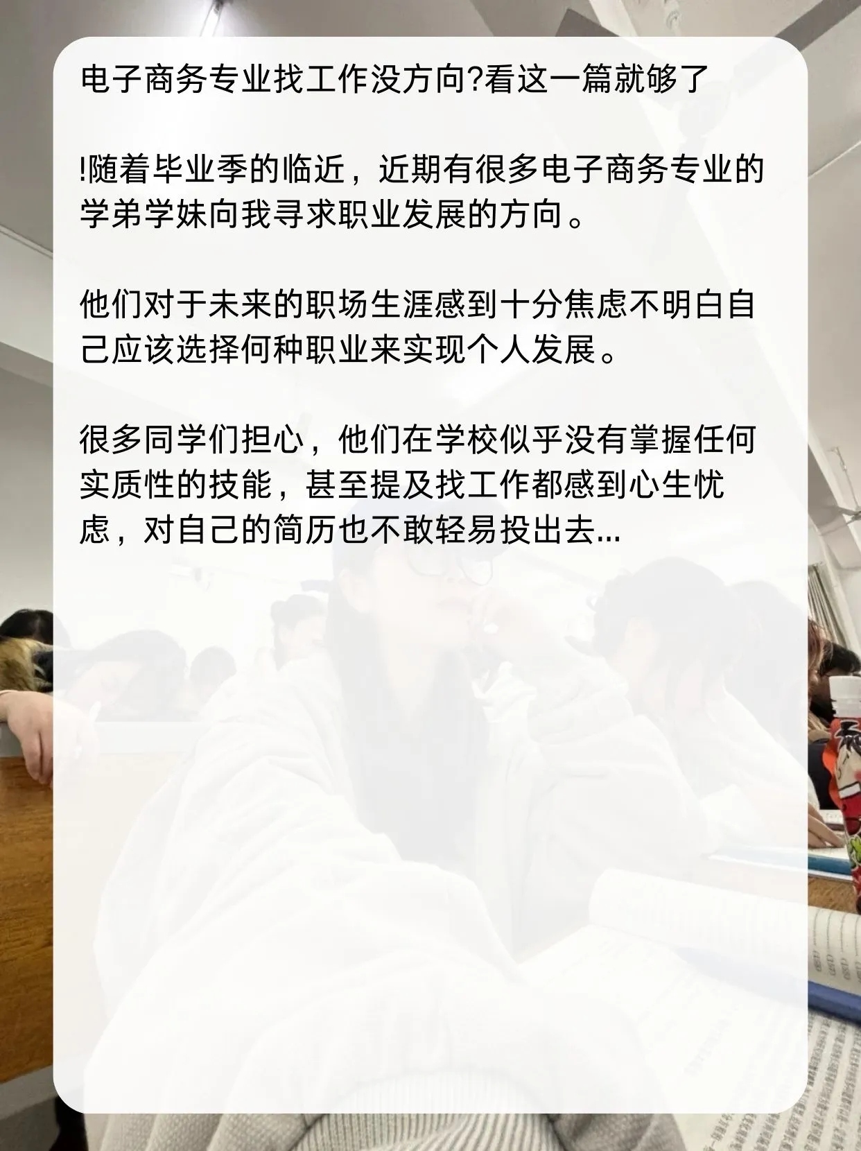 在电子商务专业找工作没有方向吗这就足够读这本了 ! 随着毕业季的临近,许多电子商务专业的年轻学生最近一直在向我寻求职业发展方向。 他们对未来的职业感到非常焦虑,不知道应该选择什么职业来实现个人发展。 许多学生担心自己在学校里似乎没有掌握任何实质性的技能,甚至在求职时也感到担忧,不敢轻易提交简历 今天,我将与大家分享电子商务专业应届毕业生可能选择的几个就业方向,以便为电子商务专业的年轻学生提供一些参考。我希望为你即将到来的职业生涯找到一个明确的方向: 电子商务运营: 包括网店运营、数据分析、内容运营等; 电子商务规划: 包括活动策划、产品策划、运营策划等; 在线营销: 包括搜索引擎优化、社交媒体营销、电子邮件营销等; 供应链管理: 涵盖采购、库存管理、物流配送等; 客户服务管理: 包括售前咨询、售后服务投诉处理等; 视觉设计: 包括页面设计、广告设计、用户界面设计等; 数据分析: 可以参与用户行为分析、销售预测、市场趋势分析等。 ? 在学校里,许多电子商务专业的学生可能会觉得他们没有学到很多实用知识,因为学校的教学往往倾向于理论方面。即使是认真学习的学生,也只能掌握一些基本的概念和原则,更不用说了 那些没有尽力学习的人可能对基本理论掌握不够 如果你打算在毕业后进入电子商务行业,我强烈建议你选择一个特定的方向进行深度学习,努力了解和掌握该领域的知识,并积累该领域的经验。这样,你就可以达到提高简历亮点的目的,并轻松获得优秀公司的许多实习机会。 对于那些不确定选择哪个方向或如何选择学习机构的学生,我在电子商务领域有着丰富的经验,并评估了许多不同机构的优势、劣势和目标受众。