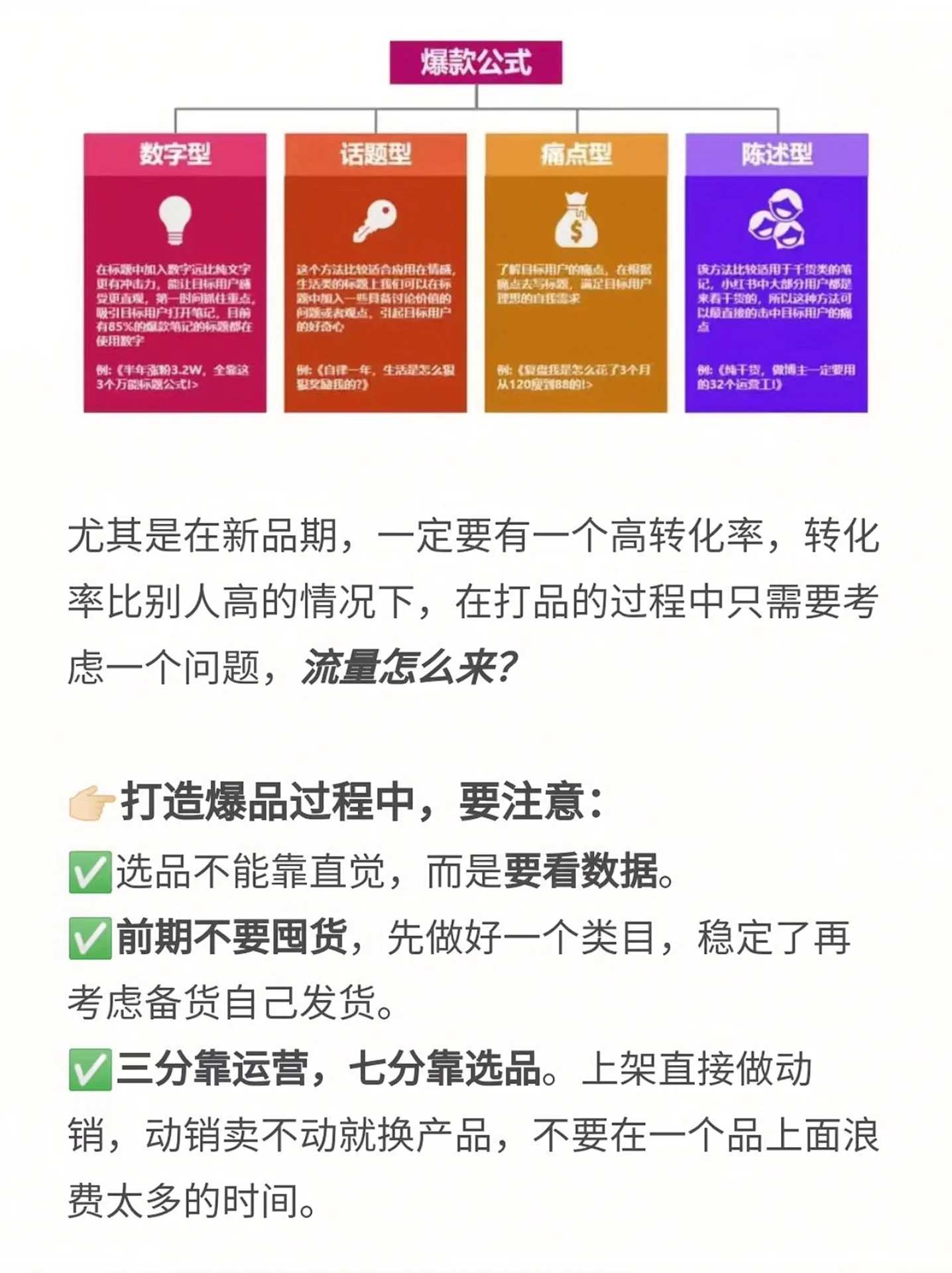 本文适用于:电商运营/门店运营/品牌经营,一篇爆品打造策略在主阶段,建议存储和收集代码 我之前已经和你分享了6个选择爆炸性产品的技巧 大石路 哪些特定类别的产品容易爆炸在了解了产品的选择之后,为什么今天不直接列出呢制造爆炸性产品的方法 需要注意的事项 想要利用大促打造一波爆品的品牌/商家,赶紧过来,一块手表搞定一切 本文将爆品创作的方法论分为三个阶段:入门阶段和赛马阶段,第三阶段为矿坑生产阶段 进入水池阶段:开始排水 专注于行业分析/产品选择和测试/支付分流/销售突破 赛马阶段:形成赛马机制 专注于对标竞争对手/优化三个费率(点击率、转化率和额外购买率)/预算规划/拉伸排名 矿坑生产阶段:做好产品维护 关注数据维护/活动节奏/内容营销/用户策略 爆炸性产品是制造出来的,而不是销售出去的。创造一两个爆炸性产品有时依赖运气,但如果你想继续生产爆炸性产品,你必须依赖一个完整的模型和系统 把关键步骤做好,反复重复和复习,下一个要订购的爆炸性产品可能是您
