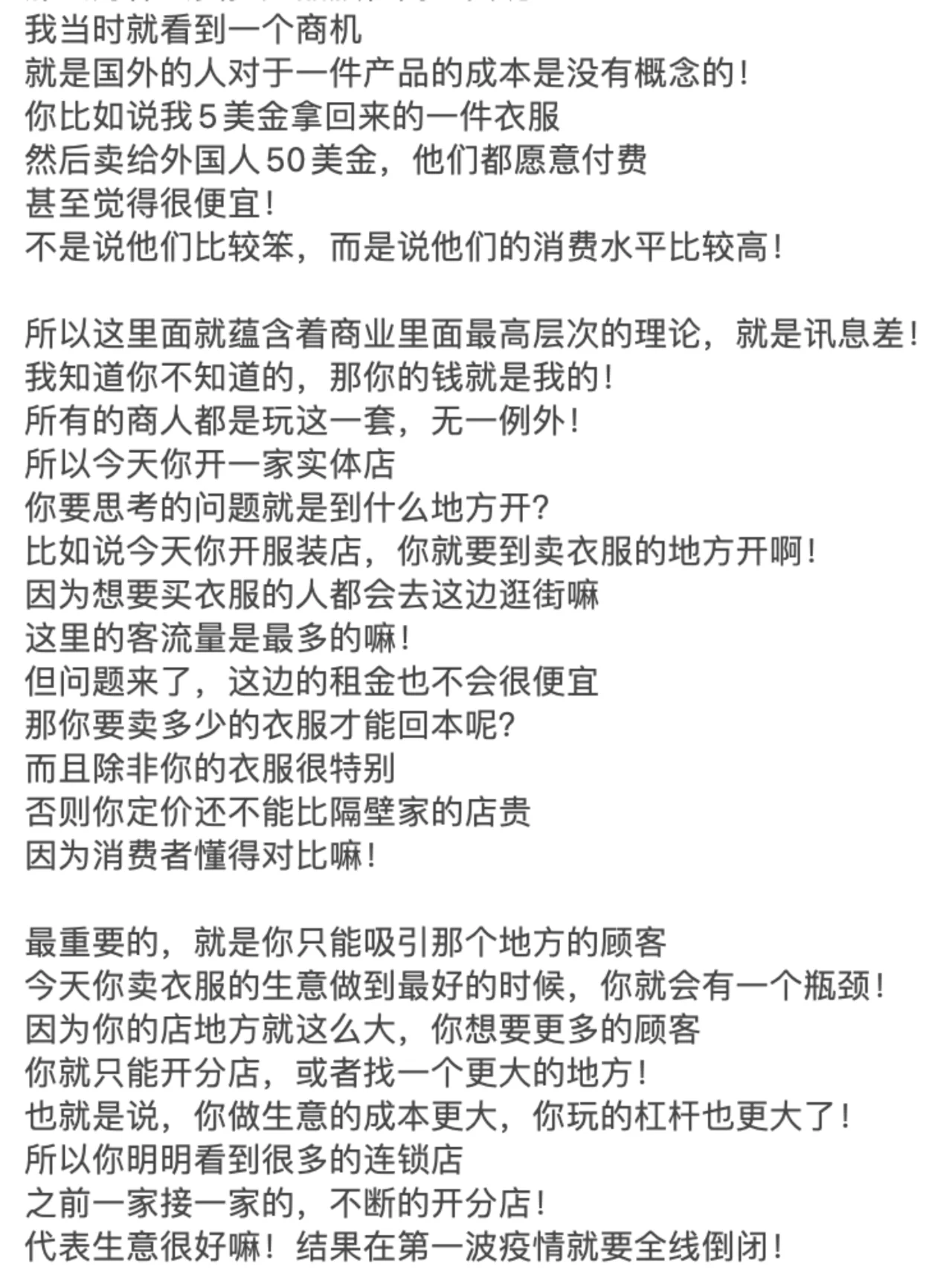 ? 如果你想从头开始,通过在线做生意赚钱 你一定要看到这张纸条的末尾! 许多兄弟姐妹,包括我的一些商业朋友 每个人都让我解释一下如何做电子商务! 因为最近每个人都收到了很多关于做电子商务的广告 我很好奇2024年这项业务还能做吗 - ? 我反过来问他们,你认为在网上卖东西容易赚钱吗 你开实体店更容易赚钱吗 近年来,由于疫情 我还没见过谁能通过经营实体店发大财! 因为很多人的习惯已经转移到了网上 在线消费、在线娱乐和在线交流 甚至在线解决生理需求! - ? 之前的新闻没有说有数学老师 在成人网站上教数学,年收入超过700万元 因此,毫无疑问,任何与互联网相关的业务都可以做! 因为你首先选择了正确的趋势! 但为什么很多人说现在做电子商务越来越难了 事实并不是电子商务变得越来越难做 但这只是传统的电子商务越来越难做了! 所以你必须了解整个行业的基本逻辑! - ? 做生意无非是四个字:低买高卖! 如果你想在网上销售东西,只需要解决三个问题 那么,为什么我有资格告诉你这些事情呢 因为我的第一笔生意是做所谓的传统电子商务 我刚刚了解了传统电子商务的前几大趋势 还有那些制造人生第一桶金的人! - ? 所以我不会告诉你电子商务中片面的新手村问题 但直接与大家毫无保留地分享整个商业模式! 我也挣扎了很久,毕竟这是一个大多数人都不知道的商业秘密! 但我还是选择大声说话,所以每个人都必须竖起大拇指! 当你的财富在六个月后变得免费时 你可以在播放列表中检索到这张纸条,然后回来祝贺我! - ? 首先,在做生意的时候,我们必须思考一个问题,那就是定位! 你想往上游走还是往下游走 上游是从头开始构建产品的人 下游是那些从有产品到没有产品的人! 所以我们都知道上游是最赚钱的 因为你是产品和服务之母! 产品是你开发和生产的 每个人都在找你来提货! - ? 这对大多数人来说是不现实的,对吧 因为他们没有启动资金 没有任何技术开发成为该产品的上游! 所以当时我也有同样的想法 所以我选择了无利可图的手法,用空手套白狼 这是关于这些产品的低买高卖! - ? 我只需要以很低的价格从这些供应商那里购买 然后通过包装该产品并转售给市场 中间的差价就是我的利润! 我相信每个人都能理解这一点,因为实体业务也是这样做的! 那么,为什么要在网上销售产品呢 当时我看到了一个商机 外国人对产品的成本没有概念!