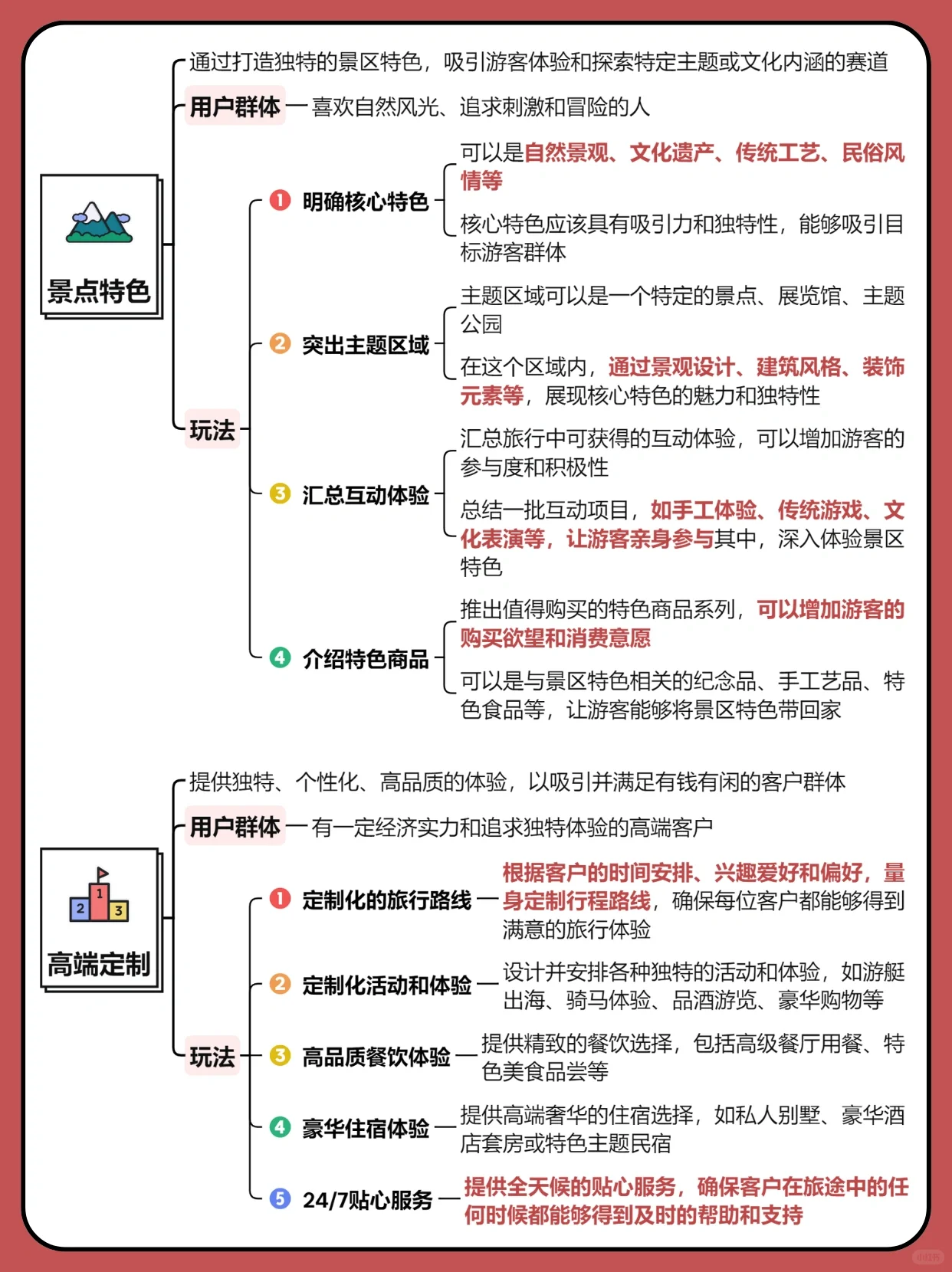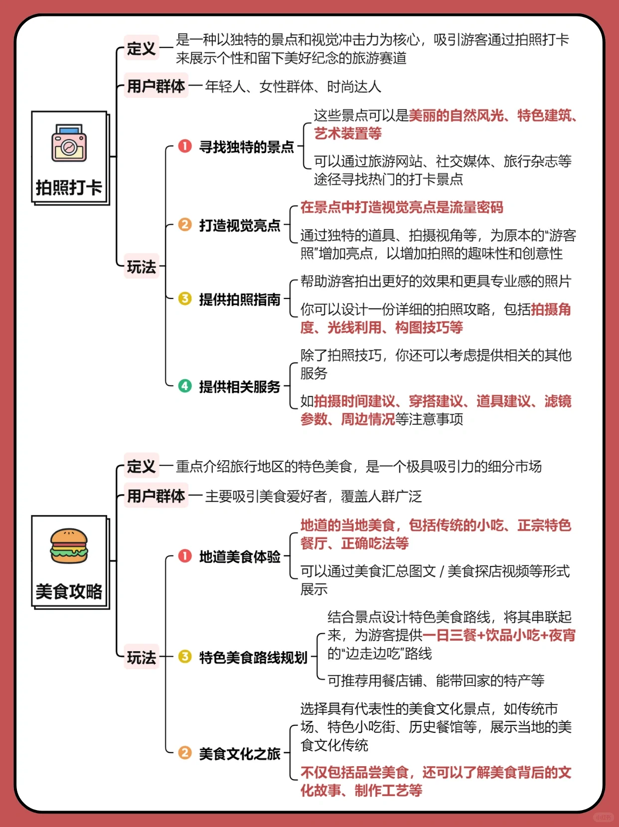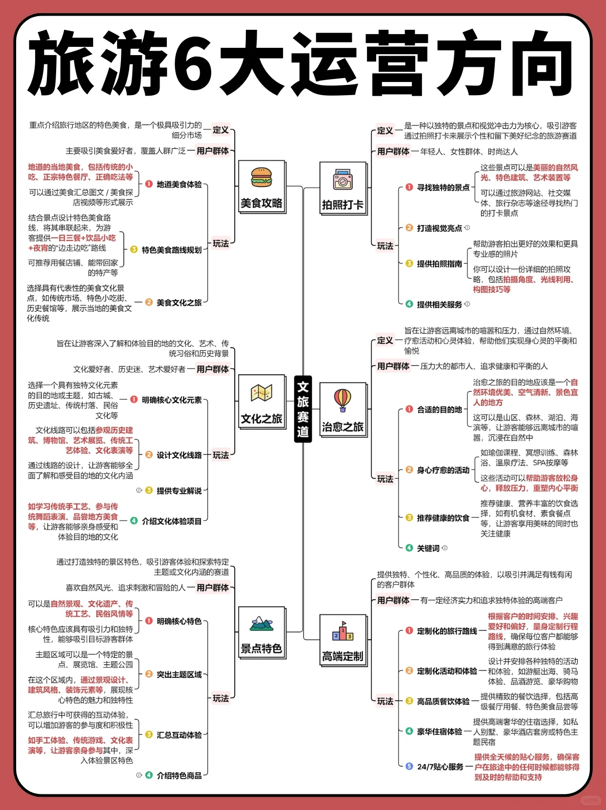 旅游业最近蓬勃发展吗许多旅行社开始尝试在网上吸引客户,创建矩阵账户,并问我该怎么办 如何开始编号 如何定位 - 我作为自媒体客户在一家领先的MCN组织工作了6年,陪伴了500多个客户,并取得了良好的绩效提升要想在某个垂直领域准确地抓住客户,就必须在细分赛道中树立个性并获得发言权,才能实现卓越 - 今天,我将与大家分享制作旅游账号的6个主流细分赛道,以及如何运营,帮助大家了解如何更好地打造文旅IP - 照片签到:利用景区独特的美景和独特的签到点,通过分享照片来吸引用户增加平台曝光度和用户互动 · 美食攻略:重点推介当地特色美食,结合美食文化和旅游体验,吸引食客➕ 旅游爱好者 · 治愈之旅:主题是放松身心,缓解压力,提供瑜伽、温泉、SPA等放松体验,吸引追求健康生活方式的用户 · 文化之旅:深入挖掘当地文化遗产,推广传统文化和历史故事,提供文化体验和教育旅游,吸引对文化感兴趣的用户 · 景点特色:突出景区独特的项目和活动,如主题公园、表演表演等,吸引家庭、旅游团和活动爱好者 · 高端定制:针对有特殊需求和追求独特体验的高端客户群体,提供个性化、豪华的旅行体验,满足他们对优质服务和特殊需求的追求