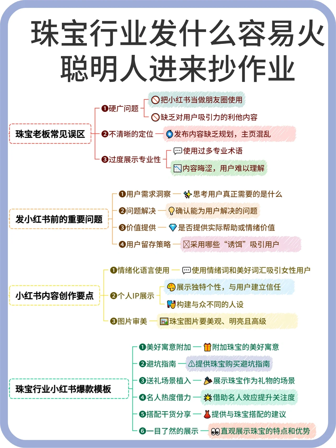 常见误解 ? 直接硬广告:这种方式无法理解人性,缺乏互动和利他主义的内容,难以吸引用户。 ? 定位不明确:未计划的内容发布会导致主页混乱,缺乏明确的传播方向。 ? 过度使用专业术语:尽管专业术语可以显示专业性,但过度使用可能会使内容晦涩难懂,使用户难以接受。 发布前需要考虑的问题 ? 用户真正需要考虑的是什么 ? 您可以为用户解决哪些问题 ? 你能提供什么实际或情感价值 ? 应该使用什么样的“诱饵”来留住用户 创建内容的注意事项 ? ? 倾听女性用户:小红书用户以女性为主,可以在内容中使用更多的情感词汇来增加亲和力。 ? 个人IP植入:展示个人特点,区别于同龄人,建立信任感。 高品质的图像:确保珠宝图像美观、明亮、有奢华感,满足用户审美。 四⃣ 珠宝行业小红书热销模板 ? 赋予美丽的意义:珠宝作为礼物,赋予它特殊的意义和情感价值。 ? 避免陷阱:教用户如何辨别珠宝的真伪,避免购买时的常见错误。 ? 植入送礼场景:展示不同送礼场景下珠宝的搭配与选择。 ? 把握名人热度:通过链接名人或热门事件,增加内容的关注度。 ? 搭配干货贴纸:分享珠宝搭配技巧,并提供实用信息。 ? 一目了然:直接清晰地显示产品,让用户一目了然。 ? 这些策略将帮助您的内容引起关注,为您的珠宝业务带来更多流量和潜在客户!