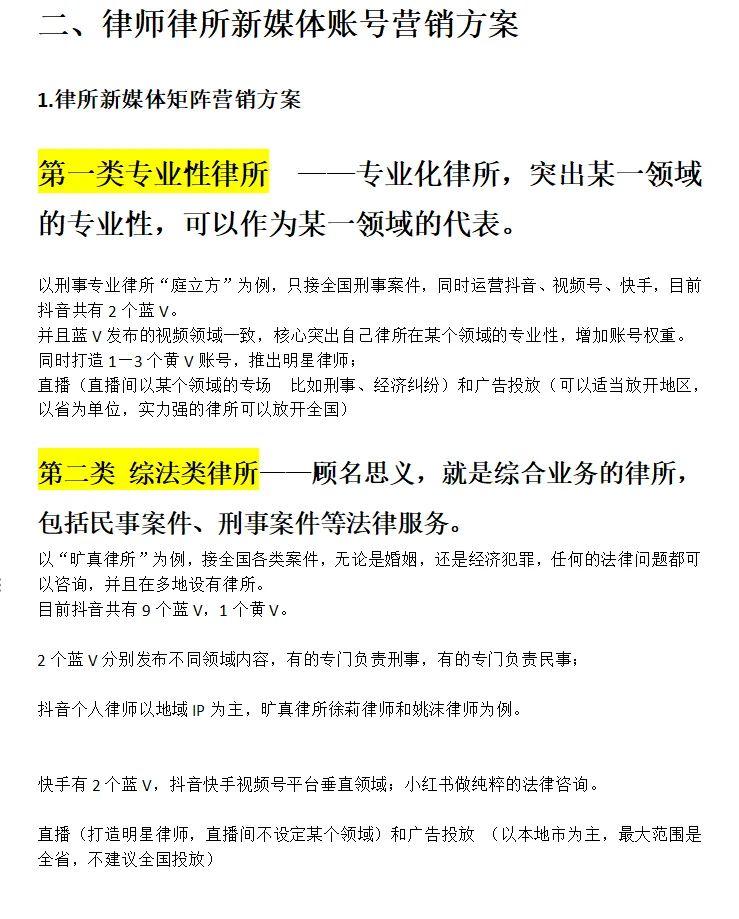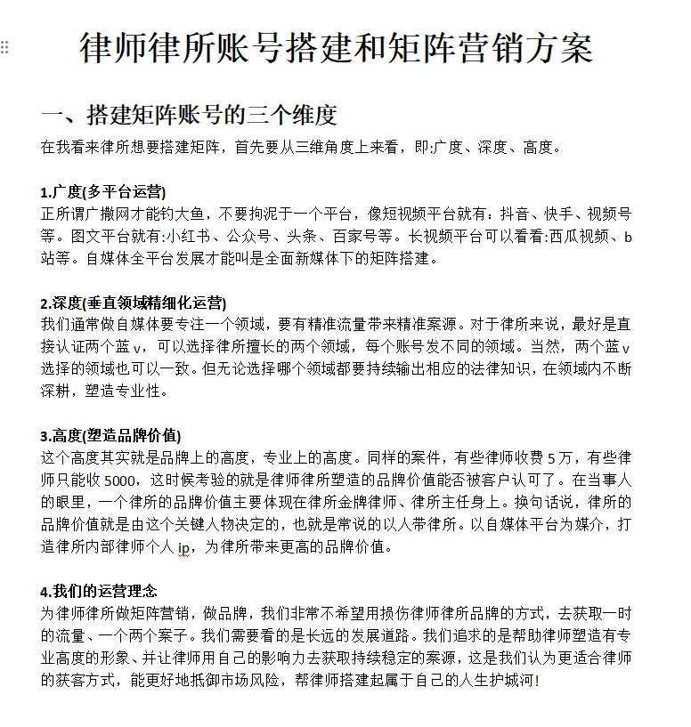 在我看来,如果一家律师事务所想要构建一个矩阵,首先必须从三维的角度来看待,即广度、深度和高度。 1。广度(多平台操作) 2。深度(垂直字段中的精细操作) 3。身高(塑造品牌价值) 二、律师事务所新媒体账号营销计划 第一类专业律师事务所——专业化律师事务所,突出某一领域的专业性,可以作为某一领域代表。 第二类综合性律师事务所——顾名思义,是一家为民事和刑事案件提供法律服务的综合型律师事务所。 第三类律师——不是与律师事务所打包,而是建立在自己的个人知识产权之上。
