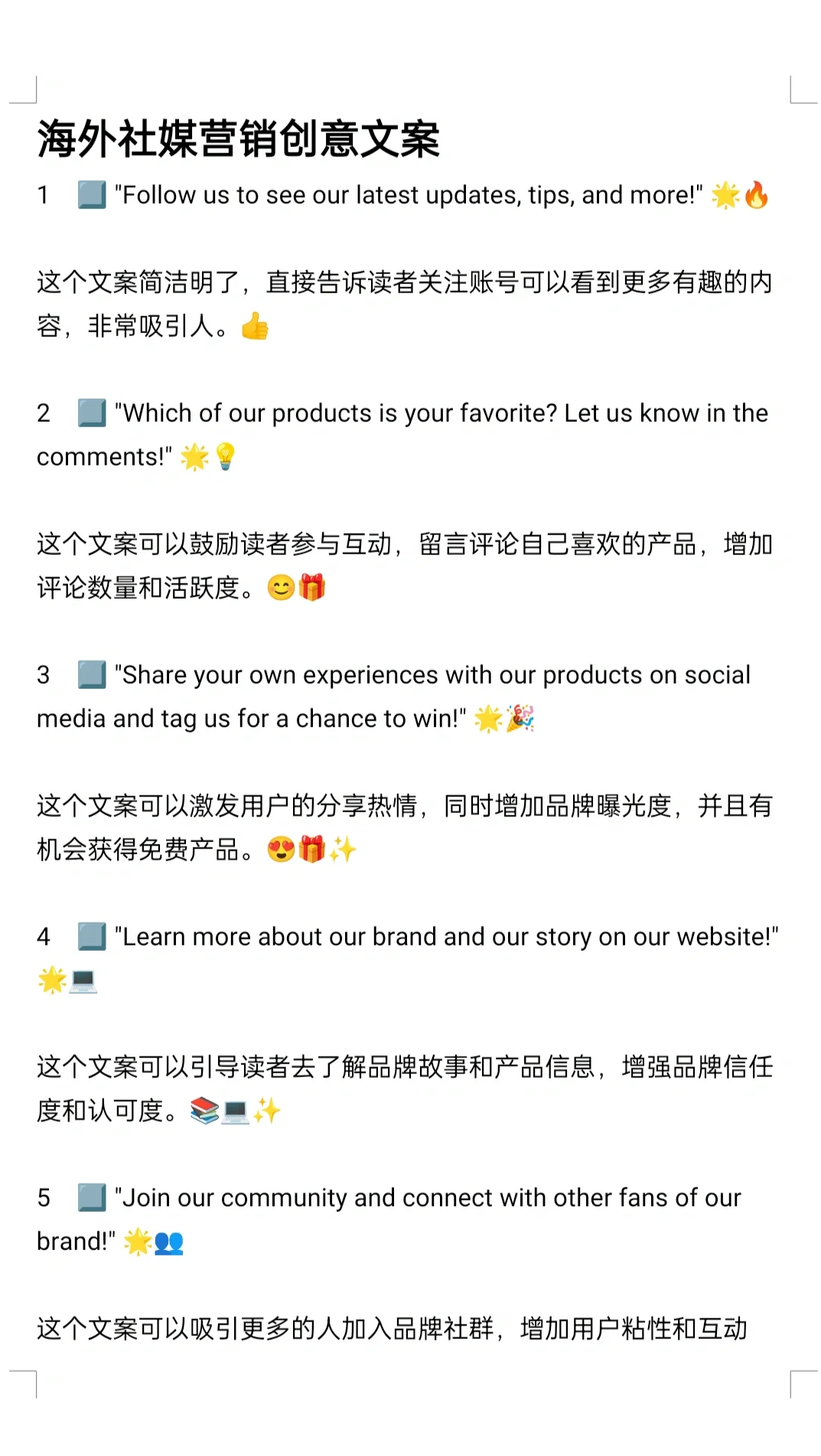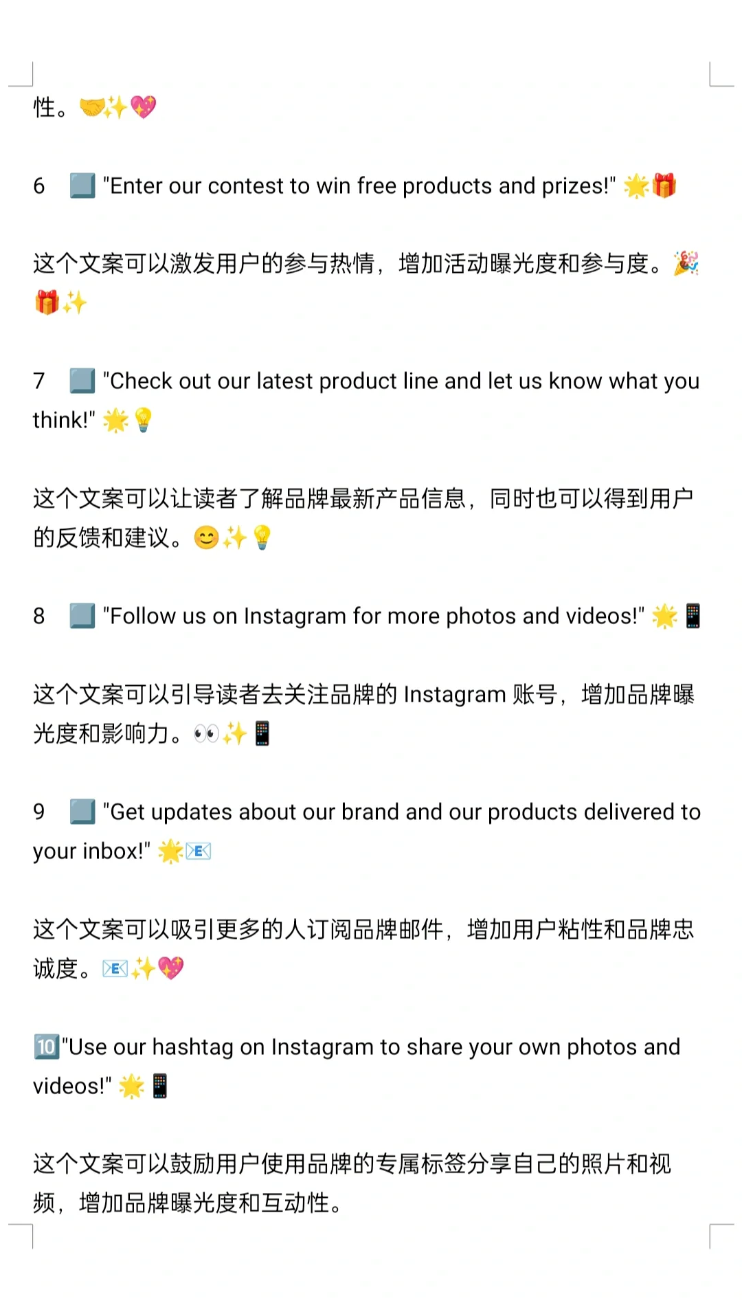 这篇文章简明扼要,直接告诉读者关注一个账号可以获得更多有趣的内容,非常有吸引力。 “你最喜欢我们的哪种产品请在评论中告诉我们!” 这个副本可以鼓励读者参与互动,对他们喜欢的产品留下评论,增加评论和活动的数量。 “在社交媒体上分享您对我们产品的亲身体验,并标记我们以获得获胜的机会!” 这种复制可以激发用户的分享热情,增加品牌曝光率,并有机会获得免费产品。 “在我们的网站上了解更多关于我们的品牌和故事!” 这本书可以引导读者了解品牌故事和产品信息,增强品牌的信任和认可度。 “加入我们的社区,与我们品牌的其他粉丝建立联系!” 这种复制可以吸引更多的人加入品牌社区,增加用户粘性和互动性。 “参加我们的比赛,赢取免费产品和奖品!” 这个副本可以激发用户的参与热情,增加活动曝光率和参与度。 “看看我们最新的产品线,让我们知道你的想法!” 此副本可以帮助读者了解该品牌的最新产品信息,并接收用户的反馈和建议。 “在Instagram上关注我们,获取更多照片和视频!” 此文案可以引导读者关注该品牌的Instagram账号,增加品牌曝光度和影响力。 “将有关我们品牌和产品的最新信息发送到您的收件箱!” 这个副本可以吸引更多的人订阅品牌电子邮件,增加用户粘性和品牌忠诚度。 ? “在Instagram上使用我们的标签来分享你自己的照片和视频!” 这种复制可以鼓励用户使用品牌专属标签分享他们的照片和视频,增加品牌曝光率和互动性。