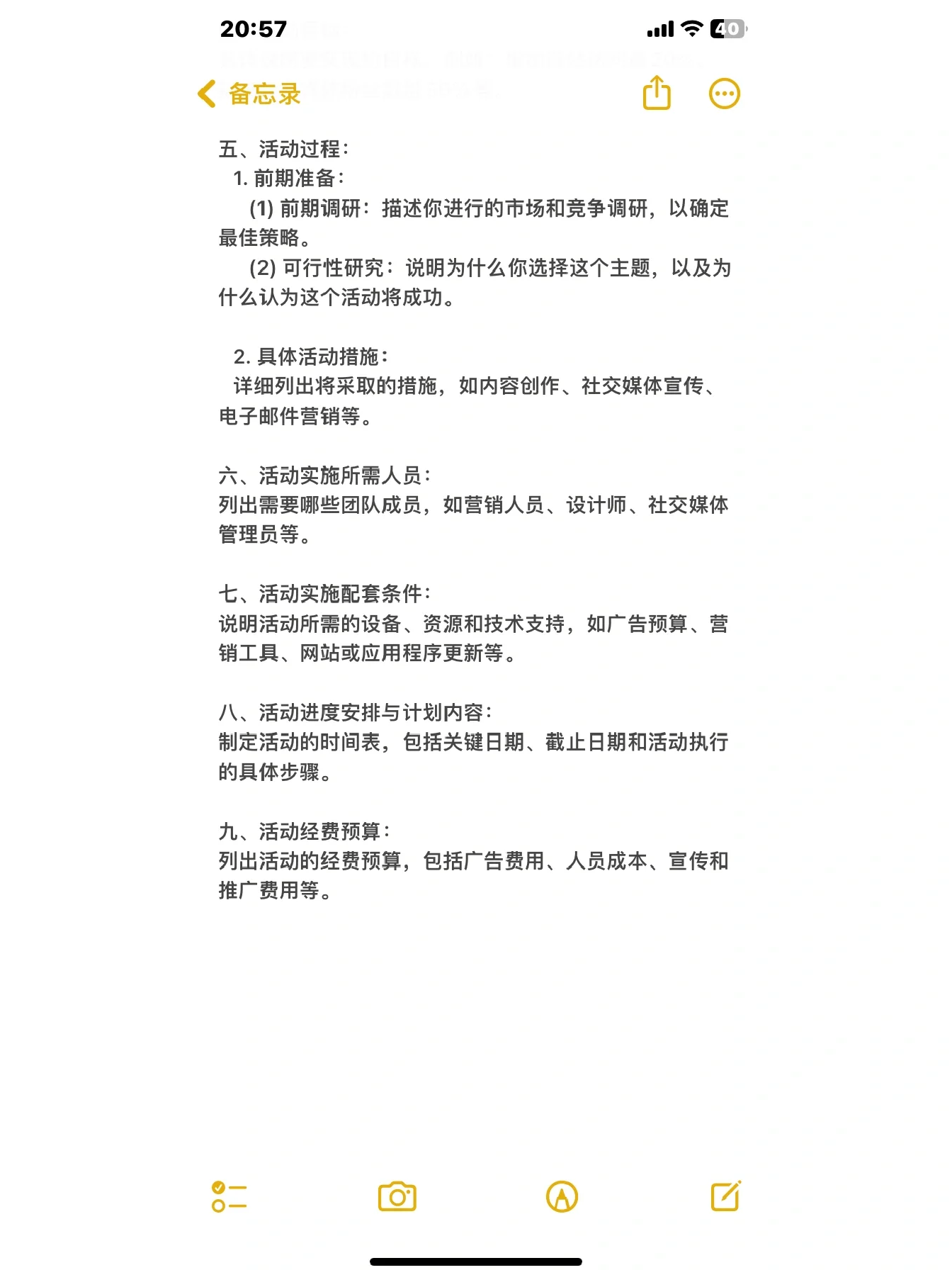 新媒体营销计划 1、 活动主题 2、 活动目的 3、 事件背景 4、 活动目标 5、 活动流程 1.前期准备 (1) 初步研究 (2) 可行性研究 2.具体活动措施 6、 活动实施所需人员 7、 活动实施的支持条件 8、 活动时间表和计划内容 9、 活动预算