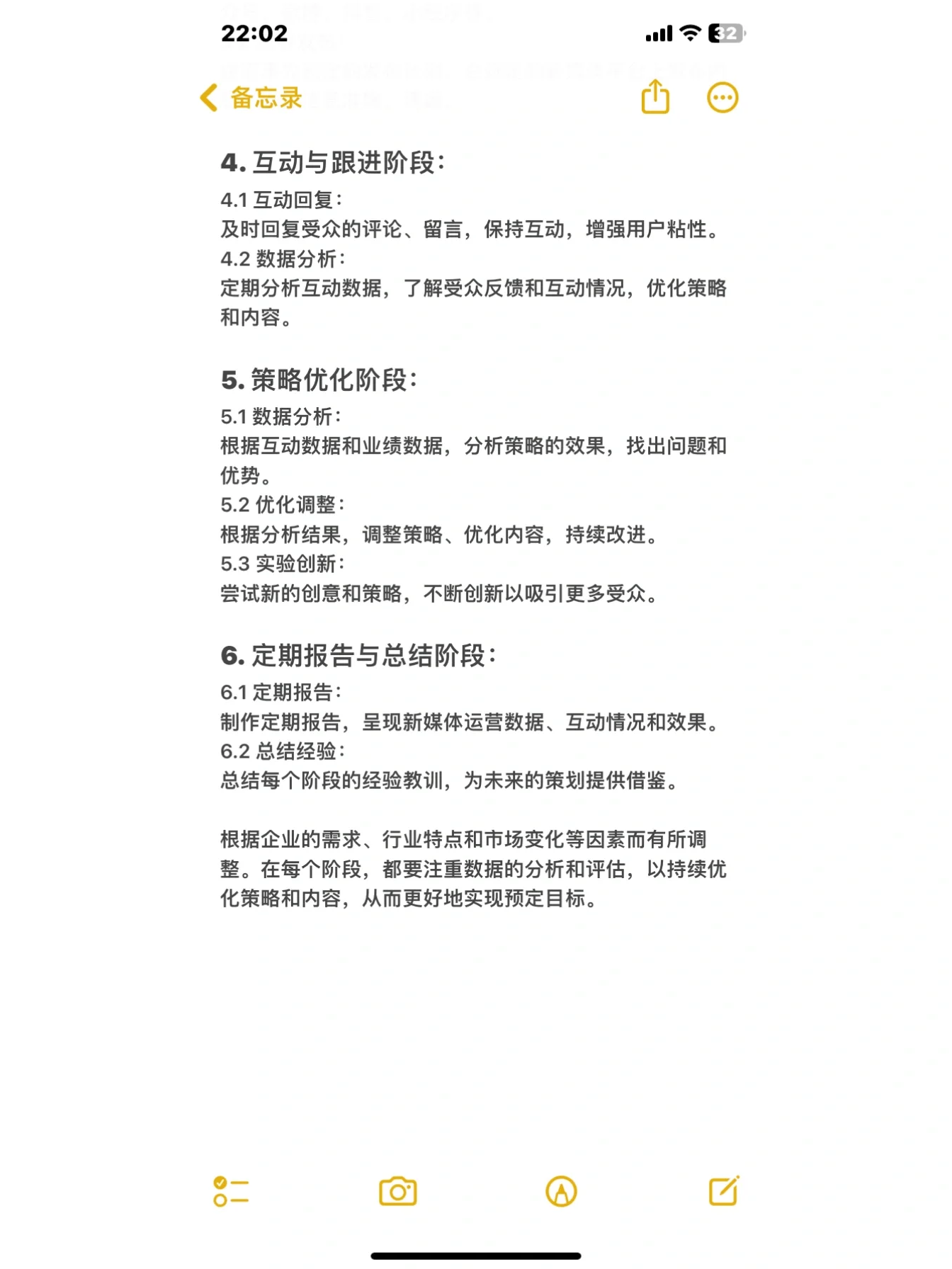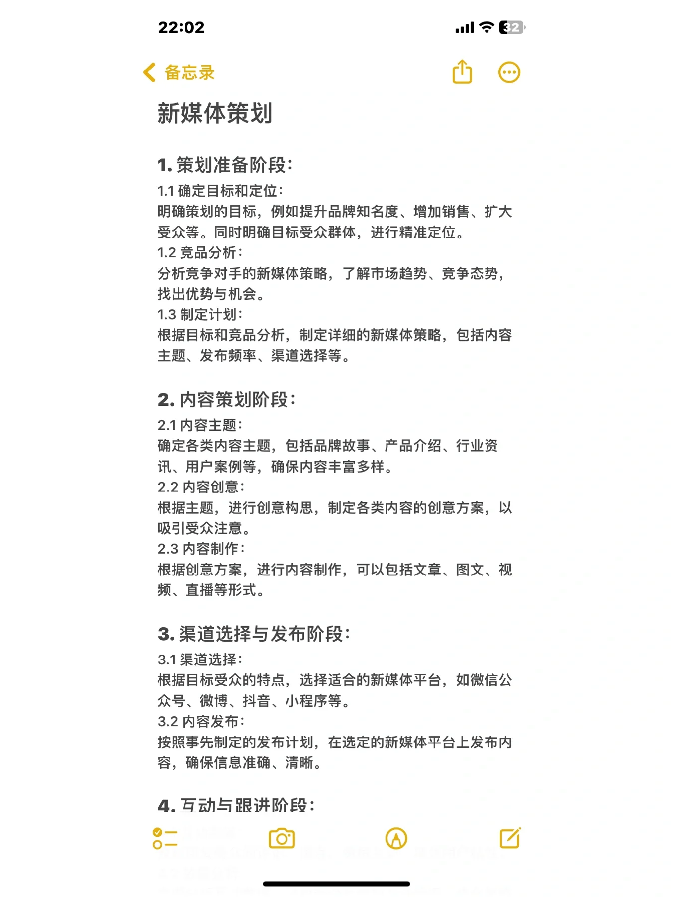 新媒体规划是将数字媒体平台与内容战略相结合,以实现特定商业目标的过程。 1.目标设定和受众分析: 在开始任何新媒体规划之前,你首先需要明确你的目标。这可能包括提高品牌知名度、增加产品销售和社区建设。同时,了解目标受众至关重要,因为这有助于您更好地定位内容和渠道。 2.竞争分析: 研究竞争对手在新媒体上的表现,分析他们的内容、互动方式和观众反应。这有助于您确定自己的优势和创新机会。 3.内容战略发展: 根据目标受众和竞争对手的分析,制定详细的内容策略。确定内容的主题、风格、频率和格式,以确保其具有吸引力、价值并与目标受众保持一致。 4.频道选择和设置: 选择适合您目标受众的新媒体渠道,如微信、微博、抖音、Instagram等。在所选渠道上创建或优化账户,并确保配置头像、封面、联系方式等相关信息。 5.内容创作和发布: 根据内容策略创建多样化的内容,如文章、图形、视频、直播等。注意保持内容的一致性和质量。根据发布计划定期发布内容,以确保内容的稳定供应。 6.社区互动与管理: 与观众互动是建立社区和提高用户忠诚度的关键。回复评论和留言,积极参与讨论,建立积极的互动氛围。同时,管理社区中的内容,过滤掉有害信息,确保社区的健康发展。 7.数据分析与优化: 定期分析新媒体活动的数据,如互动量、关注度增长、转化率等。根据数据反馈,优化策略和内容,保持持续改进和创新。 8.跟踪和报告: 定期编写报告,展示新媒体活动的成就、效果和趋势。这有助于您监控项目进度,向上级报告,并为未来的决策提供依据。 9.适应市场变化: 新媒体环境在不断变化,趋势和平台可能会有所不同。及时监测市场变化,根据需要进行调整和创新,以适应新的挑战和机遇。 10.持续学习和改进: 新媒体领域发展迅速,保持学习态度非常重要。定期关注行业新闻,参与培训,不断积累知识和经验,为新媒体策划带来更多创意和方法。