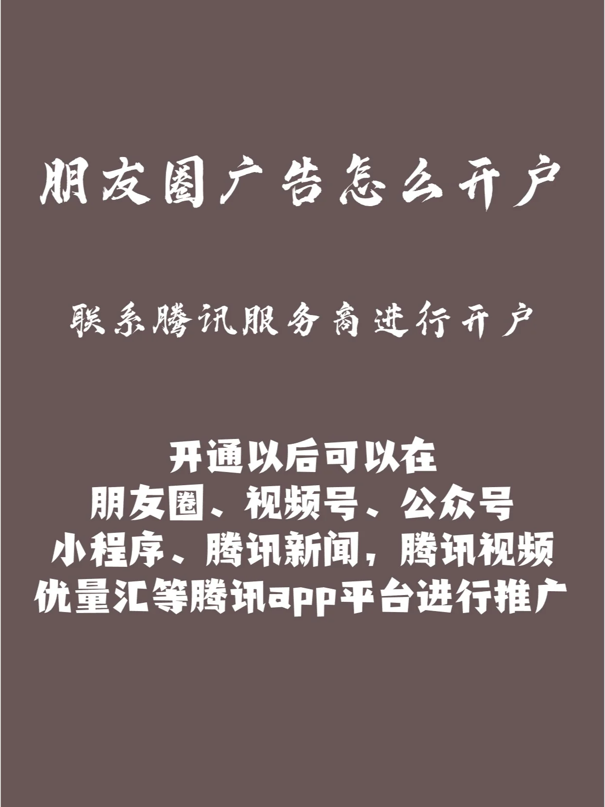 如何开通朋友圈广告账号 您可以直接联系腾讯服务提供商开立账户 最低充值3000元 根据曝光量收费[烟花R][烟花R][烟花R] 开放后可以启动的平台包括: 微信朋友圈、视频号、公众号 小程序、腾讯新闻、腾讯视频 在优量汇[RoseR][RoseR][Rose R]等腾讯应用平台推广 打开一个巨大的广告需要什么信息 营业执照+行业资质+法人身份信息 如果你有任何问题,可以在评论区留言