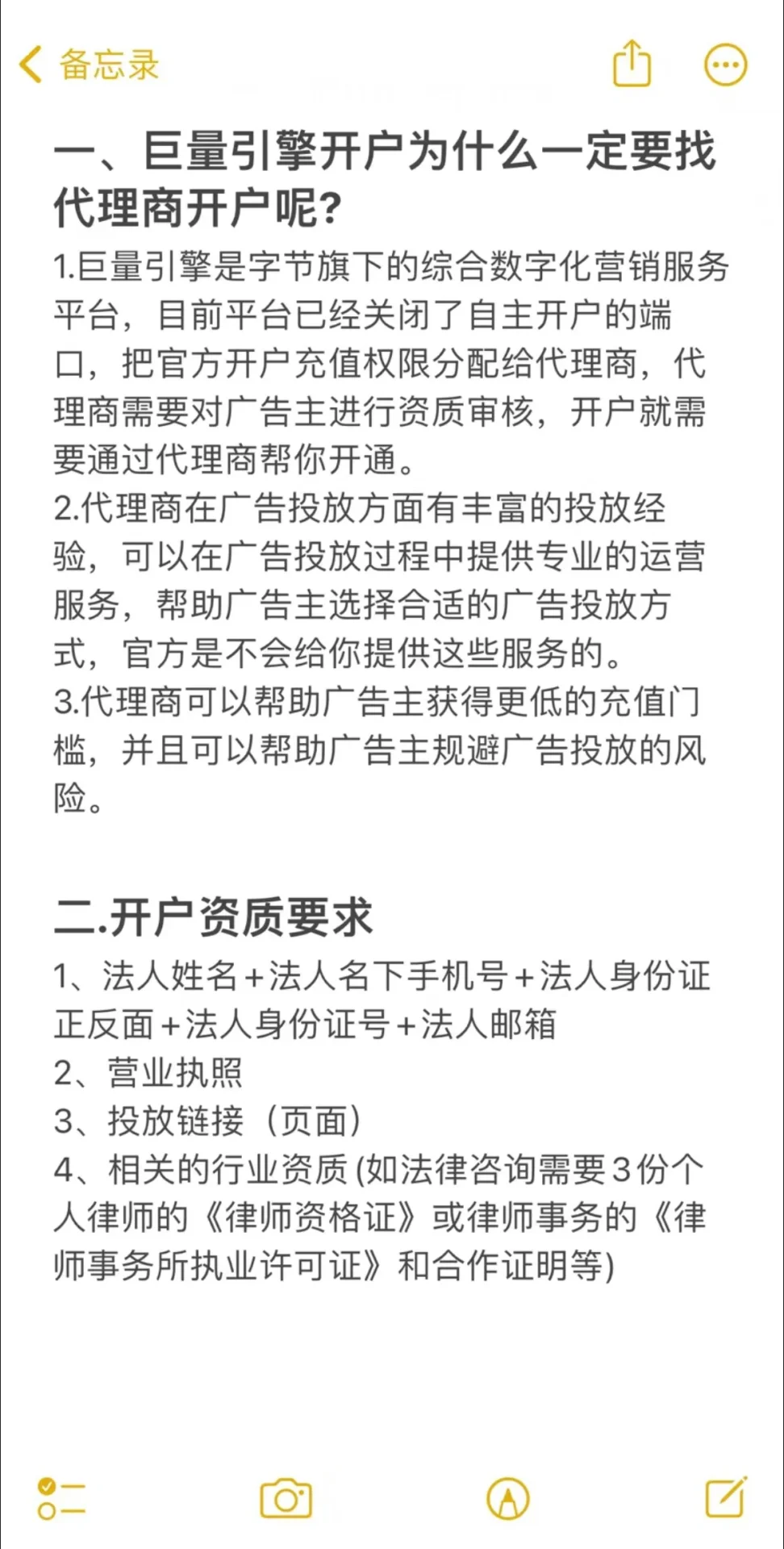 抖音广告如何开户 1、 抖音广告开户流程 1.准备好行业资质和信息,咨询专业的抖音广告机构或找公众号。 (1) 官方:仅负责协助广告主开户,不提供任何开户指导。需要1000元的服务费,预充值费不低于1万元。不负责任何后期广告运营。(2) 代理商:随着互联网营销的发展,大广告、大千川、星图合作伙伴、总代理商都有运营团队,可以更好地为广告商家服务。 2.确定广告资源、推广产品和广告计费模式 3.资格确认后,即可付款并提交开户审核 4.提供行业相关资质,开设广告账户 以上就是抖音广告的开户流程。重点是经营范围需要与营业执照一致,否则会影响后期的广告宣传。 2、 抖音广告开户信息 此外,开设抖音广告账户还需要以下信息: 1.开户信息 对营业执照、法定代表人身份证明文件、产品详情页、登陆页等材料进行开户审核。 2.不同行业提供不同的资质证书,具体信息可咨询代理商