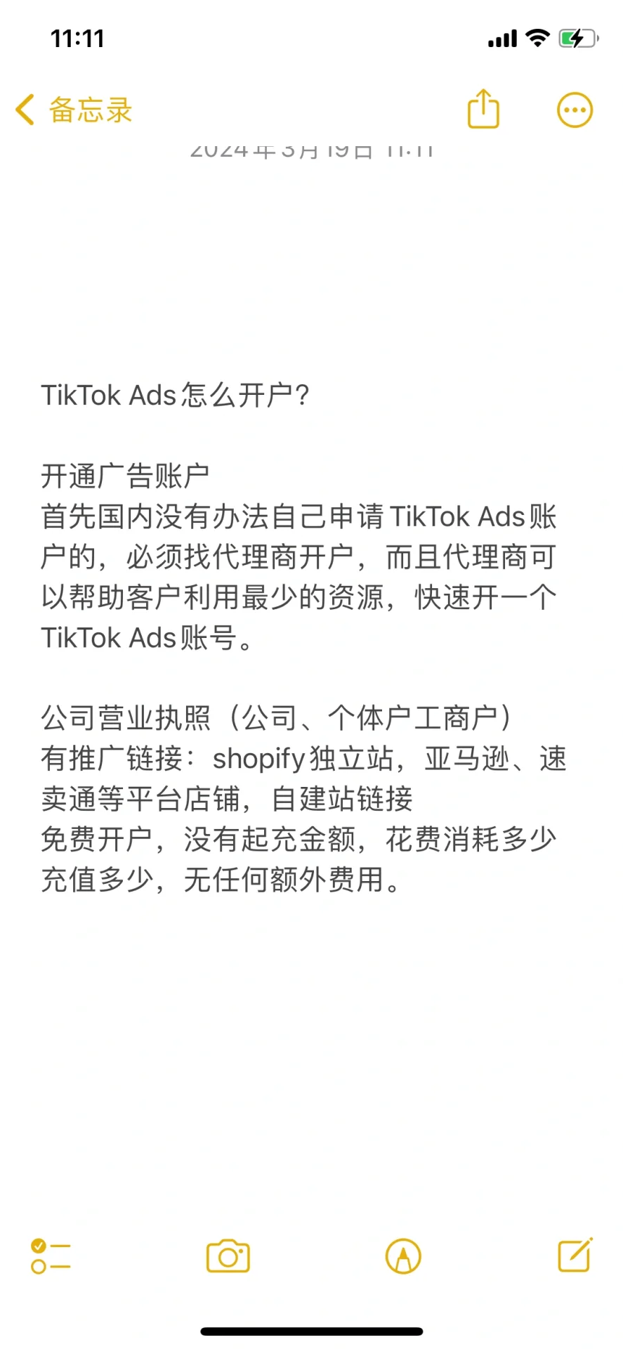 TikTok广告是如何开户的 开设广告账户 首先,如果你无法在中国自行申请TikTok广告账户,你必须找到代理人来开立账户,代理人可以用最少的资源帮助客户快速开立TikTokAds账户。 公司营业执照(适用于公司和个体工商户) 有推广链接:Shopify独立网站、亚马逊、速卖通等平台店铺、自建网站链接 免费开户,无需其他手续费、税点等,消费多少充值多少,无需任何额外费用。