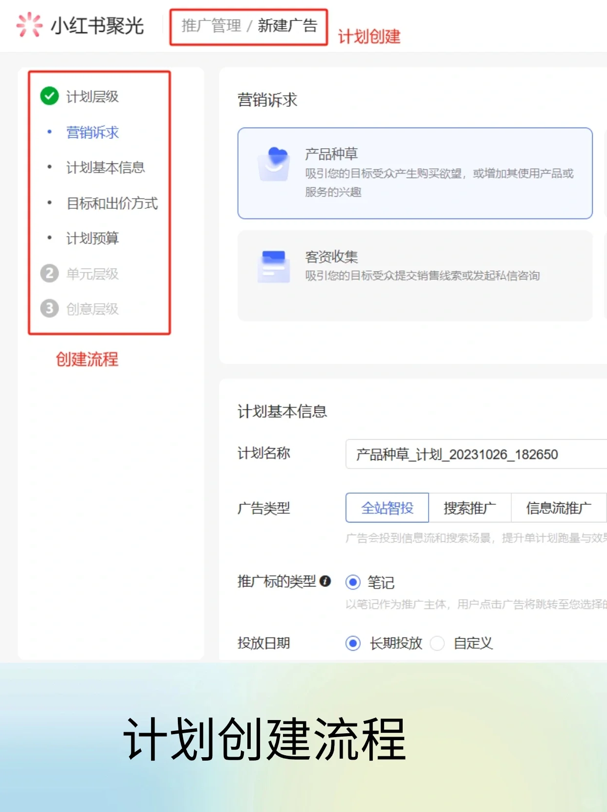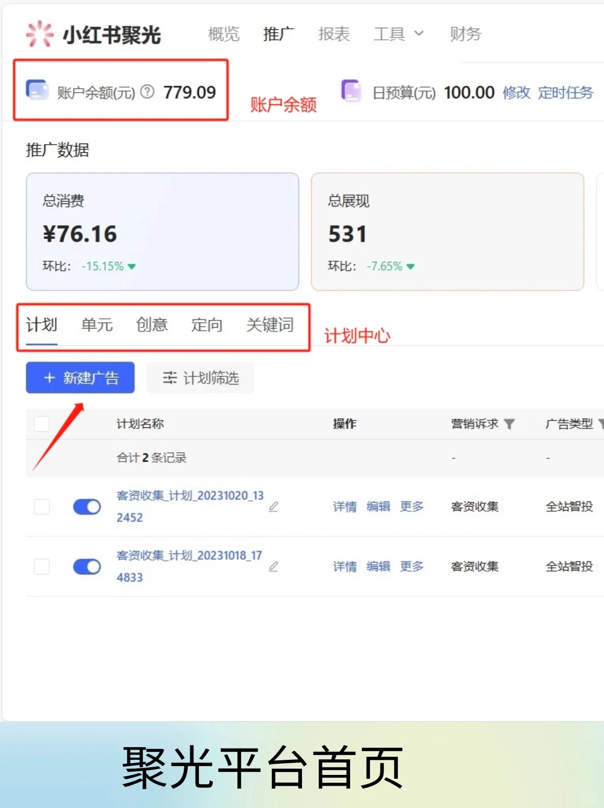 在聚光灯平台上开户和创建计划的过程! - 1、 小红书聚光灯平台开户流程 ? 第一步:企业专业号认证 登录小红书手机客户端,点击“个人中心-创建中心-更多服务-专业号中心”,按照步骤进行企业专业号认证。请注意,企业专业号码是必需的,但不是个人专业号码。个体工商户还可以认证企业专业号! ? 步骤2:激活聚光灯平台 小红书聚光灯平台支持向服务提供商和官方客服开户,两者基本相同,不产生任何开户费。服务提供商2K,官方客服5K,有些不同。 ? 步骤3:改进其他事项 例如,张贴促销说明、创建计划和激活“已读/未读”功能(一个非常实用的功能)。 至此,聚光灯平台已经成功开通了一个账号。你现在可以创建一个计划并开始做广告。广告使用“私人组件”功能需要花费1K,可以在小红书网络版的专业账号中自行设置。 - 2、 制定第一个计划 ? 计划创建流程:发布笔记-创建计划-设置单元-创意编辑-创意评审-计划成功发布。 以下是每个章节的要点摘要: 一️⃣ 选择营销需求:产品播种、抢占市场、产品销售、客户信息收集(常用)、直播推广 二️⃣ 计划基本信息设置:计划名称、类型、广告时段、竞价方式 三️⃣ 单位设置:选择物料、目标设置、竞价设置 四️⃣ 创意设置:动态创意设置 五️⃣ 所有设置完成后,计划将进入“审核状态”,一旦批准,计划将开始启动。 - 在小红书聚光灯平台上,我写了很多笔记,特别是针对各个行业的广告数据和技术。这些都是我实际的广告经验,有很大的参考价值。如果你正在学习或做广告,你可以翻阅它们。 关于在聚光灯平台上开户,如果你想一想或稍后被问到,请回来回答你可能有的任何问题!