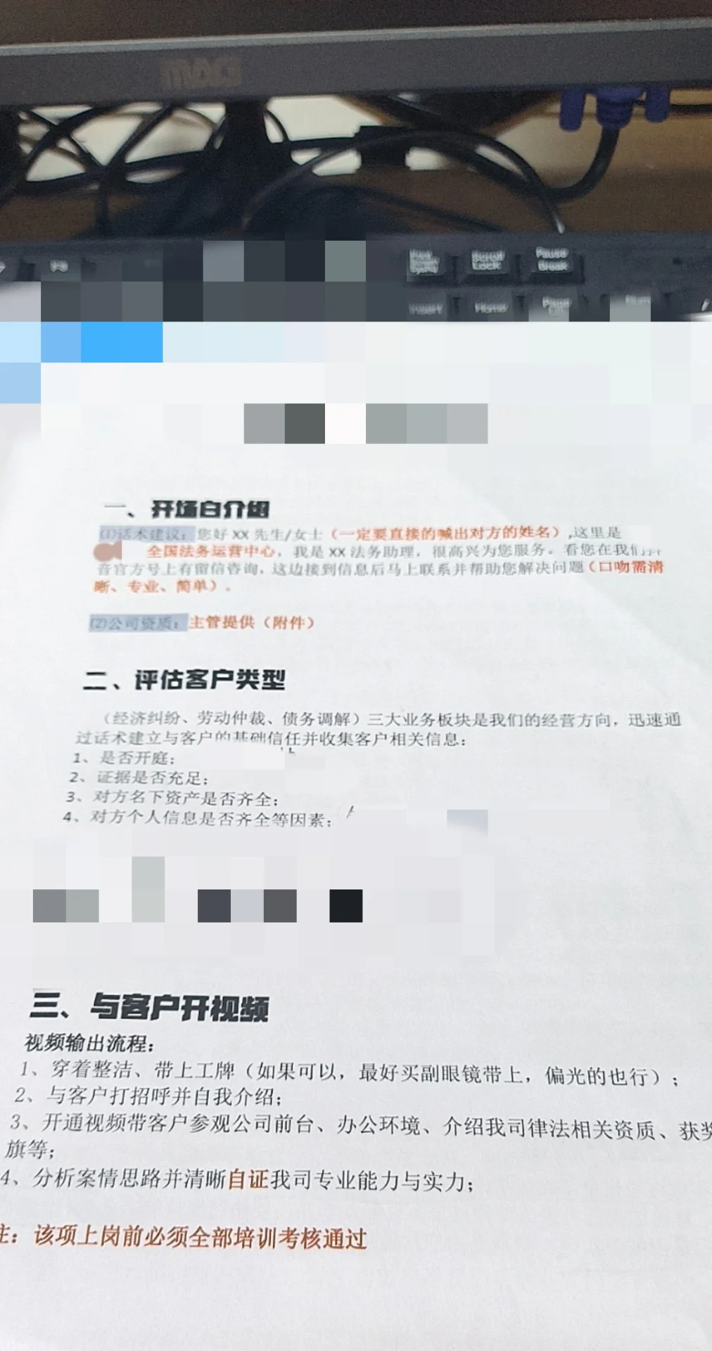 正如标题所示,这是我在这个职位和销售方面的第一次尝试。我觉得我不是很喜欢它[笑着哭着R] 第二天早上,我们拿到了剧本和流程文件,以便熟悉。午休后,我们开了一个培训会,大致介绍了流程和一些注意事项,然后说我们有多正式和合法 [失望的R]然后在下午,我玩了企业微信和飞宇,学习如何打电话。我试着给几个老客户打电话(信号不是很好,电话断断续续,有的一听到就挂了) 叹息R 感觉有点不确定,我在XHS上搜索了一下,发现那些落入陷阱的伙伴提到的流程和公司都很相似。他们说他们有很多合作的律师事务所,好像他们也在经营自己的律师事务所(我不明白为什么他们还需要开一家咨询服务公司) 这类早期服务包括查询案件细节、添加客户微信、收集客户和债务人的信息和证据。最后,如果合适,将成立一个小组,其中包括律师和法律顾问。前端会收取咨询费,无需担心后续诉讼(根据案件金额,最低也要500元) 我现在有点犹豫明天是否继续[哭R][哭R],底薪为4k➕ 休息一天➕ 包装中餐(但他们有业绩要求,开会时夸大说工资有多高。工作一两个月后,如果工资不超过1万元,经理会来协商)