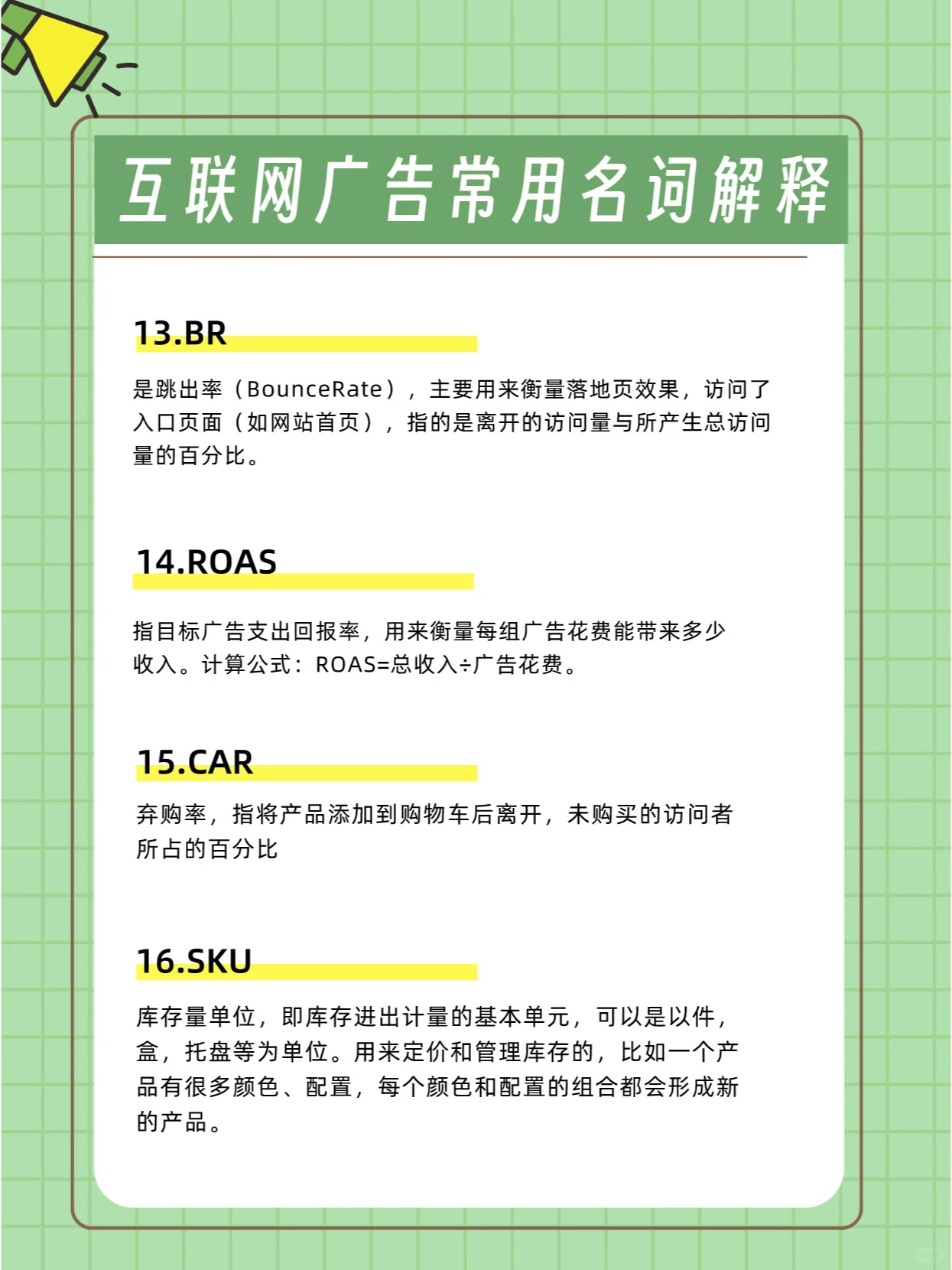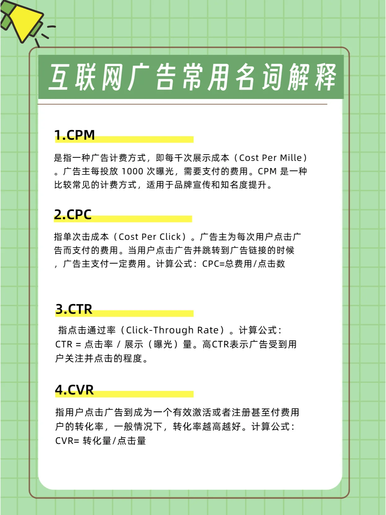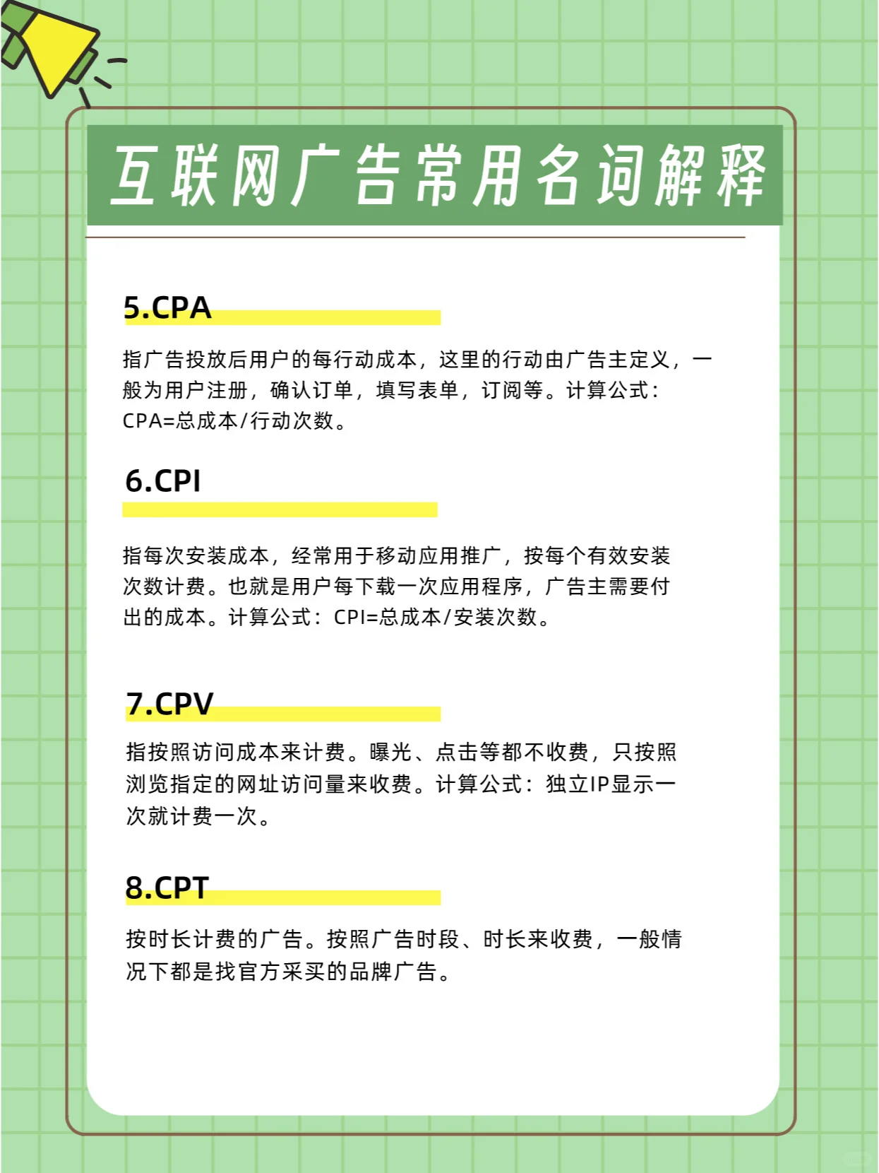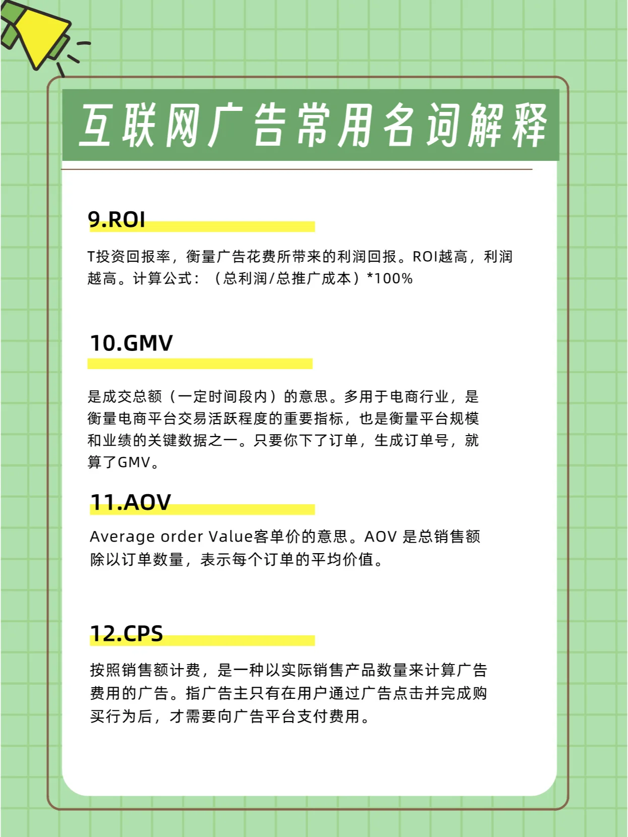【建议收藏】 .CPM 它指的是一种广告计费方法,即每次显示的成本(CostPerMill)。广告商每1000次曝光需要支付的费用。CPM是一种常见的计费方式,适用于品牌推广和提高知名度。 .CPC 指每次单击的成本。广告商为每个用户点击广告而支付的费用。当用户点击广告并重定向到广告链接时,广告商支付一定的费用。计算公式:CPC=总成本/点击量 .CTR 点击率是指点击率。计算公式:CTR=点击率/显示(曝光)量。高CTR表示广告受到用户关注和点击的程度。 .CVR 从用户点击广告到成为有效激活、注册甚至付费用户的转换率。一般来说,转化率越高越好。计算公式:CVR=转化率/点击率 .CPA 投放广告后,用户每次行动的成本由广告商定义,通常包括用户注册、订单确认、填表、订阅等。计算公式:CPA=总成本/行动次数。 .CPI 是指每次安装的成本,通常用于移动应用程序的推广,根据每次有效的安装次数收费。也就是说,广告商每次用户下载应用程序时需要支付的成本。计算公式:CPI=总成本/安装数量。 .CPV 指基于访问成本的计费。曝光、点击等不收费,仅根据指定网站的访问次数收费。计算公式:独立IP显示时收取一次费用。 .CPT 按时计费的广告。收费是基于广告时段和持续时间,通常使用从官方渠道购买的品牌广告。 投资回报率 T投资回报率,衡量广告费用带来的利润回报。R01越高,利润就越高。计算公式:(总利润/总推广成本)*100% .GMV 是指(在一定时间内)交易的总金额。常用于电子商务行业,是衡量电子商务平台交易活跃度的重要指标,也是衡量平台规模和业绩的关键数据之一。只要你下了订单并生成了订单号,它就算作GMV。 .A0V Average orderValue的含义是每个客户的单价。AOV是总销售额除以订单数量,代表每个订单的平均值。 .CPS 基于销售收入计费是一种根据实际销售的产品数量计算广告成本的广告。广告主只需要在用户点击广告并完成购买行为后,向广告平台支付费用。