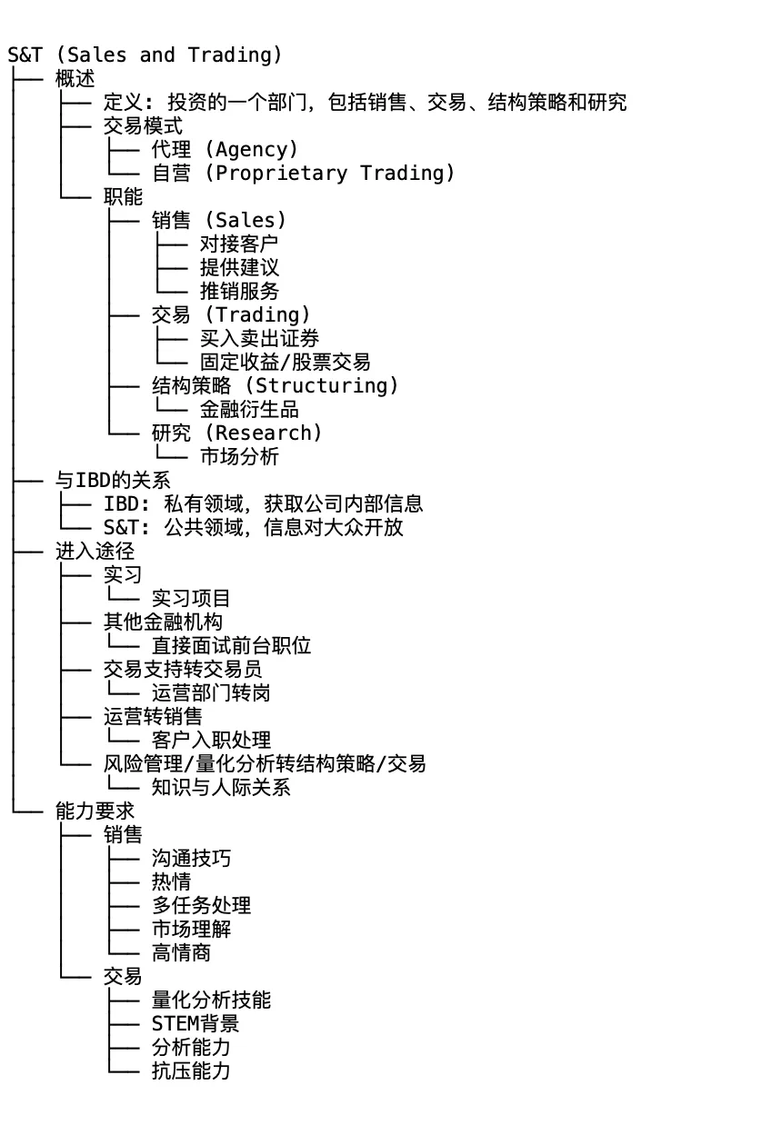 S&T(销售和交易)。 科技部是一些投资银行的一个部门,其职能可分为销售、交易、结构和研究。科技的交易模式可以是代理、自营交易,也可以是两者的结合。 销售:主要负责与客户(如私募股权PE、对冲基金等)的联络,提供咨询和促销服务。 交易:直接参与公共股本的买卖(如你所知)。 结构:负责协助处理复杂的衍生品。 研究:提供市场分析和研究支持。 S&T和IBD。 在英国和美国的投资银行中,IBD和S&T通常是分开的,主要是由于信息隐私和透明度的差异。 IBD:属于私人部门,提供对公司内部信息的访问,这些信息不向公众公开。 科技:属于公众,其信息(如年报、SEC文件等)向公众开放。并接受严格的监督。 进入科技的途径。 暑期实习:通常通过大二实习计划完成,然后在大三进行正式实习。 其他金融机构:在其他机构实习后,候选人将直接面试投资银行的前端职位。尽管机会有限,但求职者通常都有出色的实习经验。 贸易支持:从运营部门转移到交易员,因为贸易支持与交易保持日常联系,并提供展示技能的机会。 运营到销售:具有运营背景的销售人员可以帮助处理客户入职和其他运营事务,销售工作更注重人际关系。 风险管理或定量分析(Risk/Quant):拥有足够的知识水平,通过人际关系展示交易员的素质,但难度更大。 科技能力要求 出售: 需要出色的沟通技巧和热情。 多任务处理能力。 了解客户的投资习惯、市场趋势和资产配置。 高情商和良好的口才可以维持客户关系。 交易: 需要定量分析技能,优先选择具有STEM专业背景的候选人,尤其是那些数学能力强的候选人。 清晰的逻辑思维和分析能力,能够处理大量信息和数据。 能够承受压力,平衡交易中利润最大化和销售佣金之间的关系。