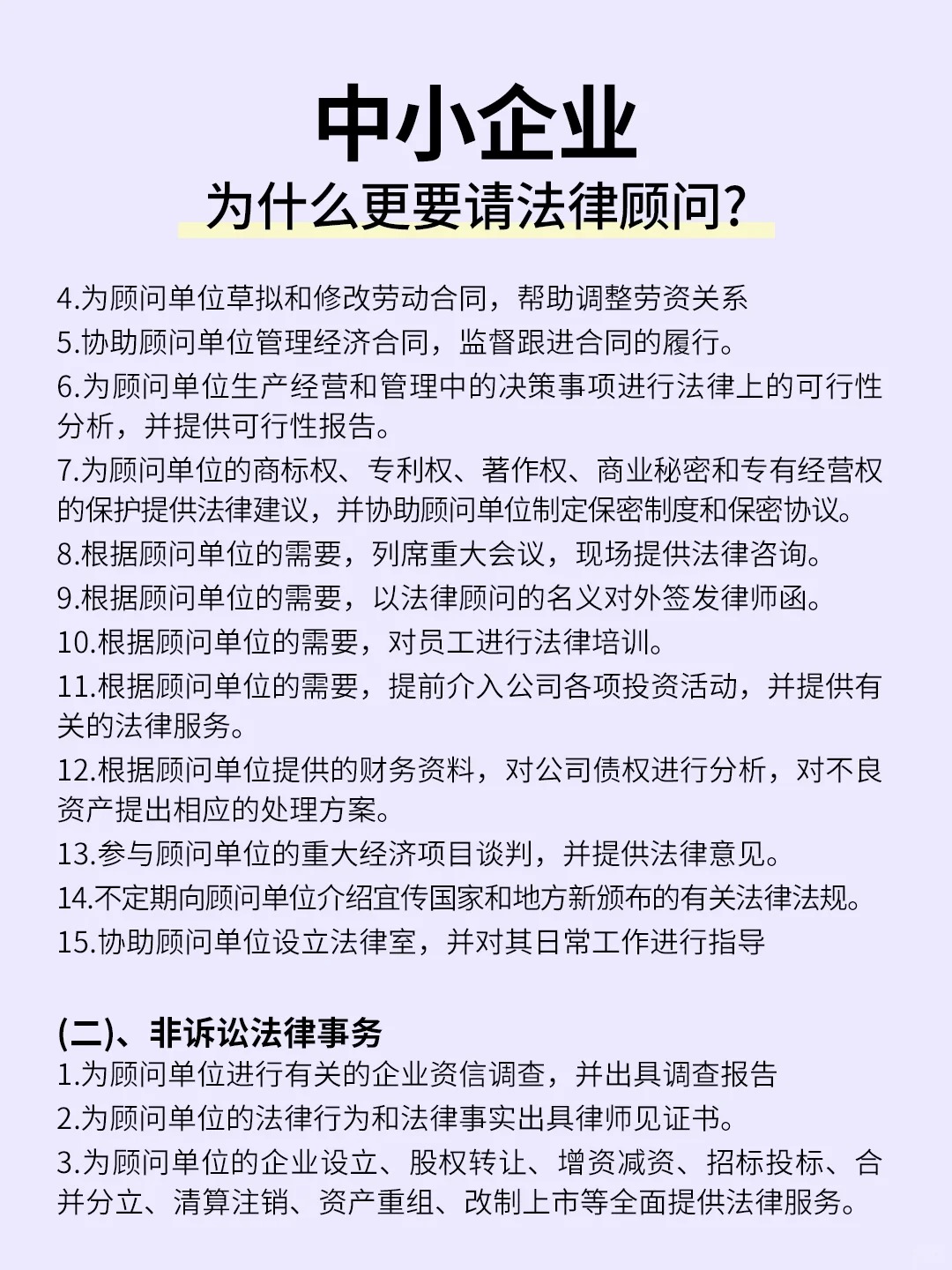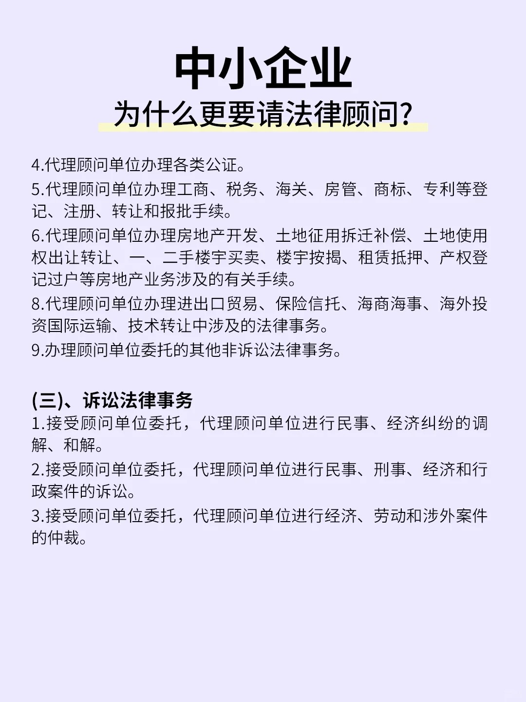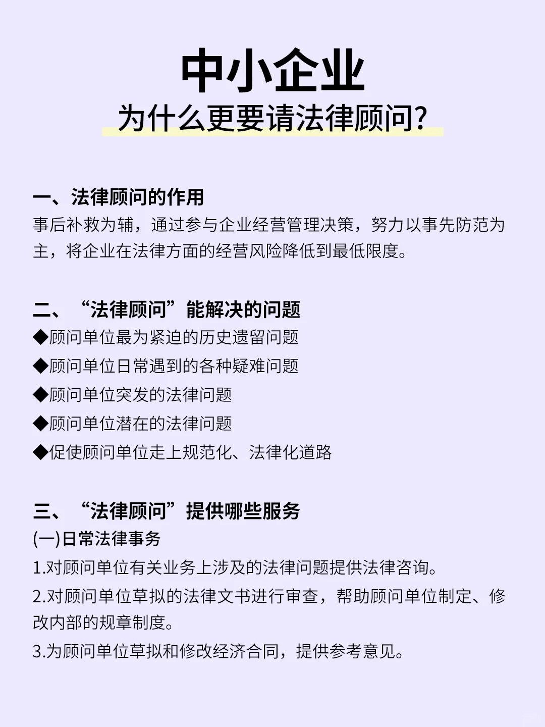 中小企业其实对于法律顾问的需求是比较大的,这是为什么呢?让我来告诉你 法律顾问的作用 事后补救为辅,通过参与企业经营管理决策,努力以事先防范为主,将企业在法律方面的经营风险降低到最低限度。 “法律顾问”能解决的问题顾问单位最为紧迫的历史遗留问题顾问单位日常遇到的各种疑难问题顾问单位突发的法律问题顾问单位潜在的法律问题 促使顾问单位走上规范化、法律化道路 “法律顾问”提供哪些服务 日常法律事务 对顾问单位有关业务上涉及的法律问题提供法律咨询。 对顾问单位草拟的法律文书进行审查,帮助顾问单位制定、修改内部的规章制度等 非诉讼法律事务 为顾问单位进行有关的企业资信调查,并出具调查报告 为顾问单位的法律行为和法律事实出具律师见证书等 诉讼法律事务 接受顾问单位委托,代理顾问单位进行民事、经济纠纷的调解、和解。 接受顾问单位委托,代理顾问单位进行民事、刑事、经济和行政案件的诉讼等 更多法律问题,可以和我一起沟通