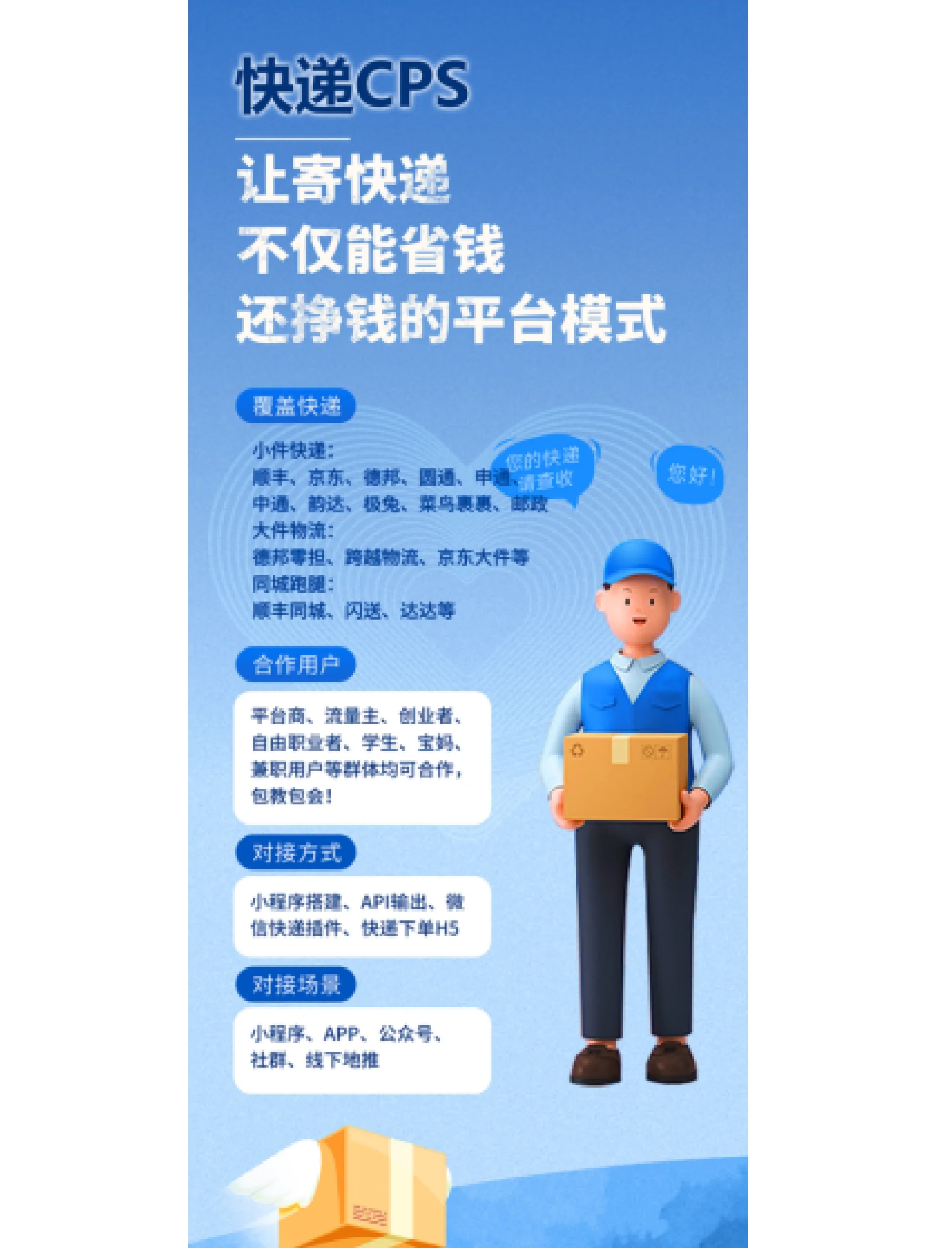 继外卖和电影票之后,快递CPS也开始流行起来。国内很多巨头都开始布局快递CPS,甚至新手月收入都在1万元以上。进入快递CPS已成为一种趋势。接下来,对这个项目进行分解和分析。 快龙智慧物流系统,集微信小程序注册、运营、开发为一体的一站式服务。我们致力于成为一家快递CPS服务提供商,并可以为我们的合作伙伴开发和构建您自己的专属快递CPS微信小程序。你的主体是你的品牌,从现在起,你可以通过发送自己的包裹来享受快递的成本价。更重要的是,我们将帮助您一起赚取快递CPS的红利。 通过快龙系统,我们可以构建自己的快递小程序 快递渠道覆盖范围: 顺丰速运、京东、德邦、圆通、申通、中通、韵达、极兔,以及大件物流、本地跑腿等资源。 感兴趣的信息
