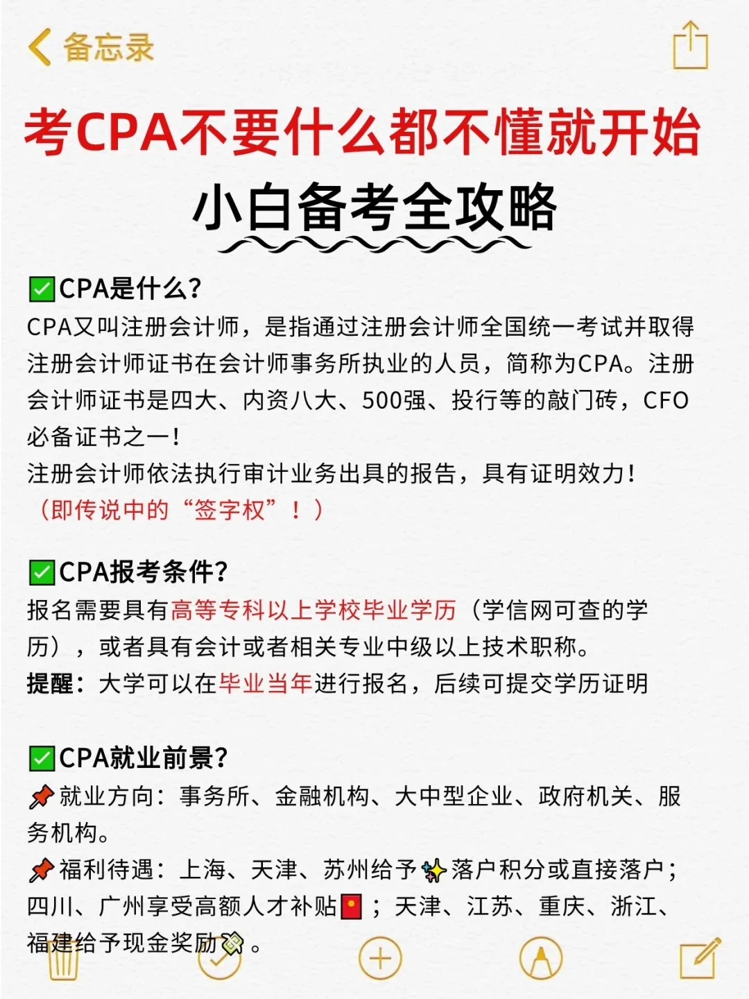 什么是注册会计师 注册会计师,又称注册会计师,是指通过国家注册会计师统一考试,取得注册会计师证书,在会计师事务所执业的人员,简称CPA。注册会计师(CPA)证书是成为四大公司之一、八大内资公司之一、500强公司和投资银行的关键。这也是首席财务官必备的证书! 注册会计师依法为执行审计业务出具的报告具有证明效力! (传说中的“签名权”!) - 注册会计师申请要求 注册需要职业学院或以上学历(可在中国学位和信息技术网站上查询),或会计或相关领域的中级或更高技术职称。 提醒:大学可以在毕业当年注册,并在未来提交学历证明 - 注册会计师就业前景 ? 就业方向:律师事务所、金融机构、大中型企业、政府机构、服务机构。 ? 福利待遇:上海、天津、苏州提供✨ 户口或直接户口积分;四川、广州享受高额人才补贴;天津、江苏、重庆、浙江和福建有现金奖励吗。 - 注册会计师考试要多少钱 注册会计师课程的注册费一般在60-90元之间,各省不同。 其他费用包括课本和课程(大额)。如果注册会计师有一定的困难,建议遵循专业的制度来提高效率和通过率。 - 注册会计师考试的科目是什么 专业考试科目:会计、审计、财务成本管理、公司战略与风险管理、经济法、税法。 专业阶段考试的申请人可以同时申请6门科目,也可以选择申请某些科目。 单科60分的及格分数要求在未来五年内通过6门科目,因为成绩采用滚动系统,超过五年的科目成绩将无效。 - 注册会计师有多难 注册会计师的难度仍然很高,需要认真对待。单个受试者的学习时间为200-300小时。如果你正在工作中准备考试,不要贪婪。根据你自己的学习能力,2-3门科目是理想的,只要你能稳定地通过考试。会计必须放在第一科目先打基础,其他科目要根据难度高低进行匹配。 -